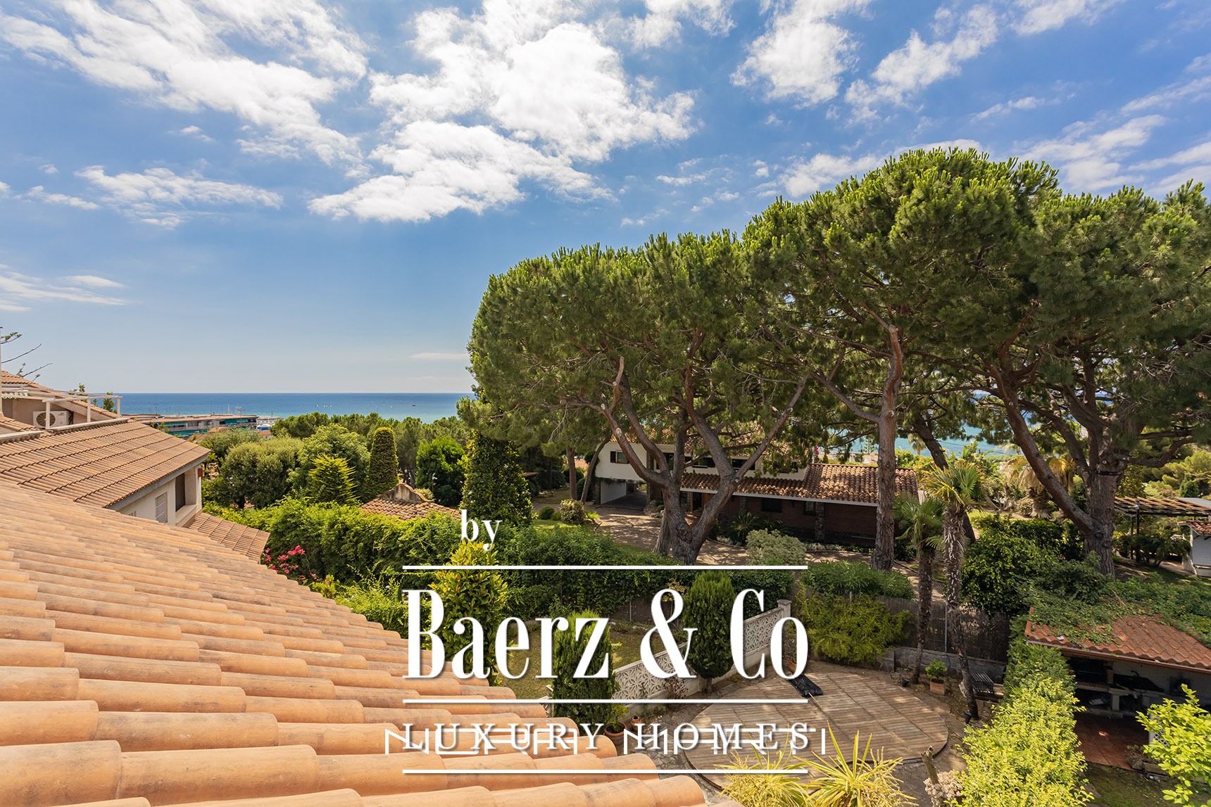Ascending to the third floor, a double room with fireplace opens onto a private 20 m² terrace overlooking the sea. The basement includes parking for three cars and a dedicated laundry room. Thoughtful features such as automatic blinds, windows with double air chamber, alarm system, split air conditioning, and radiator heating underscore the home’s practicality and ease.