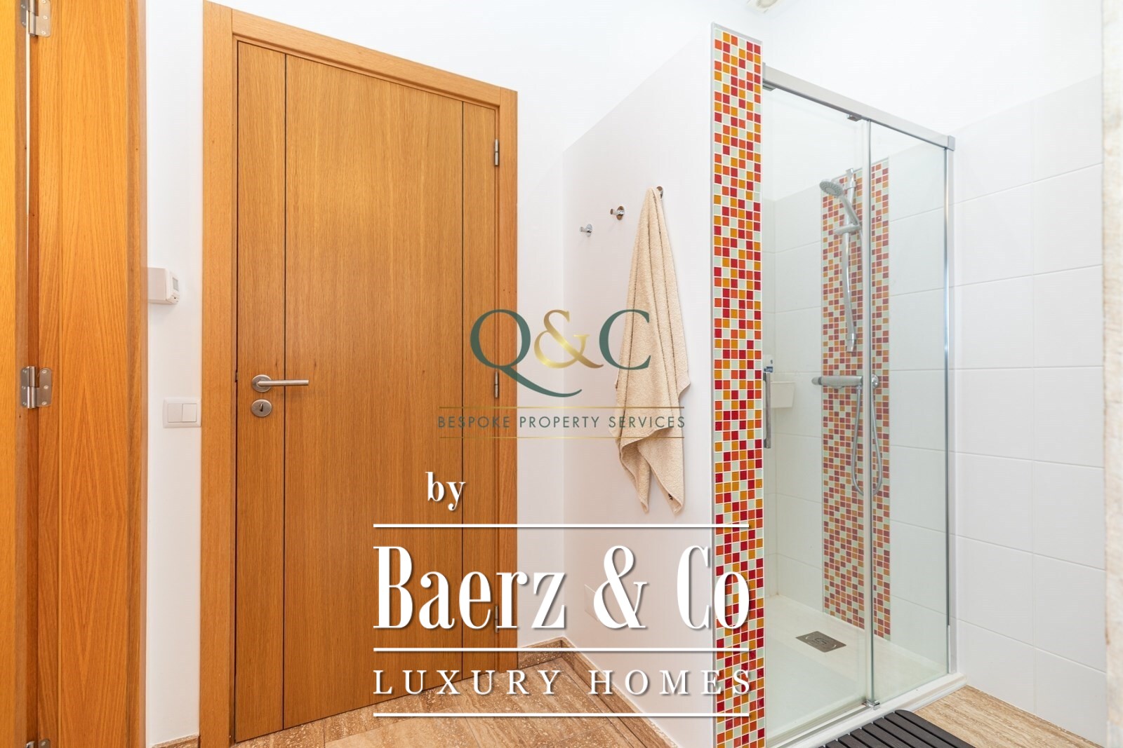 The rear garden is fully walled, providing privacy and a sunlit setting for the 8 x 3 m heated infinity pool and covered alfresco dining areas. Mature, low-maintenance landscaping and calçada stone pathways unify the outdoor experience. Features such as Daikin air conditioning, electric underfloor heating, solar hot water, PV panels generating 6.5 kW with a 12 kW battery system, and mains water enhance comfort and efficiency.