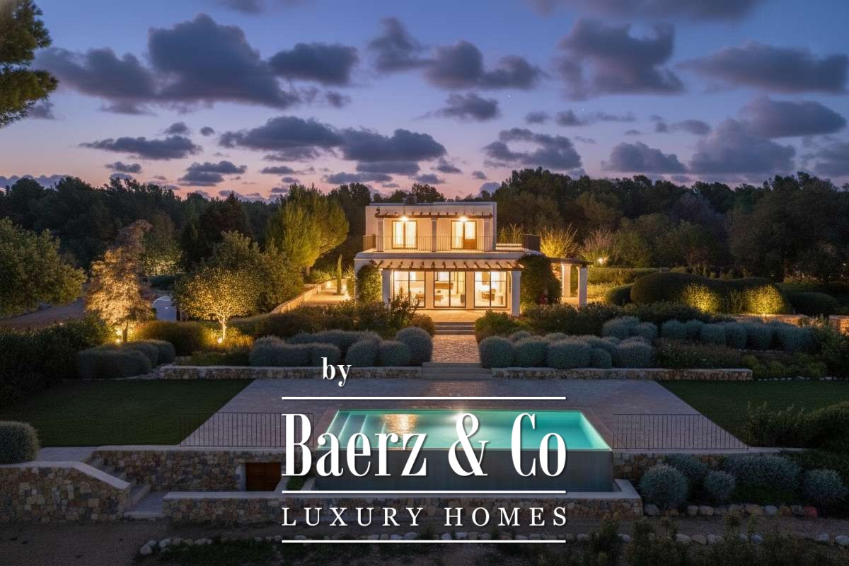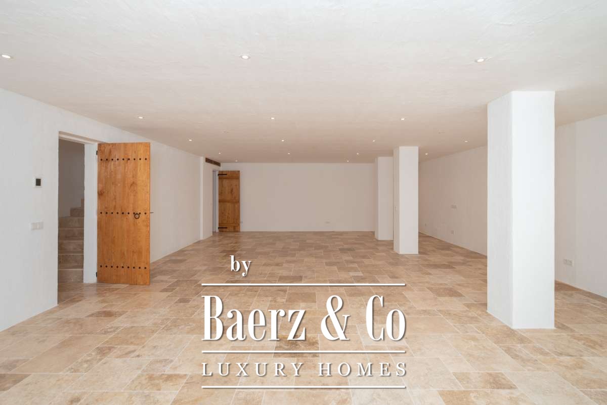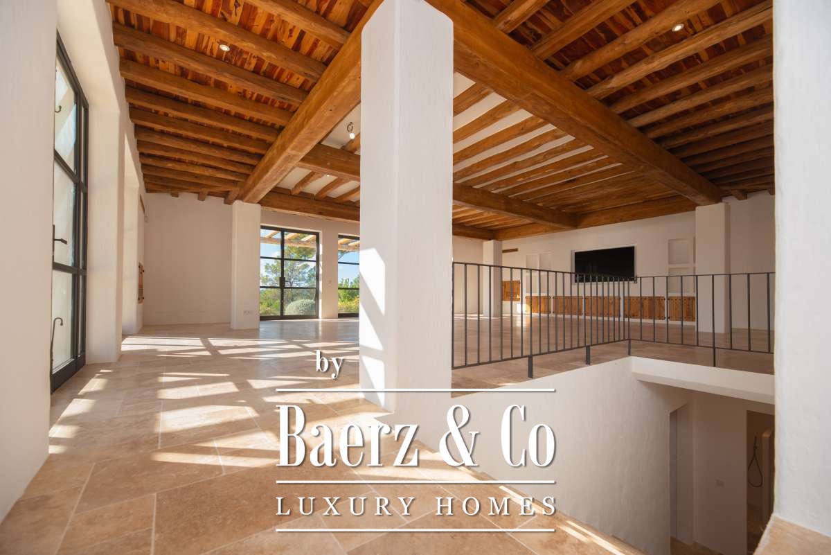 The recently renovated finca blends historic character with contemporary finesse. Every detail of the 620 m² residence, from exposed stone walls to soft, harmonious tones, underlines an enduring elegance. The living areas are open, inviting light and nature into each room, while the seamless integration of kitchen and lounges lends itself to both intimate gatherings and quiet reflection. Six bedrooms and five bathrooms provide refined comfort, with the master suite offering panoramic views and nightly glimpses of Dalt Vila’s illuminated skyline.