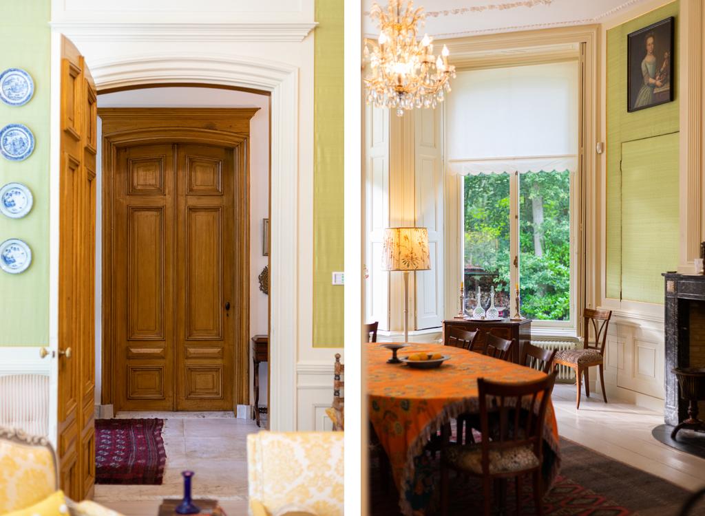 The interior is rich in period details, including ornate fireplaces, damask wall coverings, refined staircases and bespoke finishes.