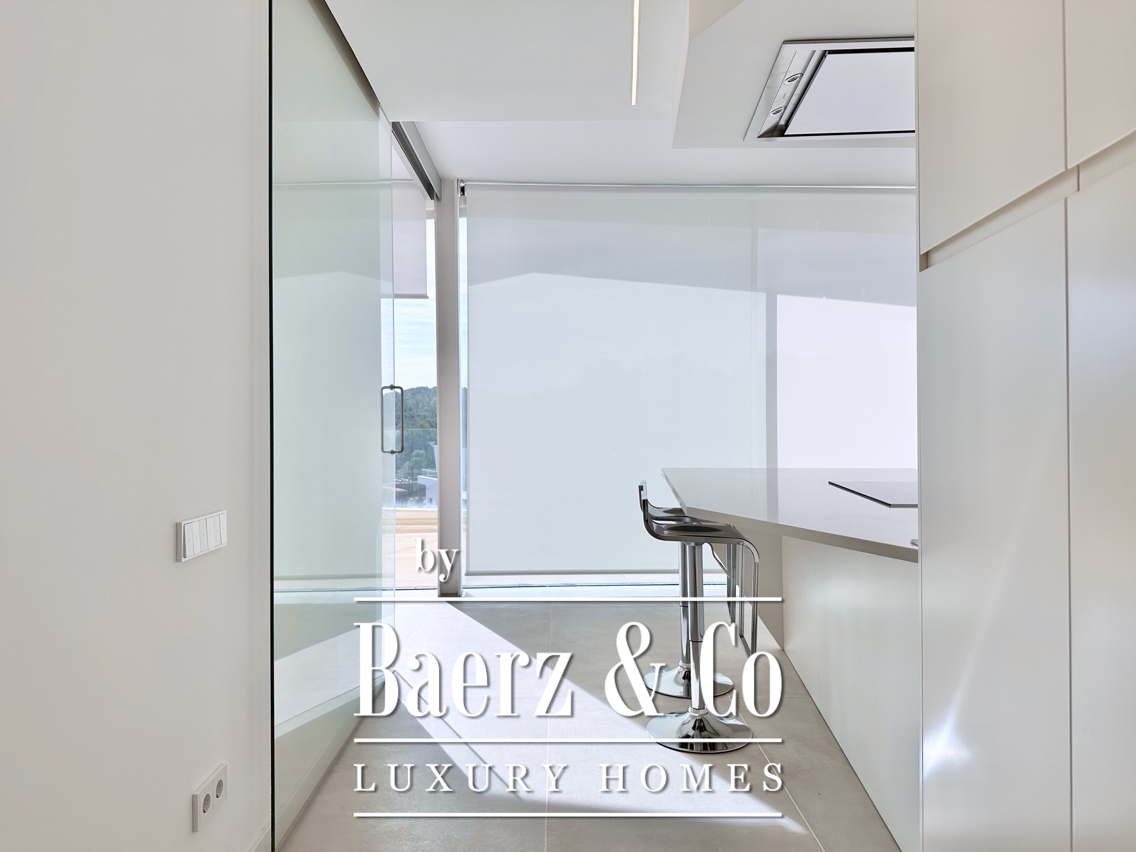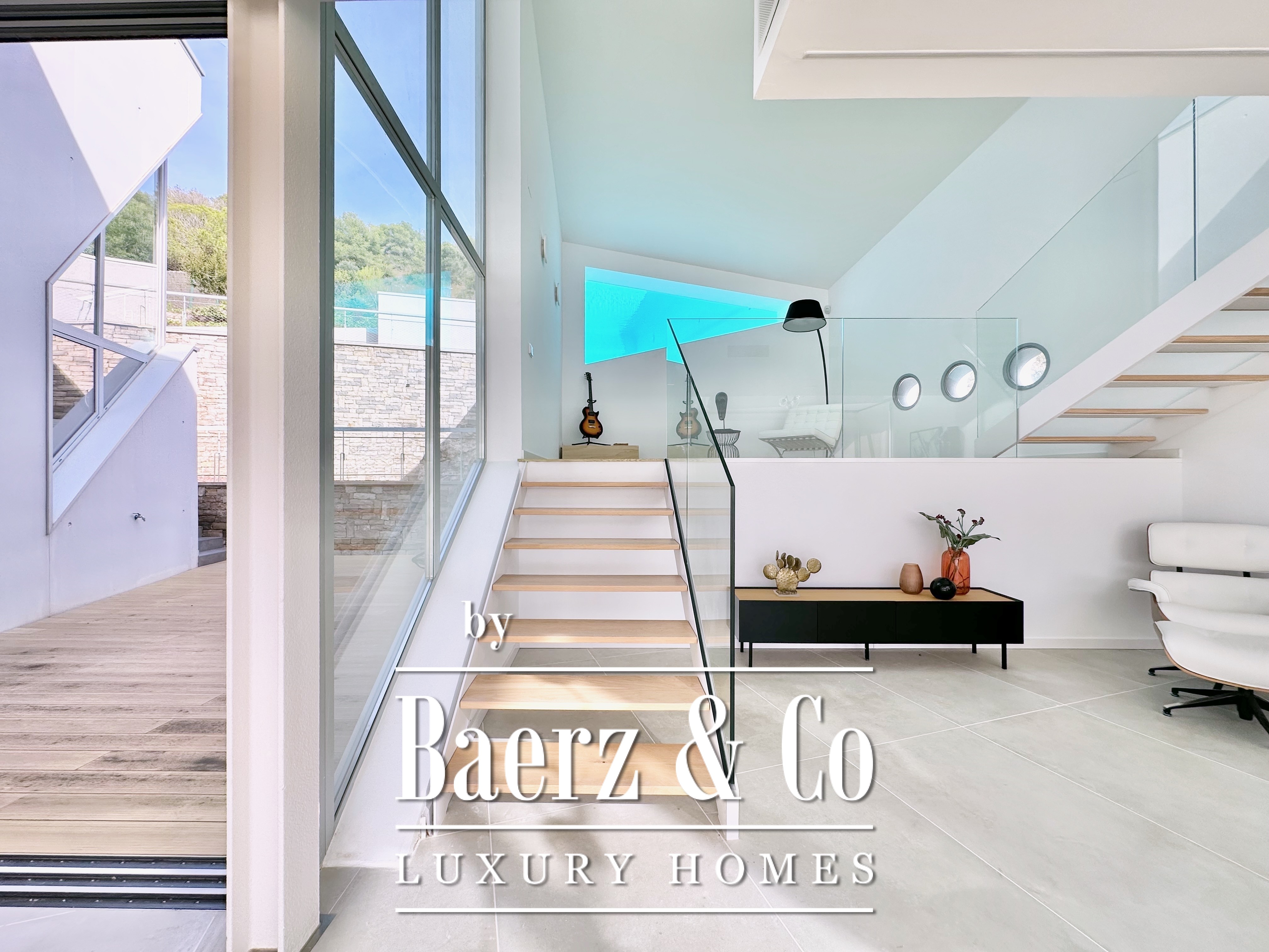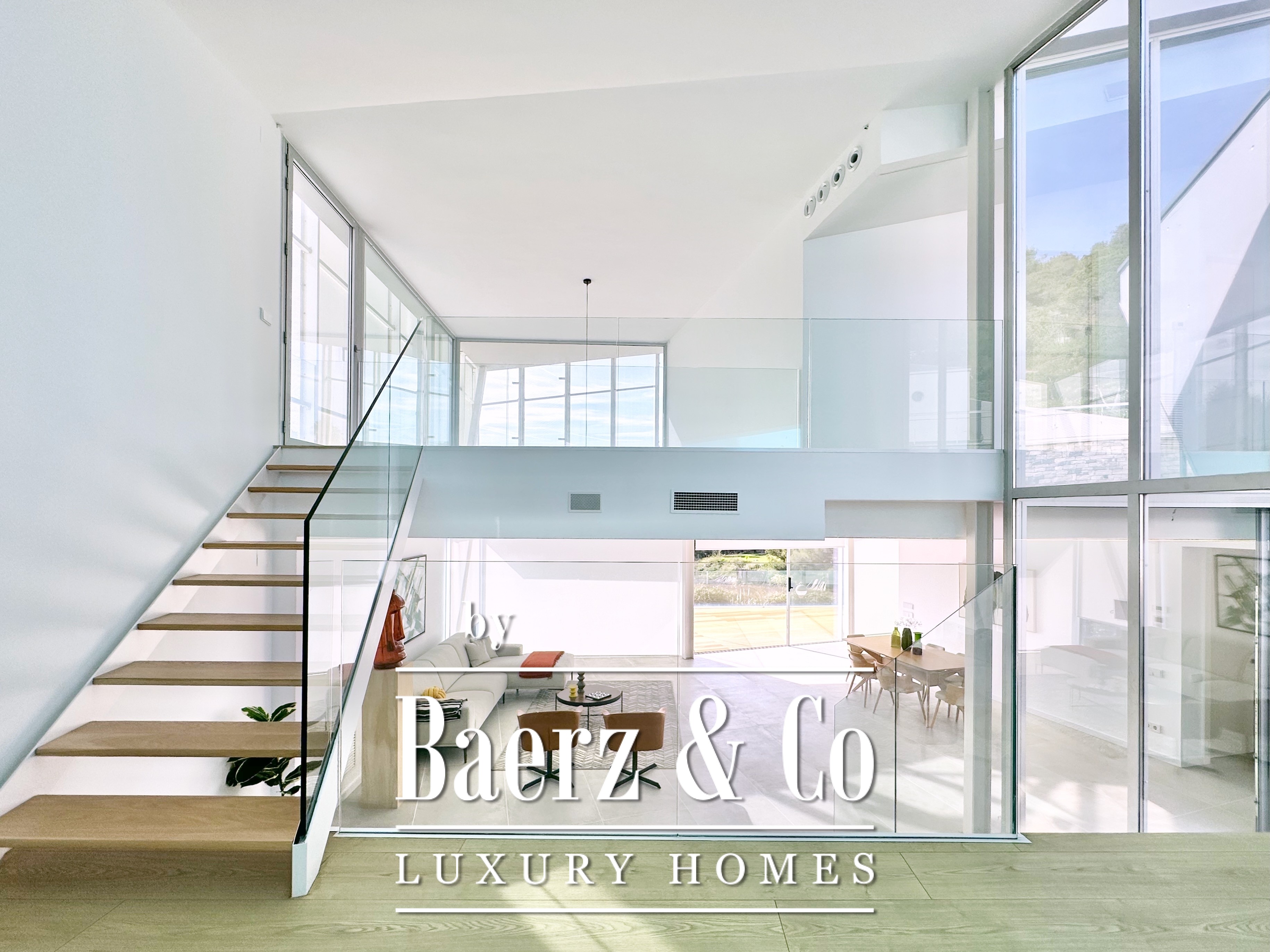 The home spans two principal levels above a versatile basement, connected by a private lift. On the lower ground, a garage accommodates four vehicles, complemented by a wine cellar, storage, laundry, and technical rooms. The main floor, anchored by an 80 m² living-dining area beneath double-height ceilings, is framed by floor-to-ceiling glazing, offering generous natural light and direct access to a covered sea-facing terrace. The kitchen is finished with contemporary white cabinetry, a central island, and integrated Siemens appliances, adaptable via a sliding glass partition. A guest suite with en-suite bathroom and a guest toilet complete this level.
