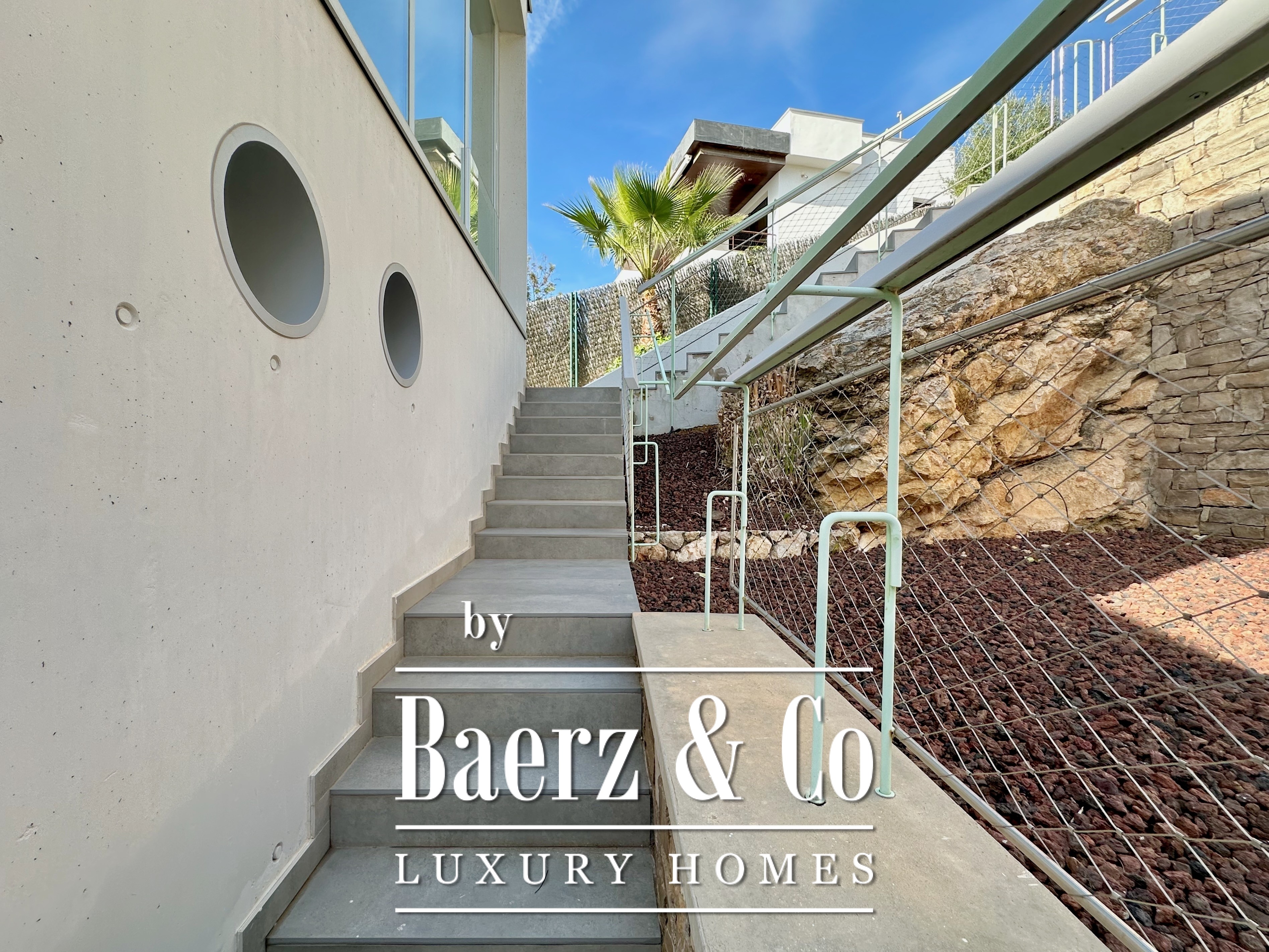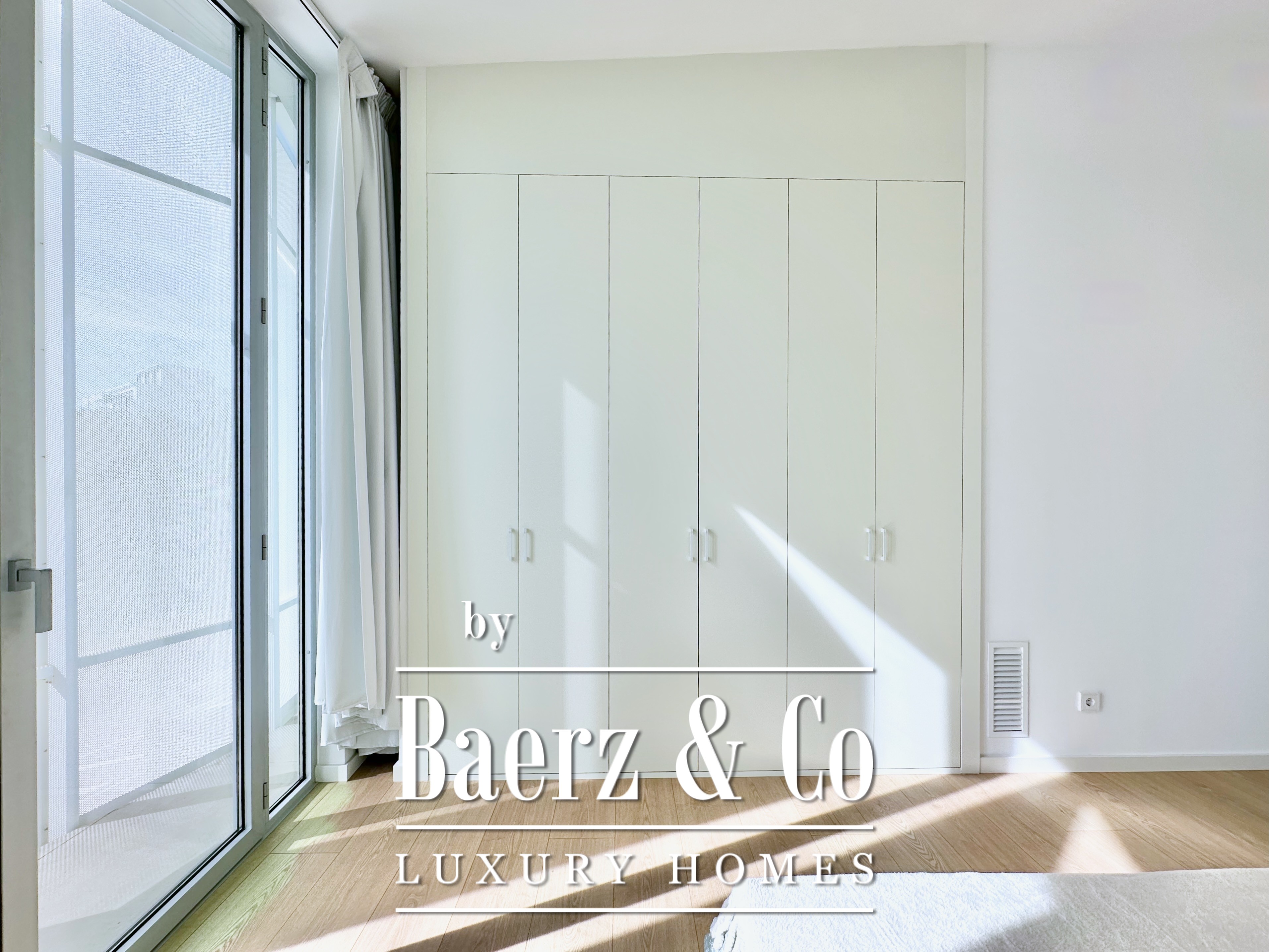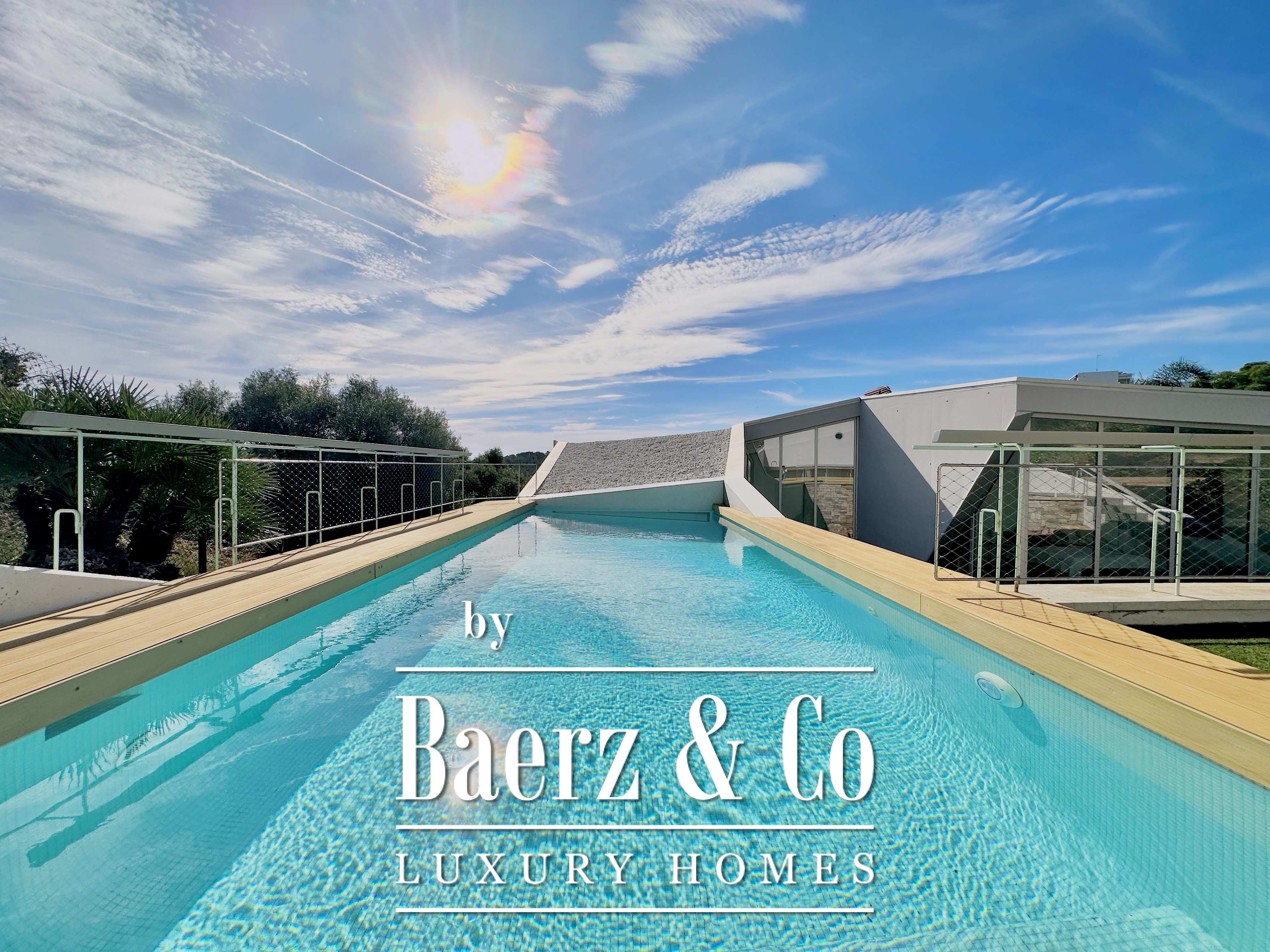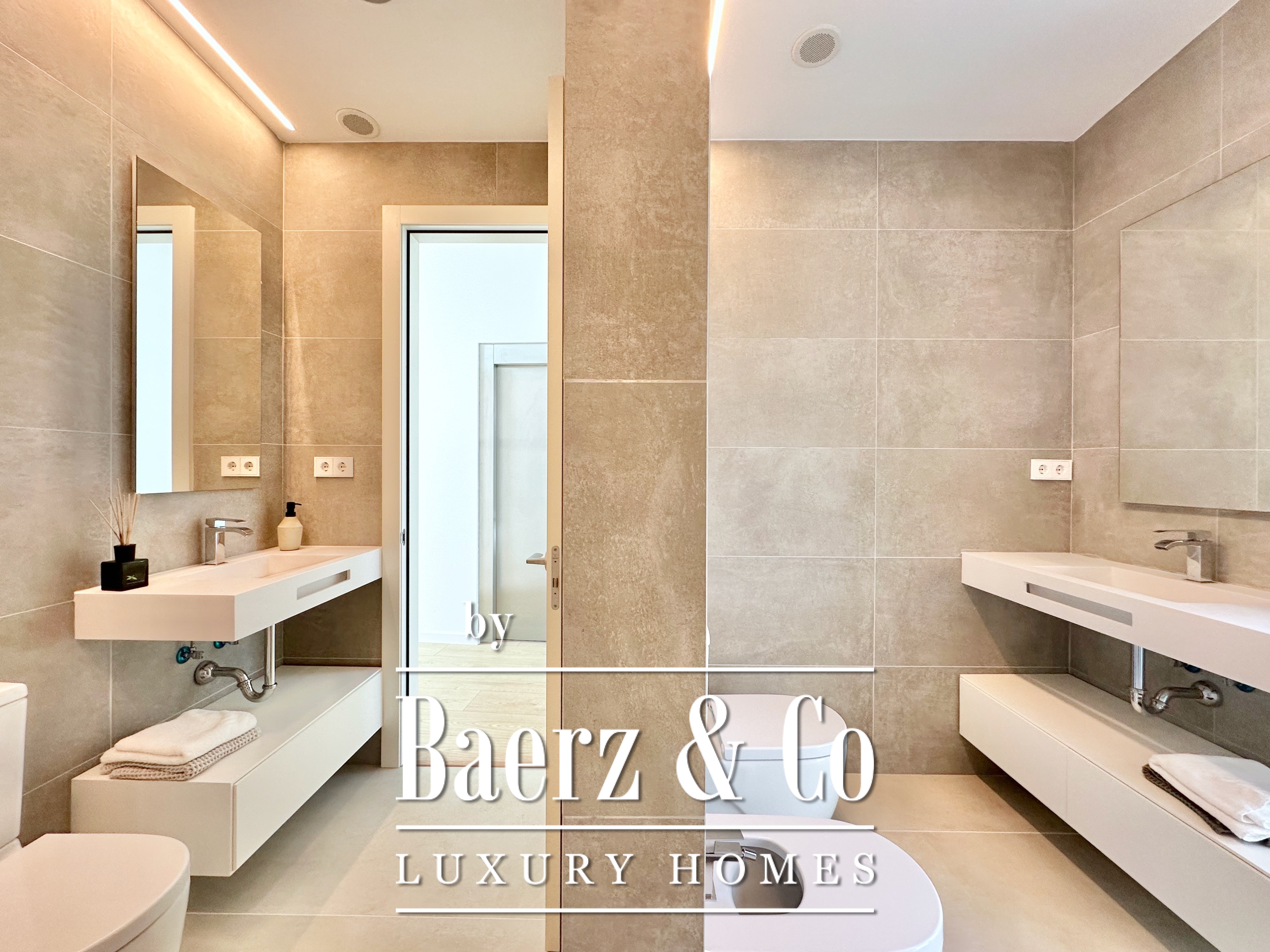 The home spans two principal levels above a versatile basement, connected by a private lift. On the lower ground, a garage accommodates four vehicles, complemented by a wine cellar, storage, laundry, and technical rooms. The main floor, anchored by an 80 m² living-dining area beneath double-height ceilings, is framed by floor-to-ceiling glazing, offering generous natural light and direct access to a covered sea-facing terrace. The kitchen is finished with contemporary white cabinetry, a central island, and integrated Siemens appliances, adaptable via a sliding glass partition. A guest suite with en-suite bathroom and a guest toilet complete this level.