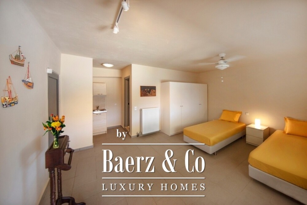 Villa Soligeia with sea views is positioned just 50 meters from the gentle coastline, offering a rare sense of privacy within the gulf of Amoni. Completed in 2006, this four-level villa rests on a 1,059 m² plot, its architecture thoughtfully adapted to the natural slope. Each of the 300 m² is dedicated to clarity of space and quiet certainty of design.