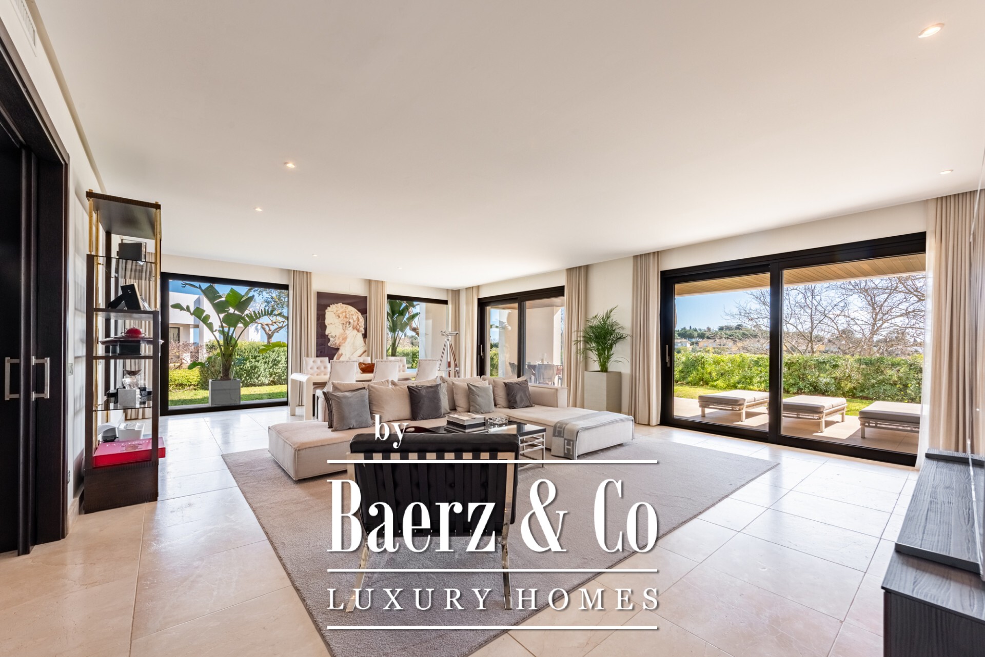The residence measures 462 m² and spans a generous ground floor blueprint. Three well-proportioned bedrooms each hold en-suite bathrooms, while the living areas are defined by marble floors and south-east light. A home automation system, underfloor heating, and advanced security join air conditioning, fitted wardrobes and a fully appointed kitchen, ensuring comfort is as integral as design. Direct garden access flows from the main rooms, extending the living experience outdoors across 97 m² of private terrace and garden space.