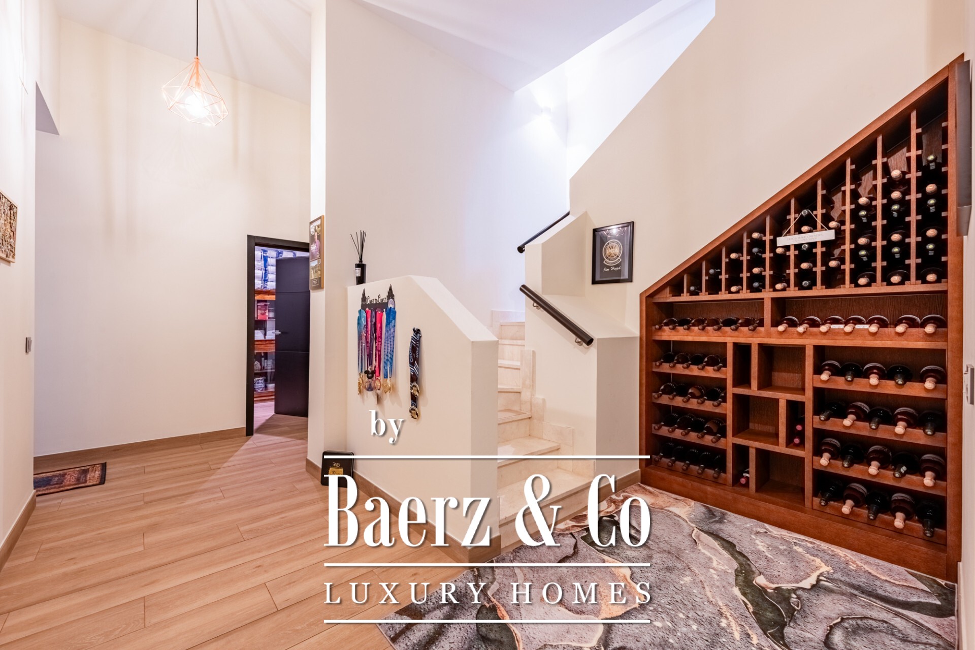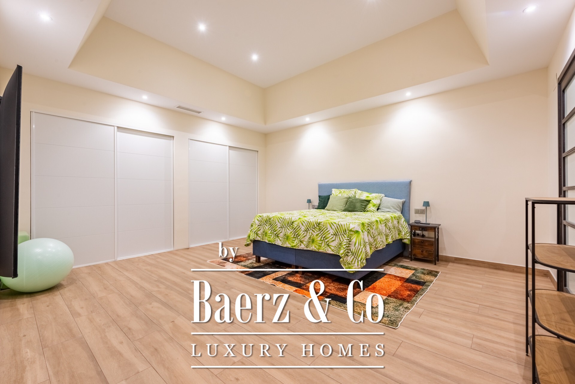 Spanning 548 m² across multiple levels connected by a private lift, this penthouse offers three bedrooms—two arranged as suites on the main and upper floors, and a particularly private en-suite room with direct lower-level access, generous storage, and a large private garage suitable for guests or staff.