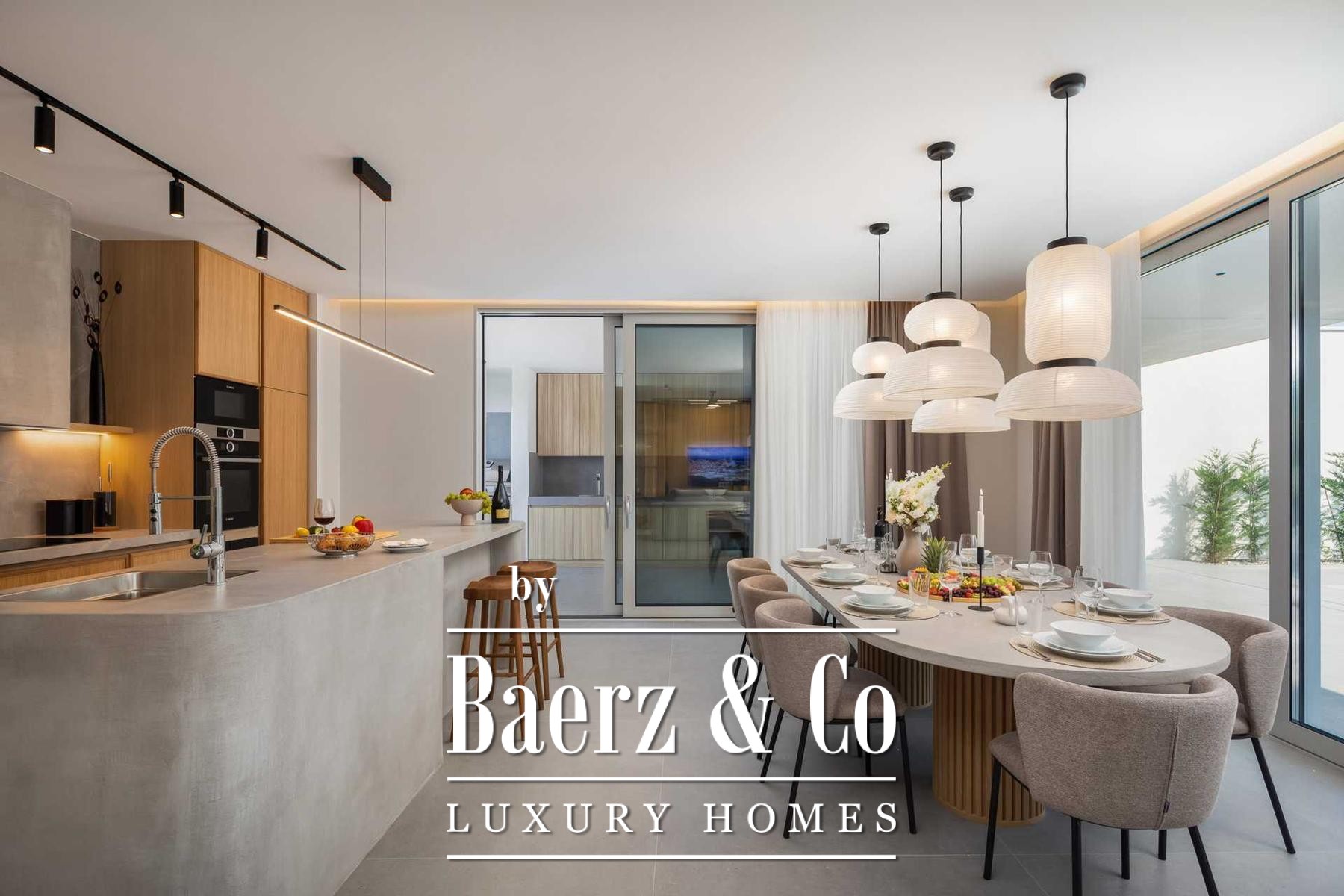 The entrance leads to a considered ground floor layout, where a fitness space with sauna and a bathroom set the tone for wellbeing. An open-plan kitchen, dining, and living zone is defined by expansive glass walls that orchestrate the flow of daylight and blur the threshold between inside and out. Covered terraces adjoin both the kitchen and living area, leading to a heated swimming pool and a landscaped sun deck.