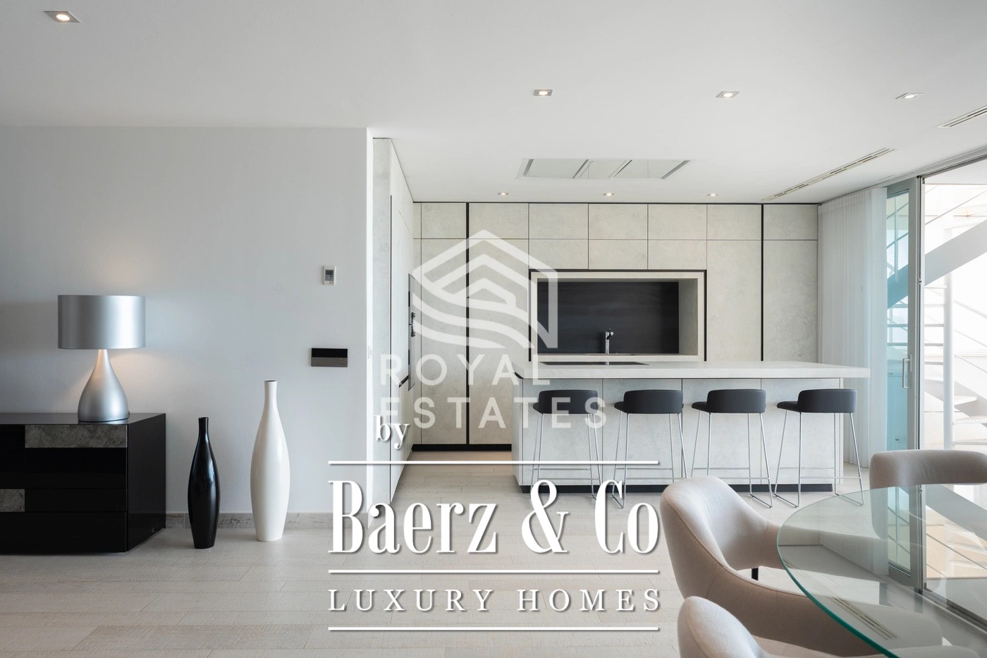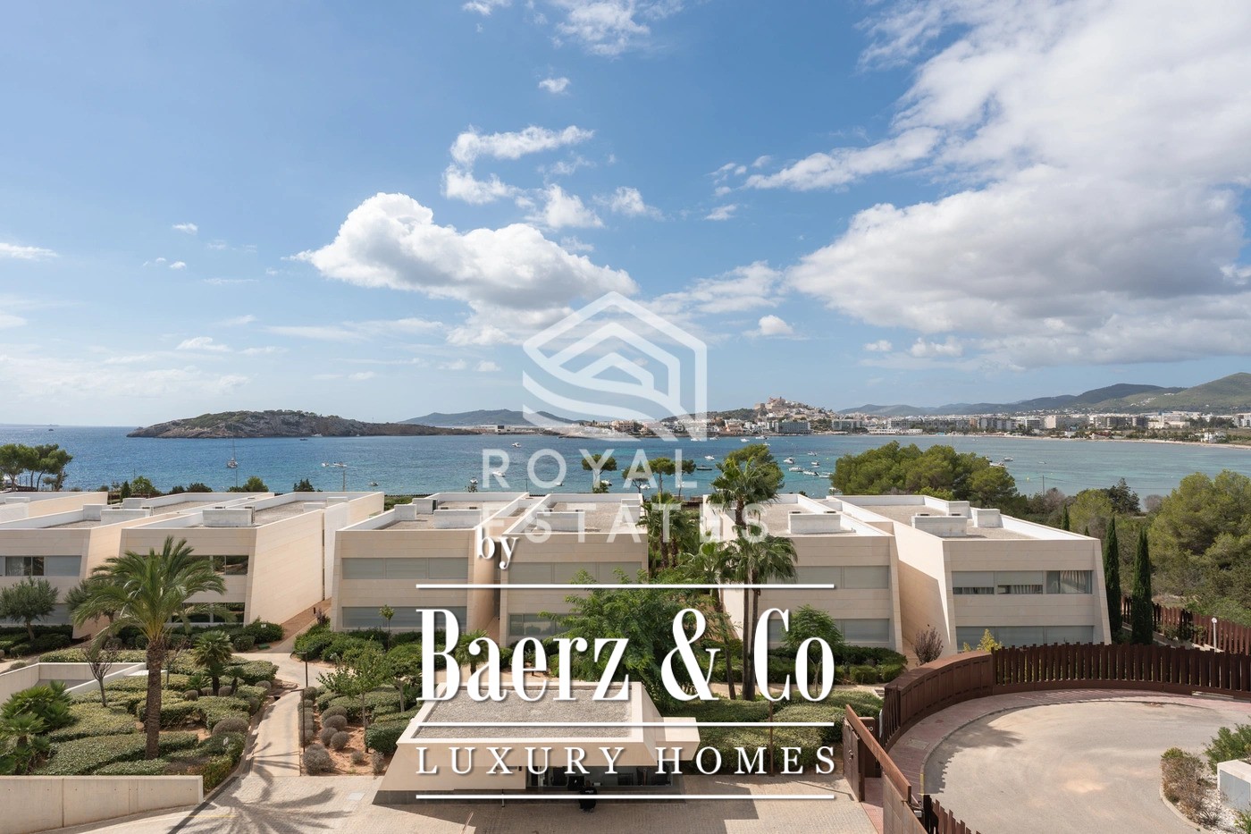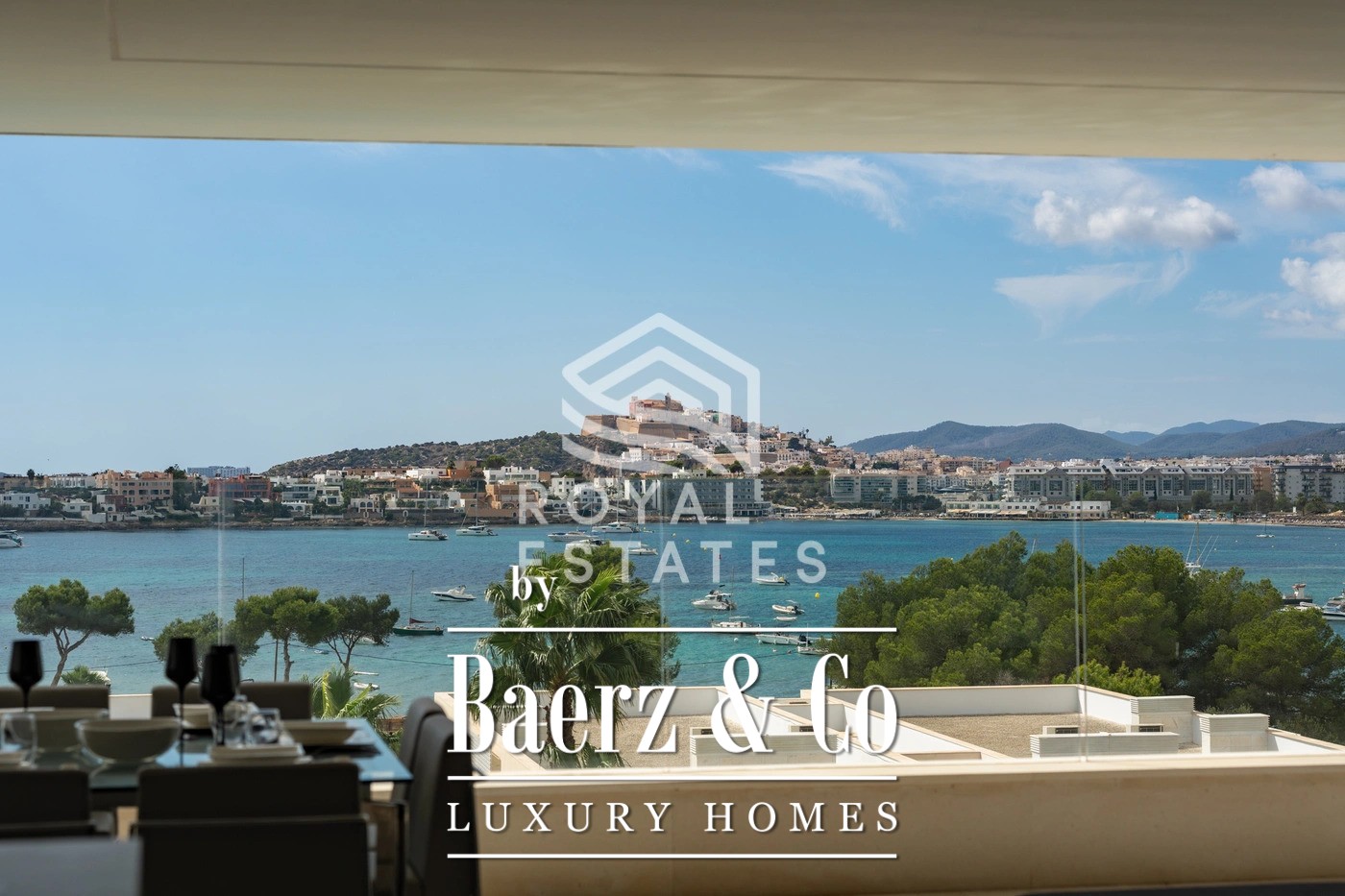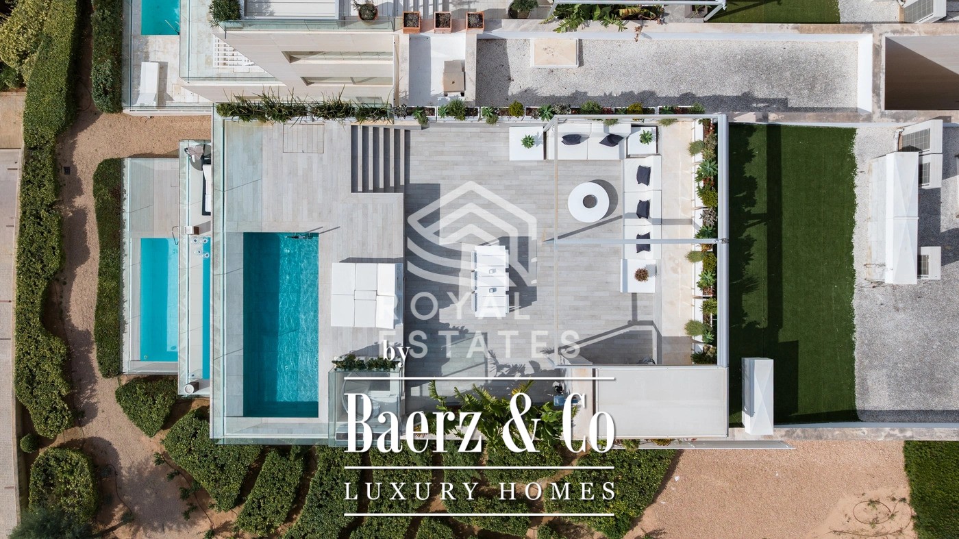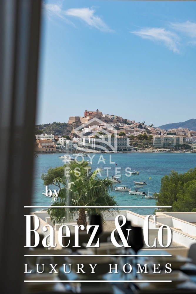 This exceptional duplex penthouse is located in the exclusive Es Pouet residential complex, one of the most prestigious and secure communities on Ibiza. Set in the beautiful bay of Talamanca, just minutes from Marina Botafoch and Ibiza Town, this property represents the ultimate expression of modern island living. With breathtaking panoramic views over the Mediterranean Sea and the historic silhouette of Dalt Vila, it offers a unique combination of luxury, privacy, and convenience. Occupying a total built area of approximately 428 m2, with 347 m2 of usable interior space, this residence has been thoughtfully designed to maximize natural light and create a seamless flow between indoor and outdoor living. The main floor features a spacious open-plan living and dining area with floor-to-ceiling windows that open onto a large terrace overlooking the bay. The contemporary kitchen is fully equipped with high-end appliances and an elegant kitchen-office layout that blends functionality with style. The property includes four generous bedrooms, three with its own en-suite bathroom, ensuring complete privacy and comfort for residents and guests alike. The master suite is particularly impressive, with direct terrace access and stunning sea views. Additionally, there is a guest toilet and a separate laundry room for added convenience. The interiors are defined by clean lines, natural tones, and premium materials that reflect understated elegance and quality craftsmanship. An architectural highlight of this penthouse is its spectacular