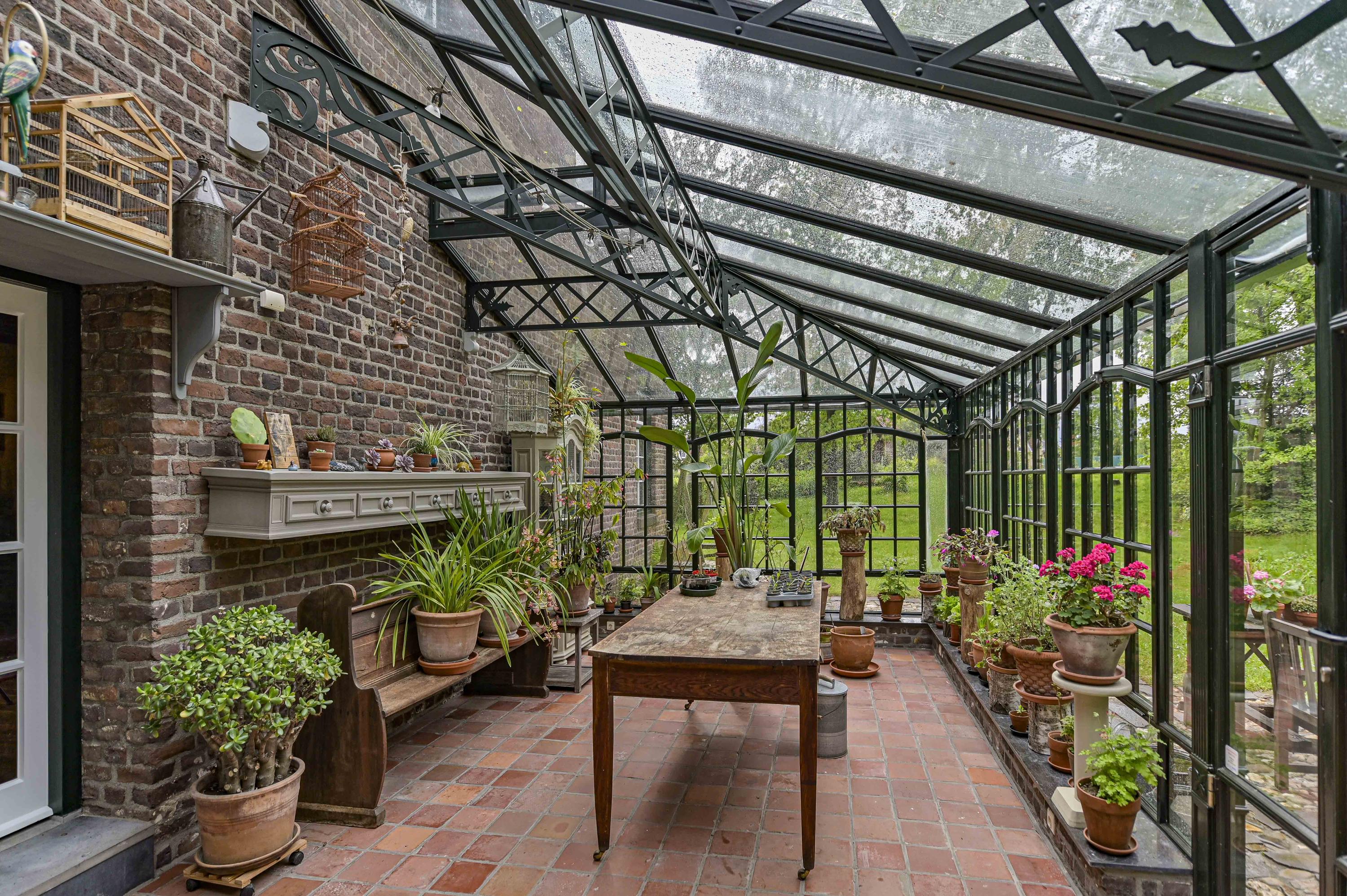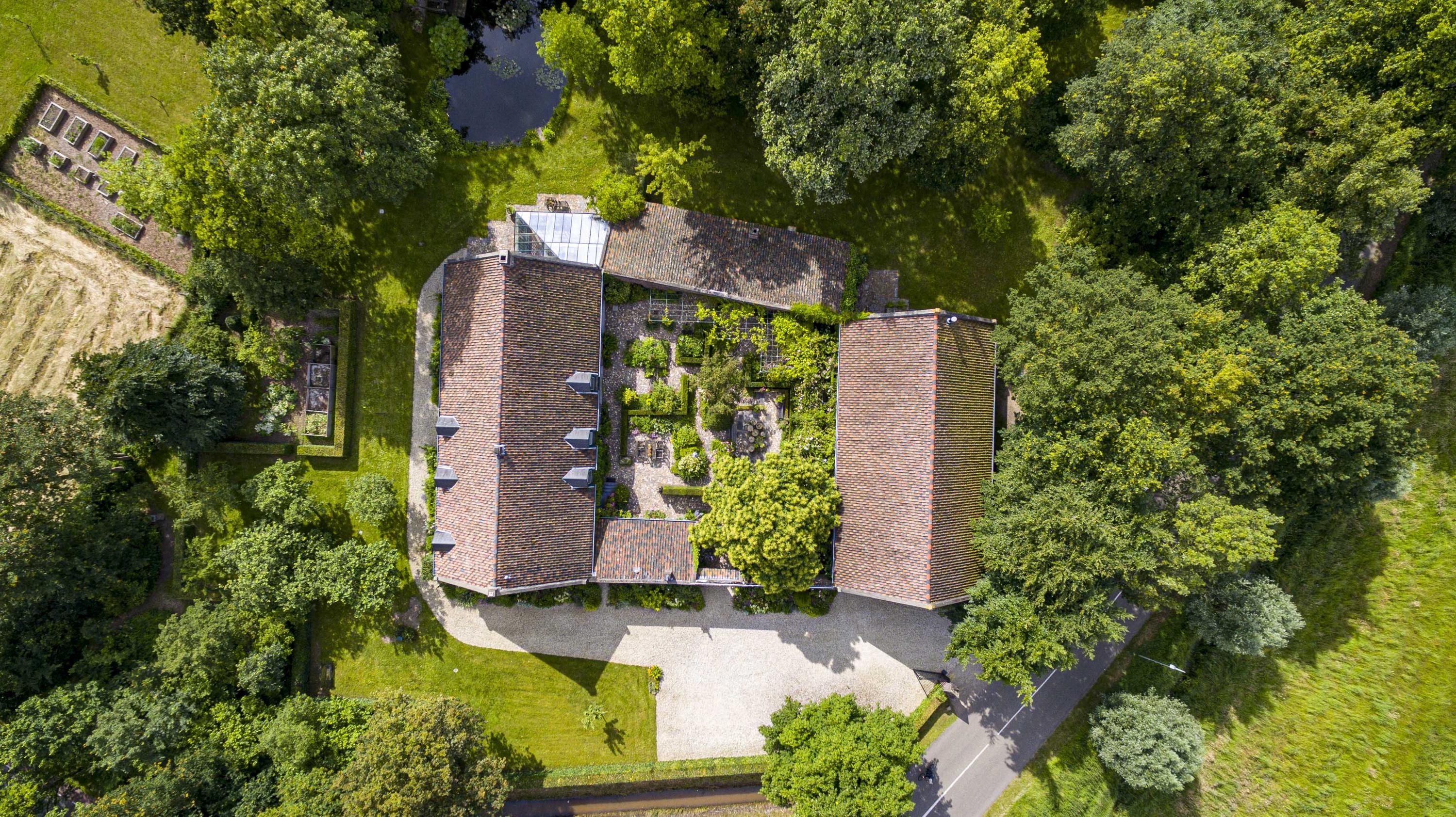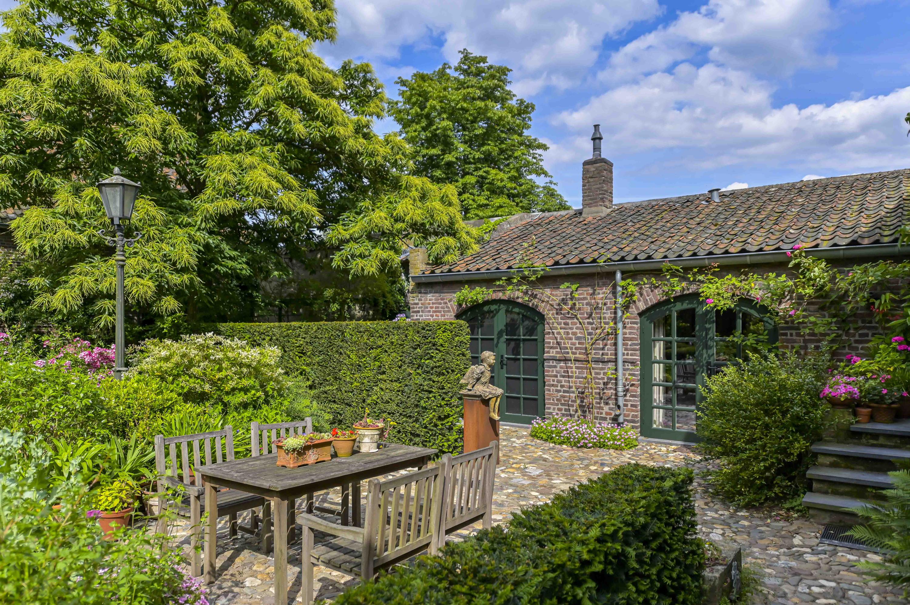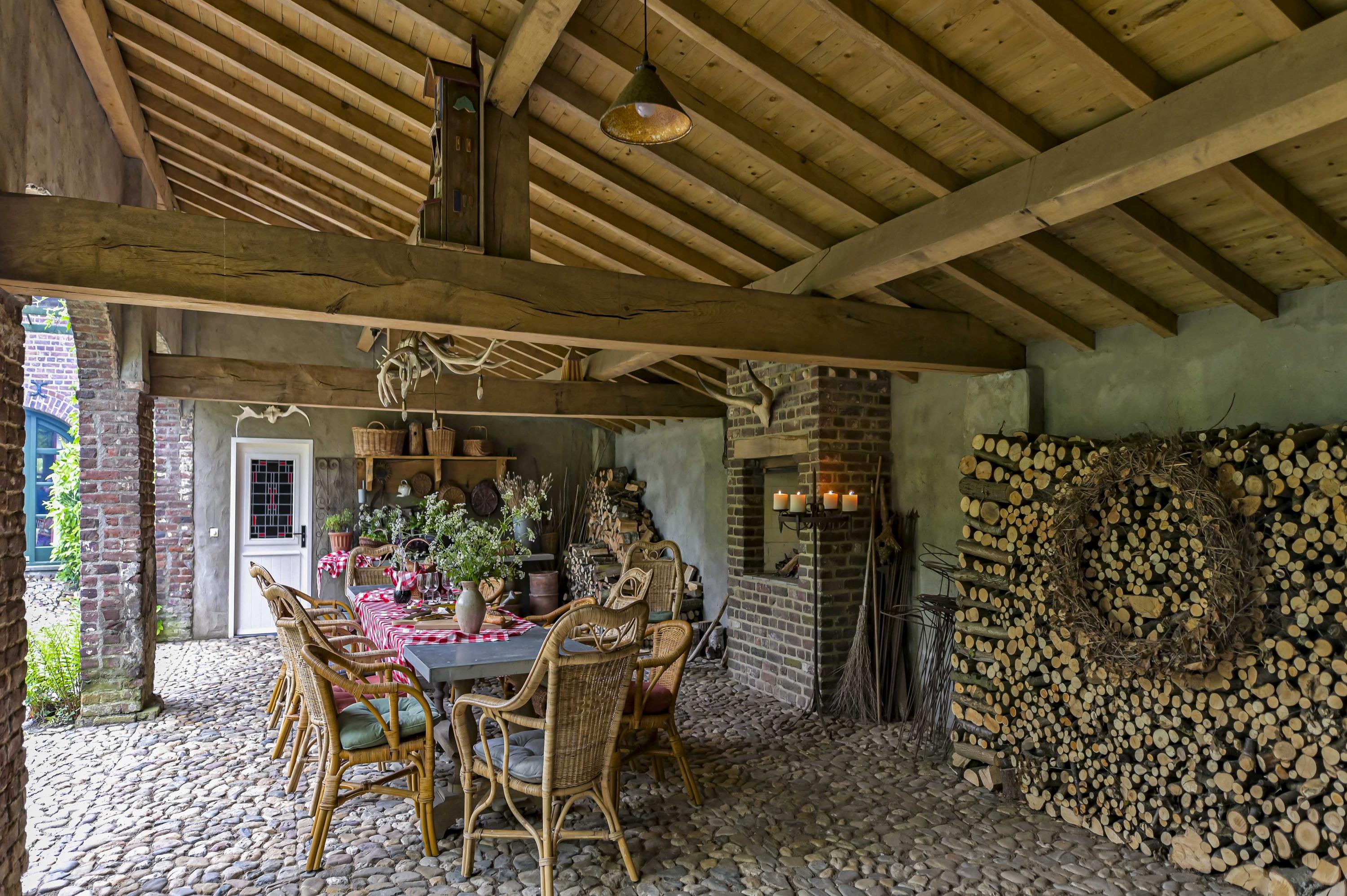 Beautifully landscaped courtyard with a spacious covered terrace (approx. 65 m²) featuring three elegant arches. The courtyard provides a full view of the carré layout of the farmhouse. All gutters and drains are finished in zinc.