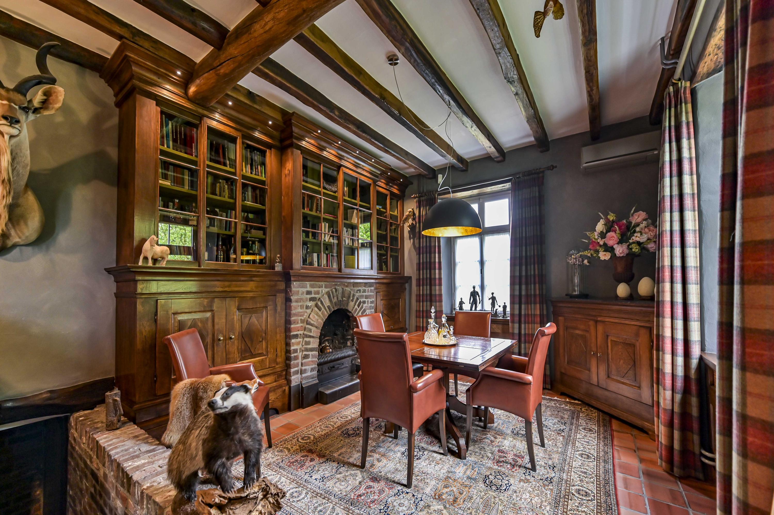 The grand living room (approx. 81 m²) is surrounded by windows, flooding the space with natural light. It includes a large open fireplace, an impressive mantelpiece, and a unique wooden bar. French doors open to the courtyard and to the adjoining conservatory.