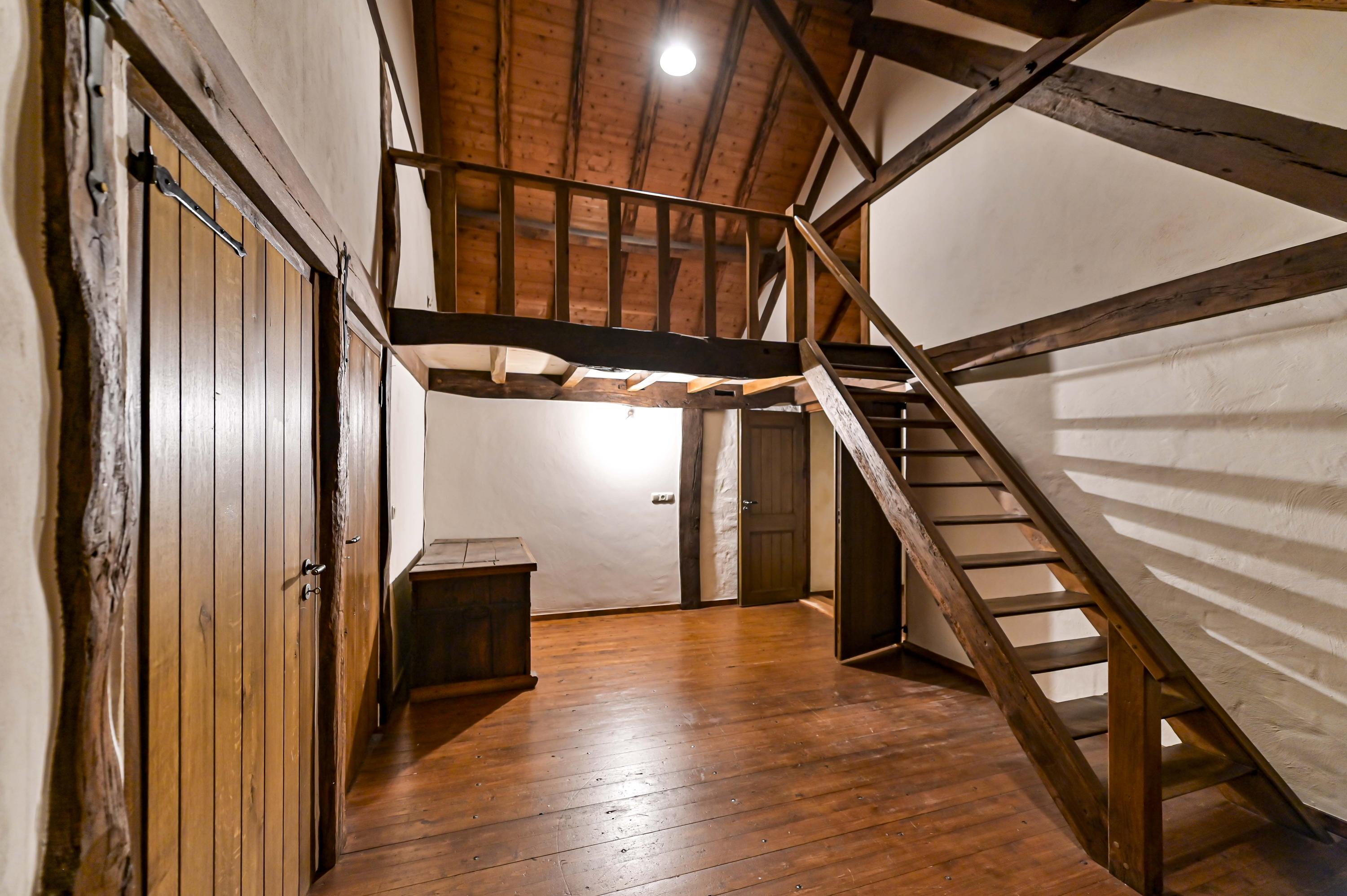 The play loft offers a mezzanine with fixed staircase and passage to an additional attic. From here, doors lead to:
