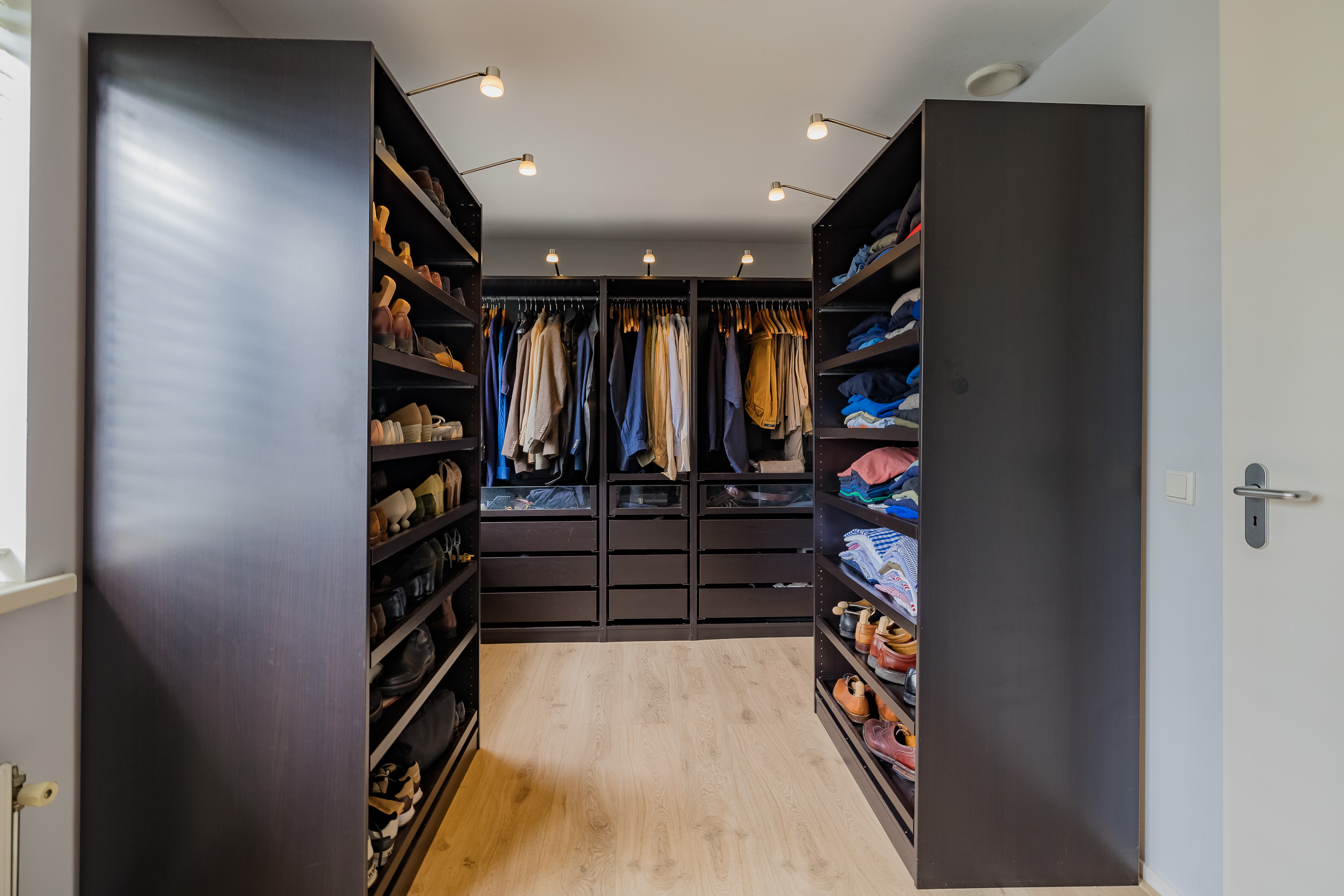 The living room is wonderfully spacious and light thanks to the large bay window and windows in a modern English country house style. At the front, you can enjoy a cozy sitting area where the dark Jatoba wood floor and fireplace create even more atmosphere. At the rear are the kitchen and dining room, which have four French doors leading to the garden and veranda.