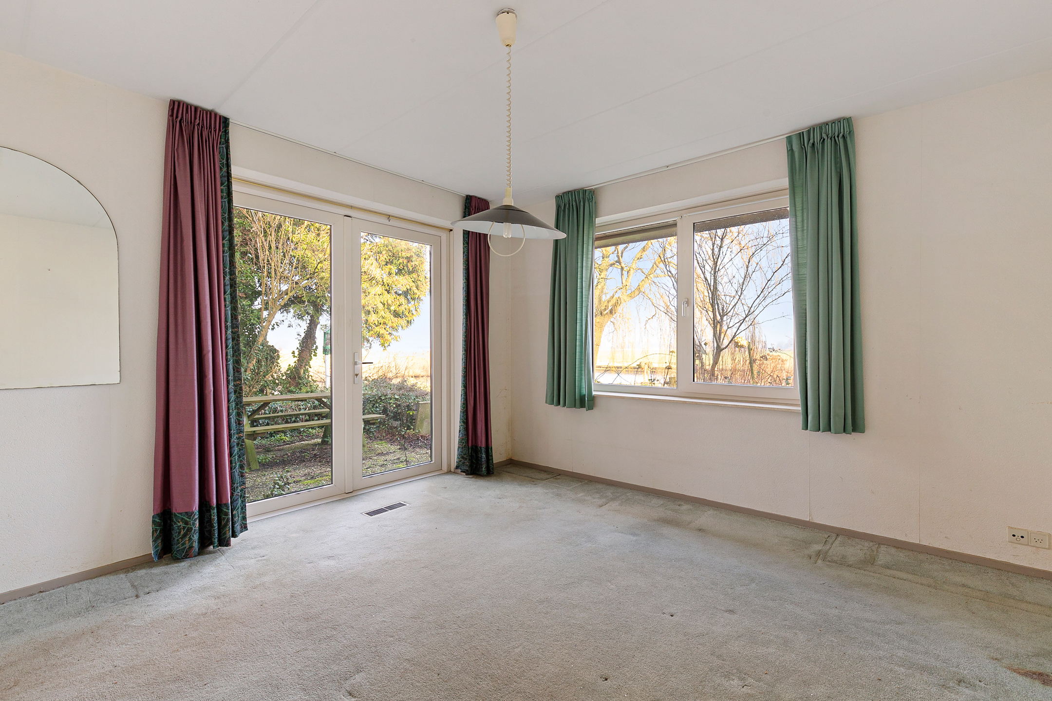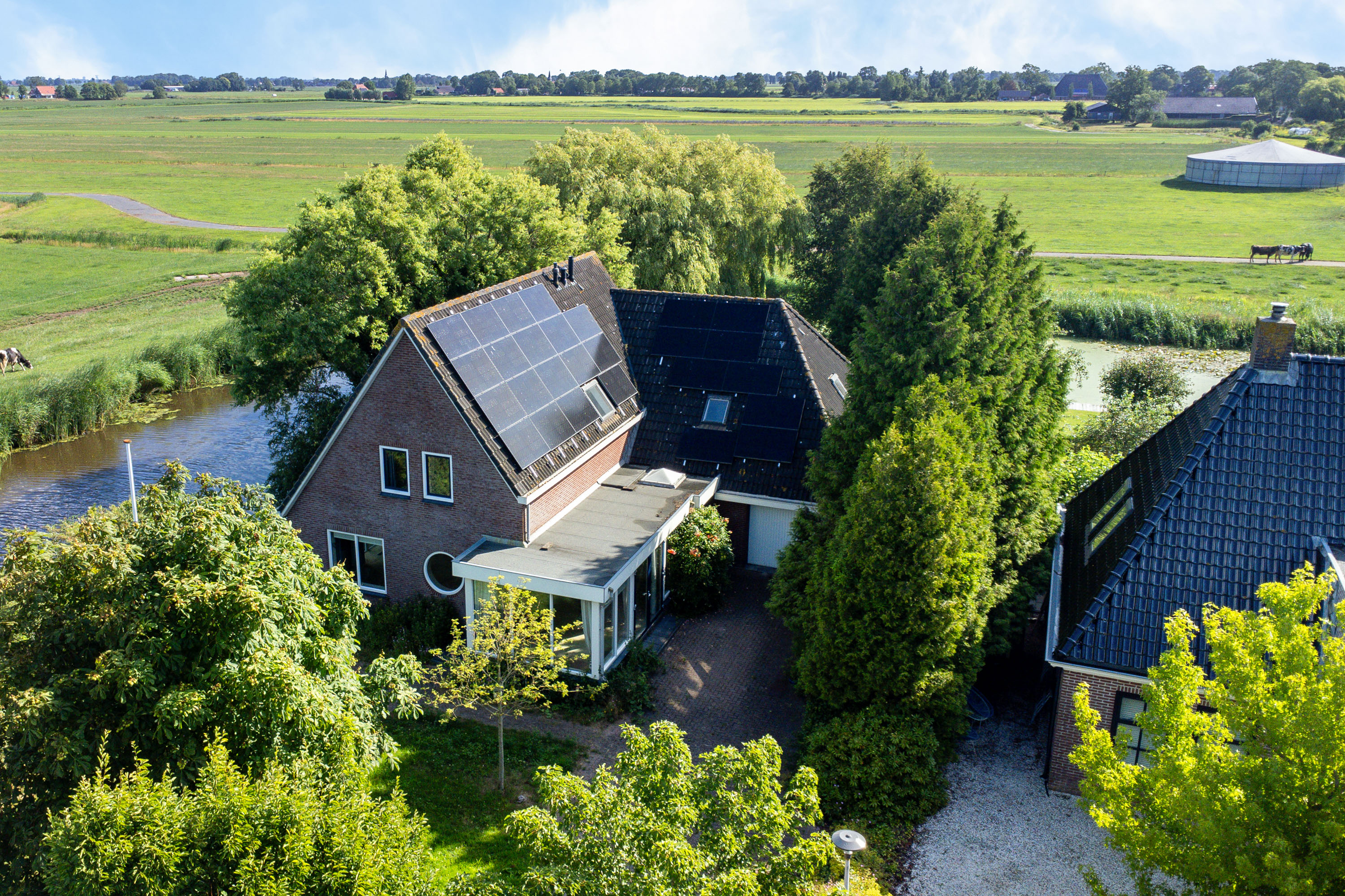 Thanks to its corner position with (private) water on all sides, the garden is completely free and offers optimal privacy. The rear garden features a small pond, a garden shed and along the bank several (older) jetties for mooring boats. Here you can enjoy the pure Frisian outdoor life from early morning until late evening. The navigable water is suitable for leisure boating and is directly connected to the Aldfeart towards Sneek, the Zwette towards Leeuwarden (Eleven Cities route) and the Bangafeart towards the Sneekermeer and Terherne.