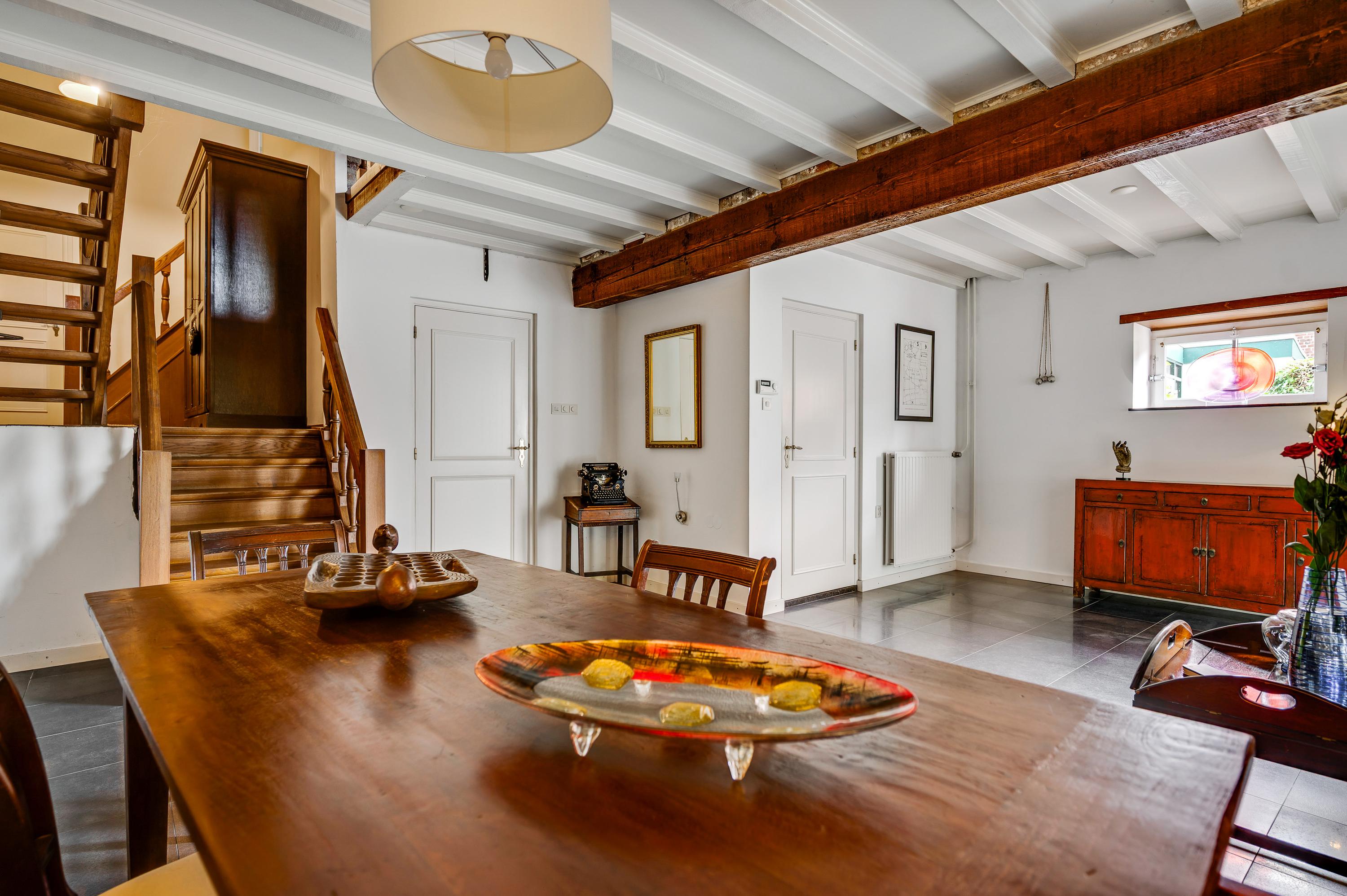 The spacious hall with a fireplace and meter cupboard provides access to the toilet, a bedroom with a separate bathroom, and the kitchen. The stairs to the first floor are also accessible from the hall. The hall also served as the B&B's former living room. This space can be used for various purposes.