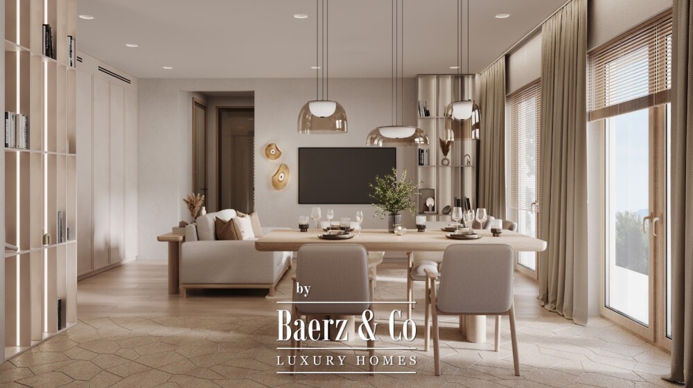 Apartment Tivat brings together sea and mountain views, generous proportions, and a strong sense of place in a sought-after enclave just 350 meters from the water and one kilometer from Tivat’s city center. This apartment is part of a modern residential development of nine buildings, each with only five apartments per building, creating a private and intimate living environment. With 221 m² of living space, the apartment features a bright living room connected to kitchen and dining zones, two bedrooms, two bathrooms, a terrace, and a rooftop terrace—spaces oriented to maximize light, view, and flow across the day.