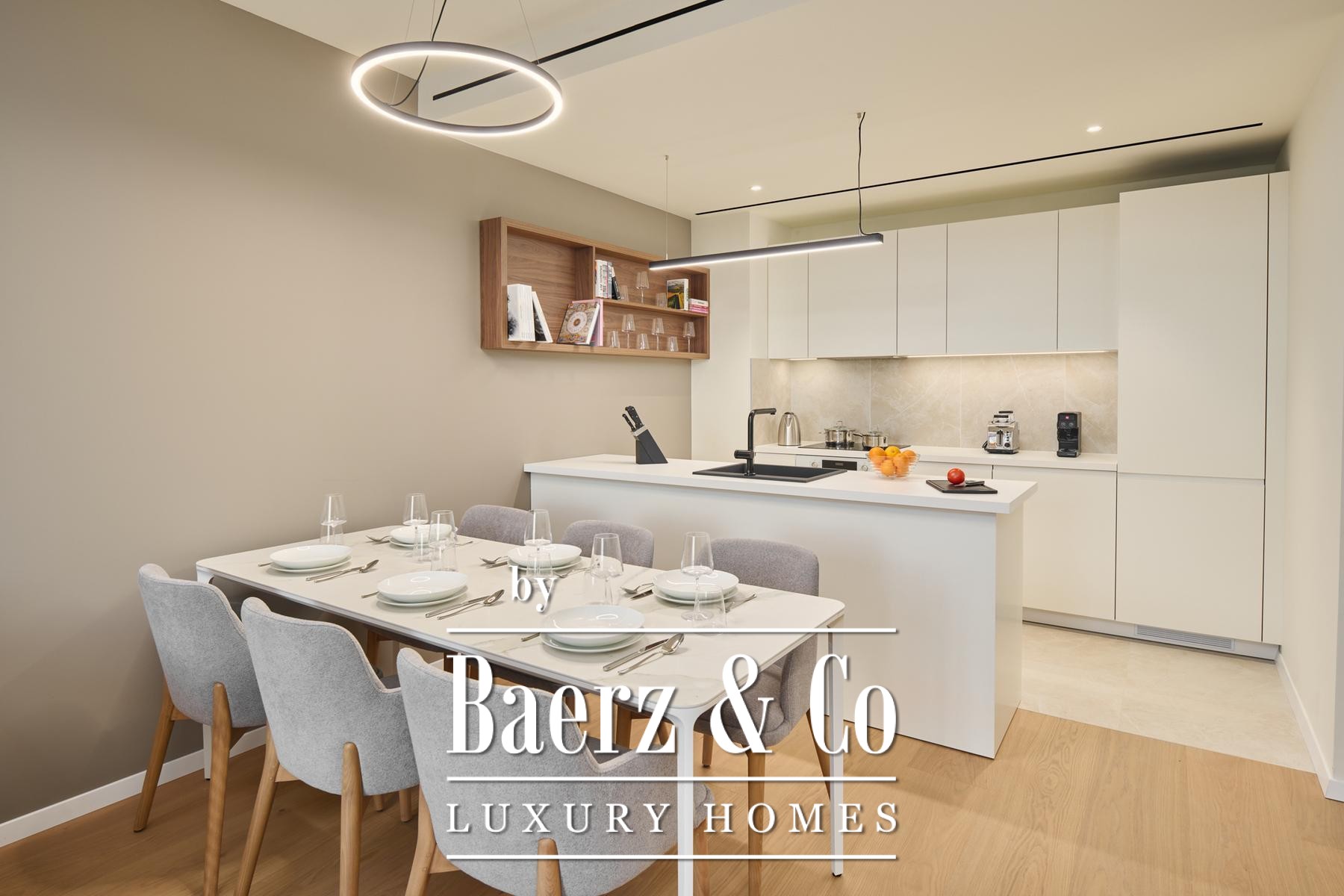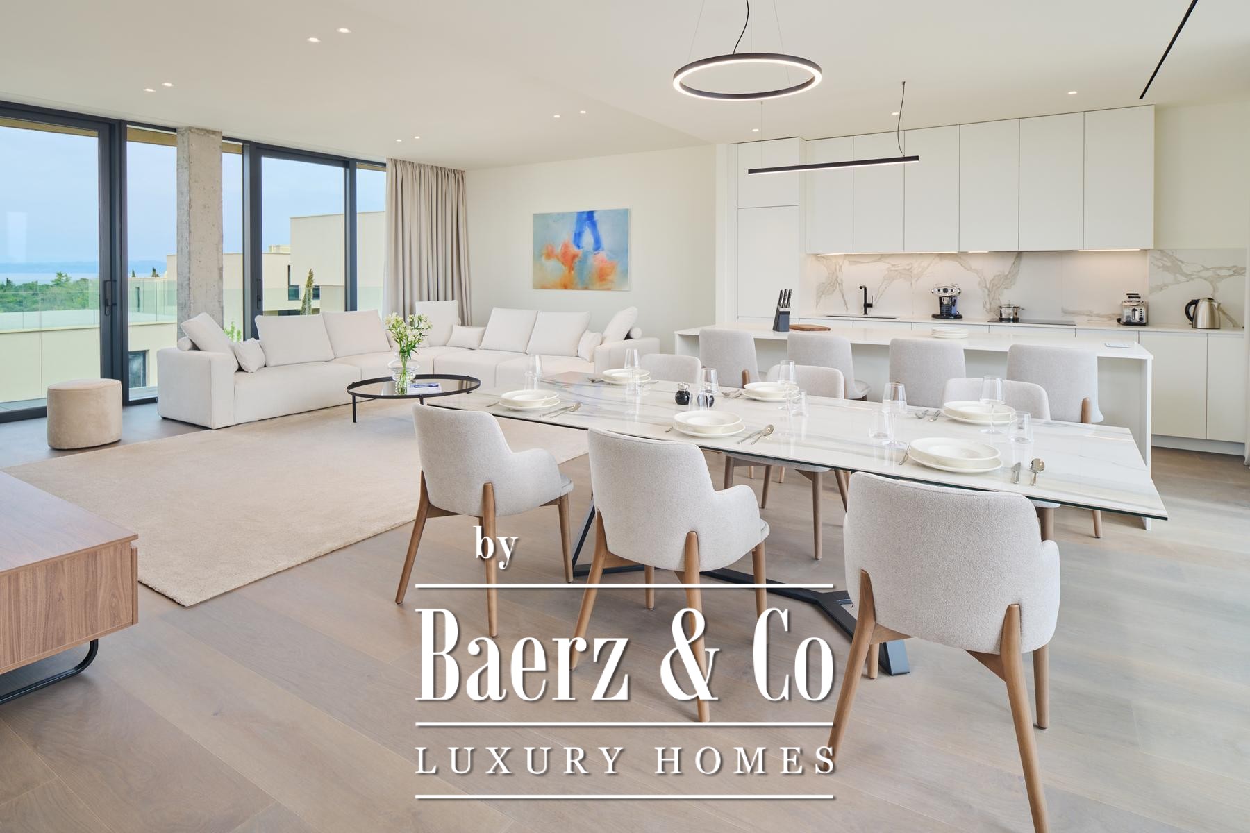 Istria, Savudrija, a modern two-bedroom apartment on the first floor with a net usable area of 81.40 m², located within the Petram Resort. Apartment A14 consists of an entrance area, hallway, laundry room, toilet, bathroom, open-space living room, kitchen and dining area, two spacious bedrooms, and a balcony. The apartment also includes a parking space. The listed price includes the apartment, furniture, and parking. The aparthotel offers