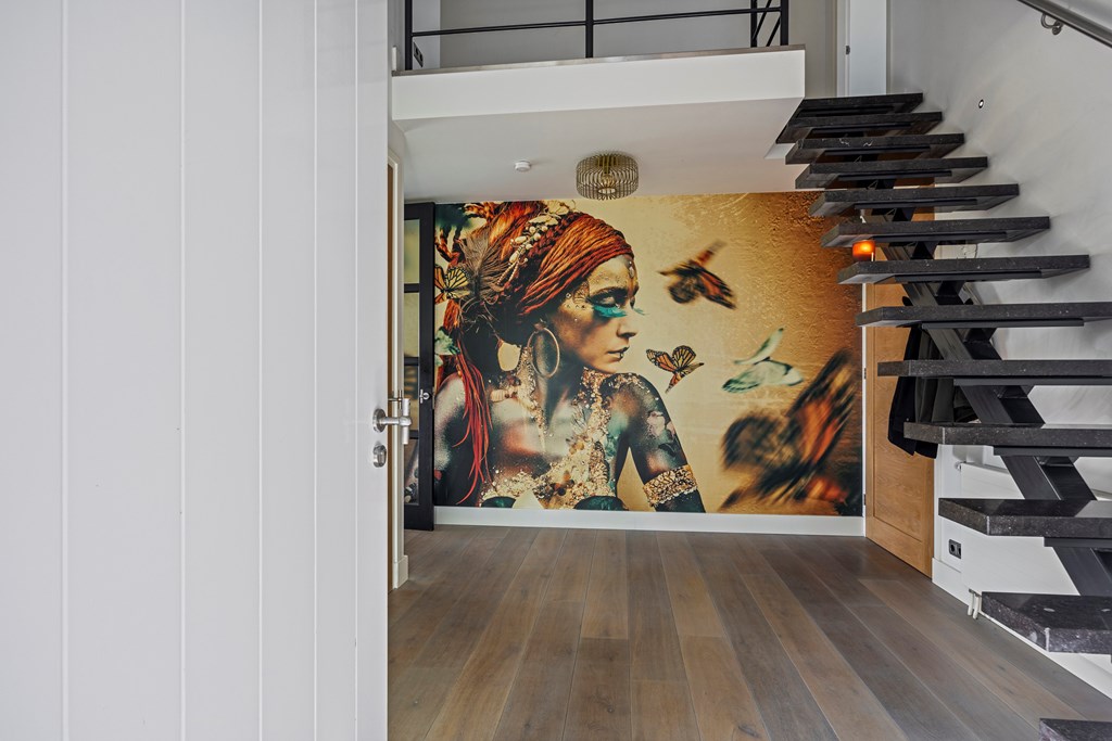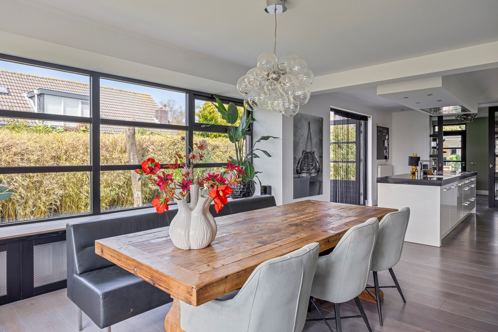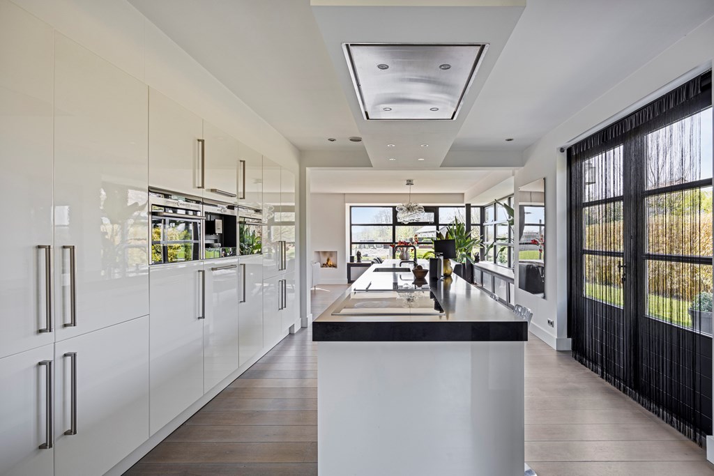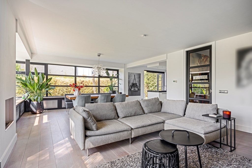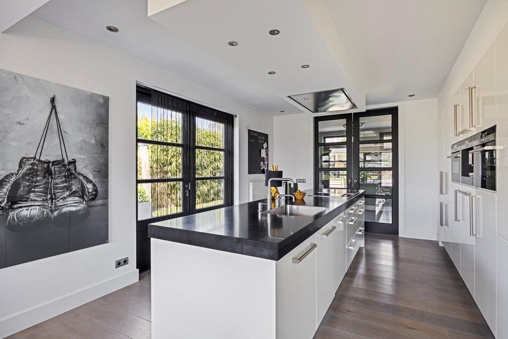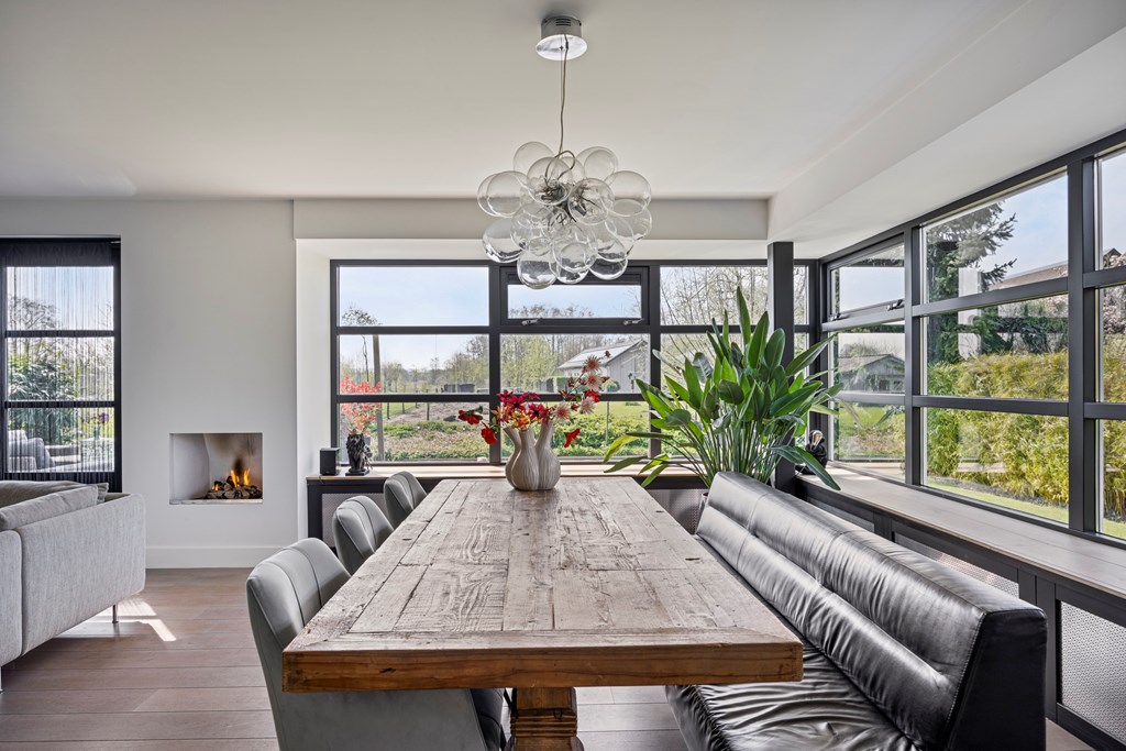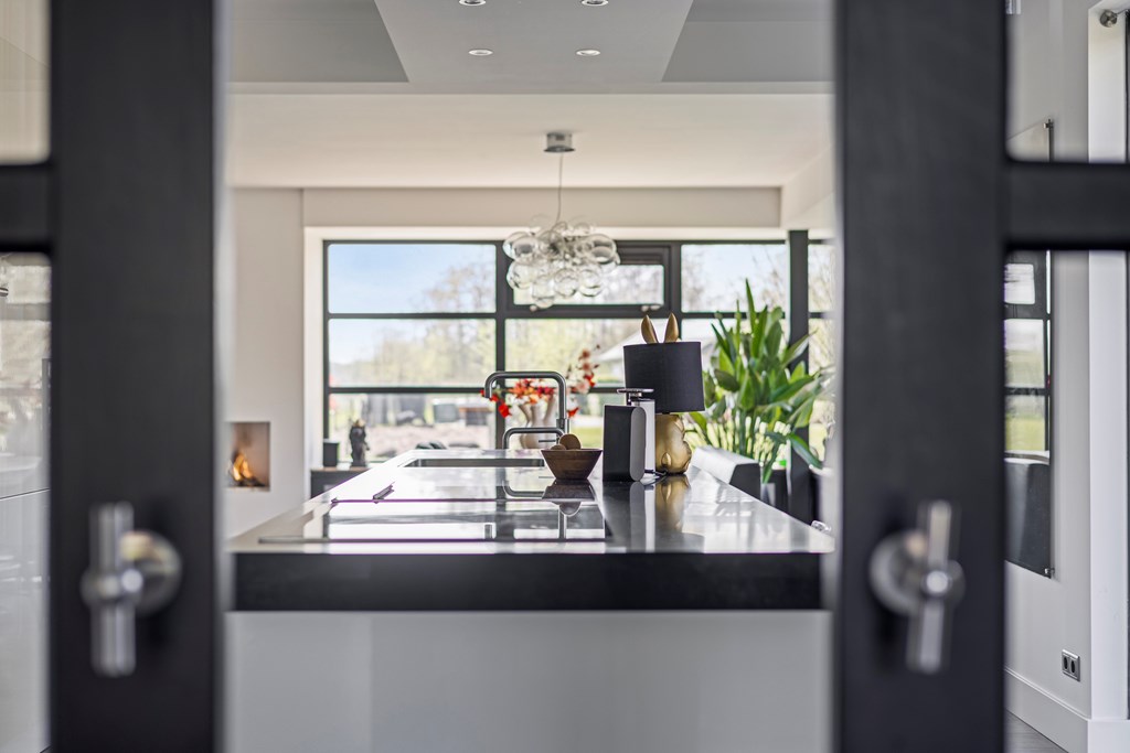 What an entrance! The hall is spacious, bright, and sleekly finished, with a handsome steel staircase with natural stone treads leading up, space for a cloak area, and access to the modern WC and the luxurious bathroom. From here you enter the living room, where the view immediately captures your attention. Large windows and French doors to the garden flood the room with light and frame a lush panorama. The seating area is generously sized, with a cosy fireplace as a focal point. On the other side you’ll find the luxury kitchen with cooking island—clean, modern, and fully fitted with every built-in appliance you could wish for, including a coffee machine, oven/microwave, steam oven, teppanyaki plate, and a Quooker. Cooking here is a joy. The kitchen also has French doors to the garden. The adjoining dining room comfortably accommodates a large table—perfect for long meals with family and friends. There is also a spacious utility room with storage and laundry connections. Everything is finished in warm, neutral tones with an eye for detail.