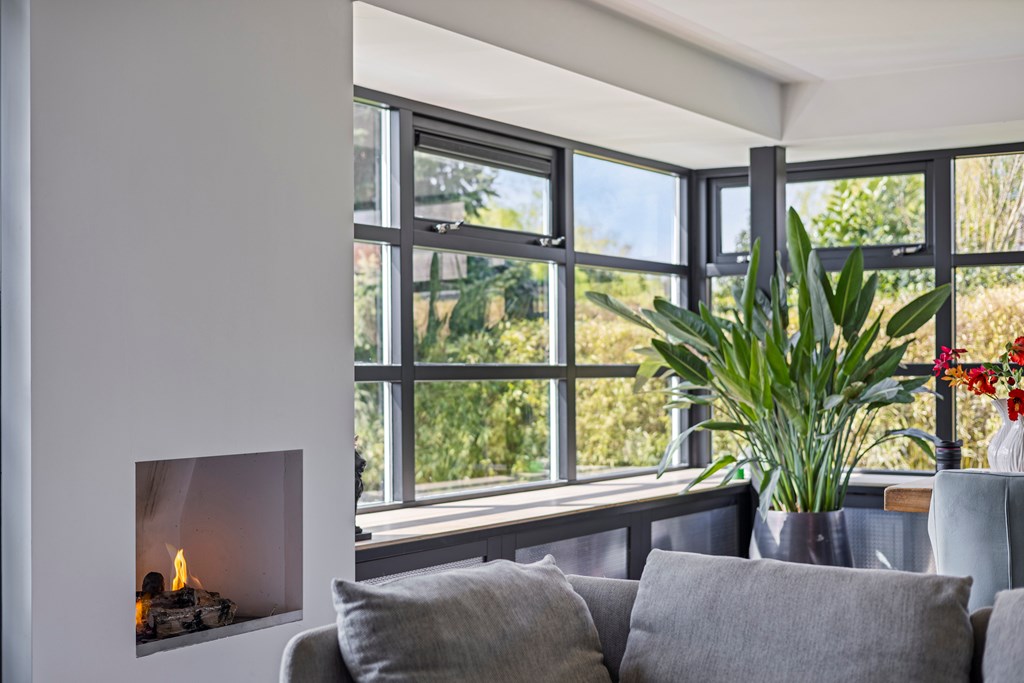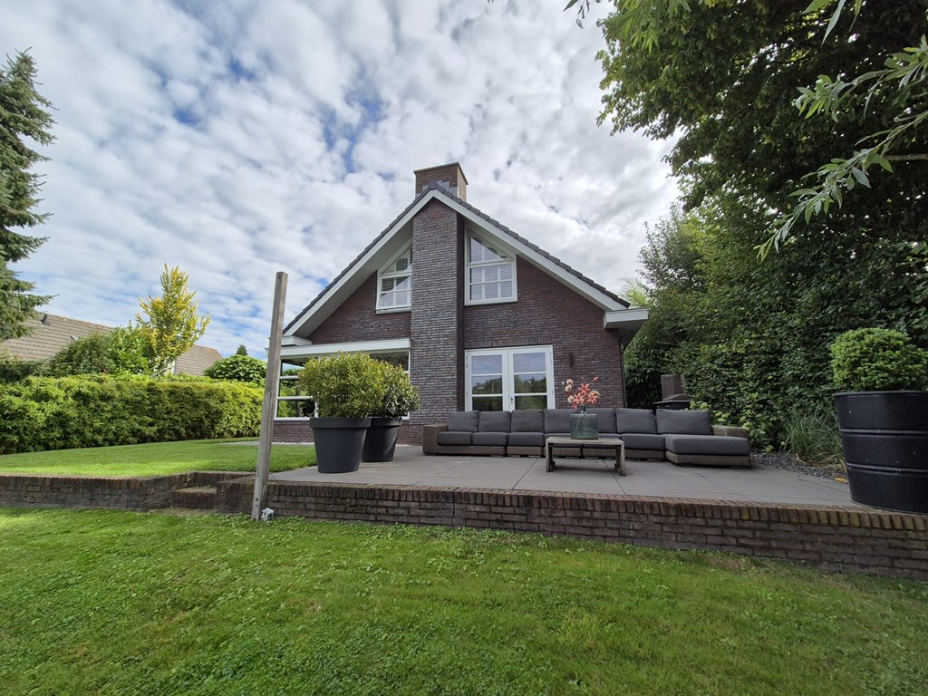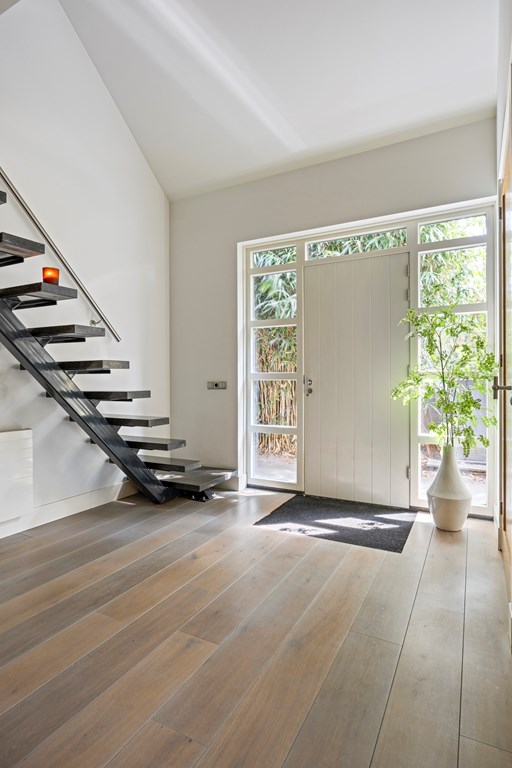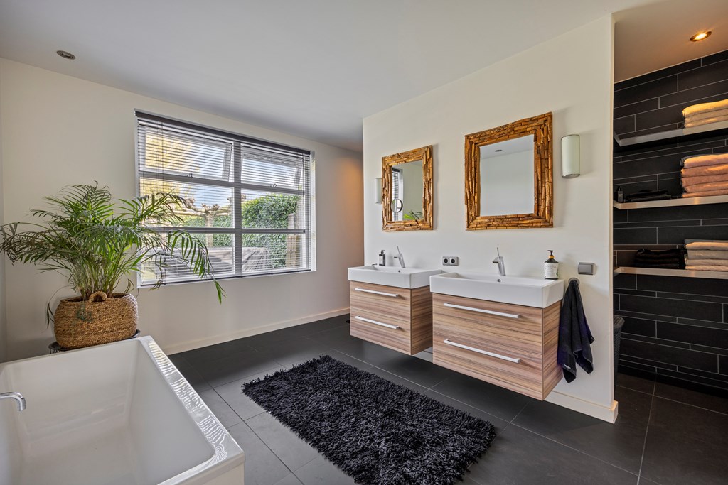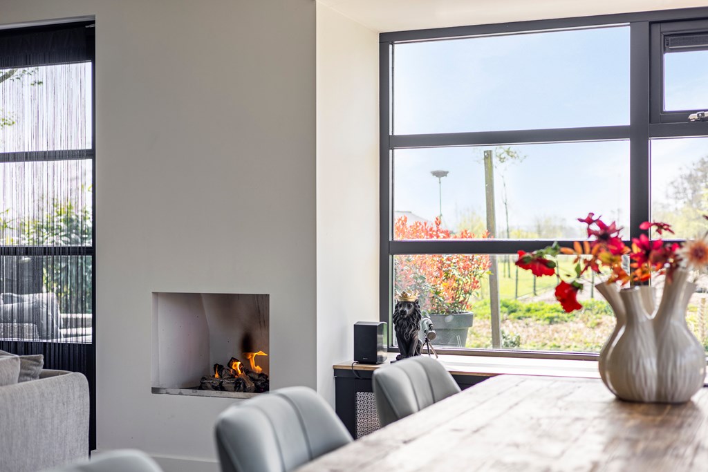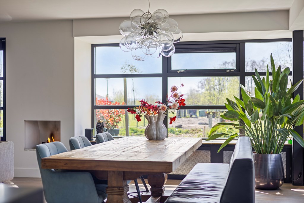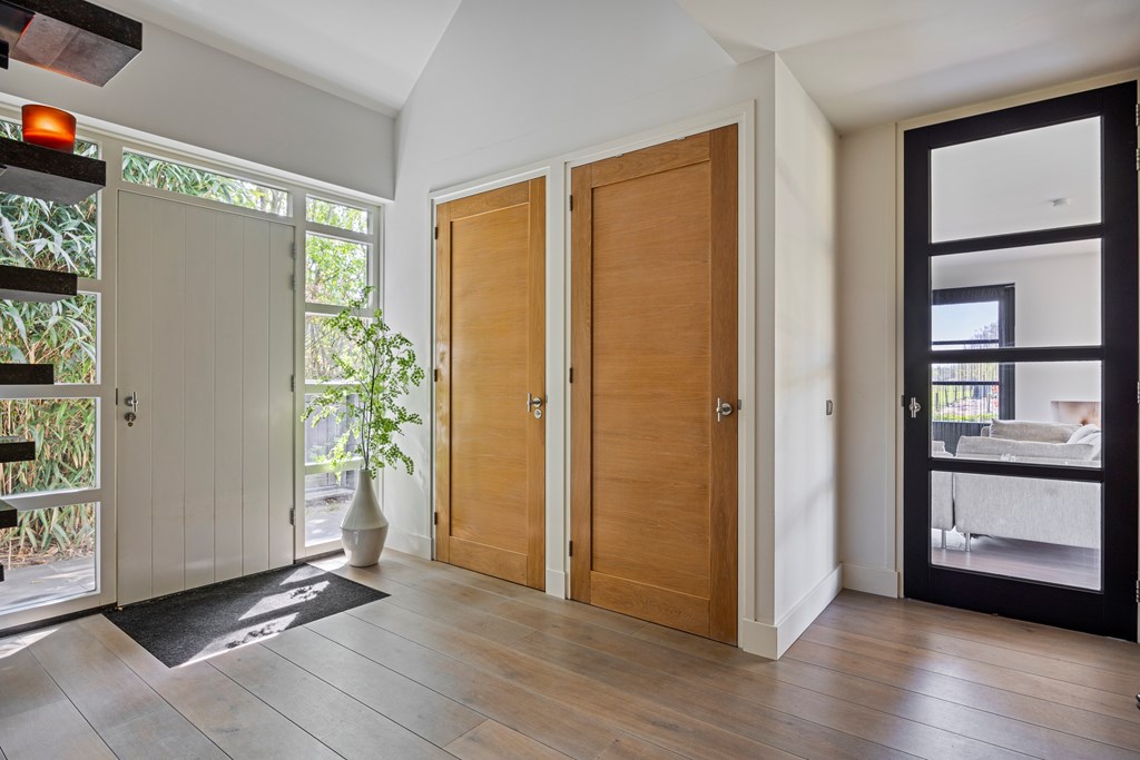 What an entrance! The hall is spacious, bright, and sleekly finished, with a handsome steel staircase with natural stone treads leading up, space for a cloak area, and access to the modern WC and the luxurious bathroom. From here you enter the living room, where the view immediately captures your attention. Large windows and French doors to the garden flood the room with light and frame a lush panorama. The seating area is generously sized, with a cosy fireplace as a focal point. On the other side you’ll find the luxury kitchen with cooking island—clean, modern, and fully fitted with every built-in appliance you could wish for, including a coffee machine, oven/microwave, steam oven, teppanyaki plate, and a Quooker. Cooking here is a joy. The kitchen also has French doors to the garden. The adjoining dining room comfortably accommodates a large table—perfect for long meals with family and friends. There is also a spacious utility room with storage and laundry connections. Everything is finished in warm, neutral tones with an eye for detail.