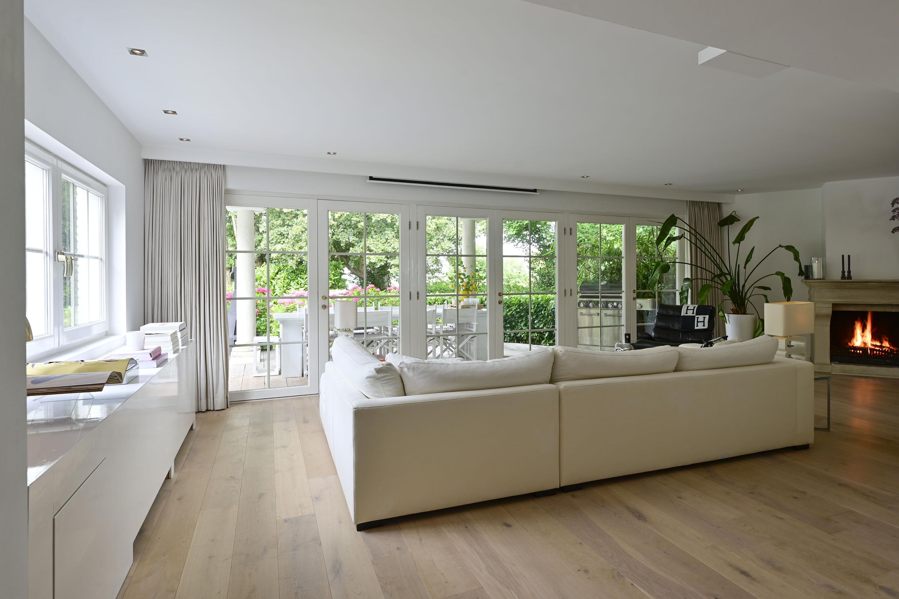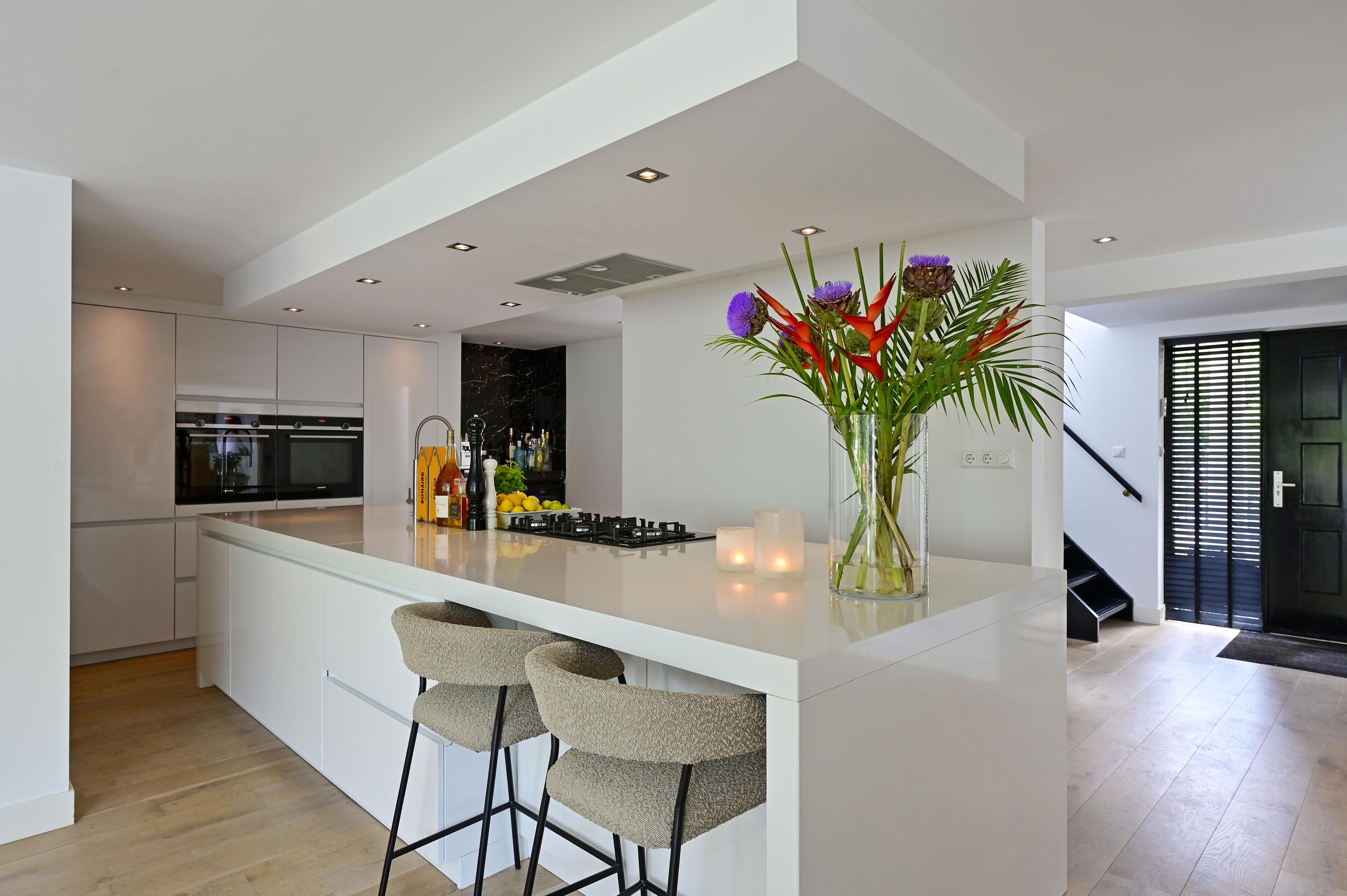 Inside, the home offers a spacious and bright living area where the kitchen, dining room and living room flow seamlessly together. The luxurious open-plan kitchen with cooking island is equipped with high-end Siemens built-in appliances, including two ovens, two dishwashers and two wine climate cabinets. Adjacent are a practical utility room and a modern office with a stylish pivot door.