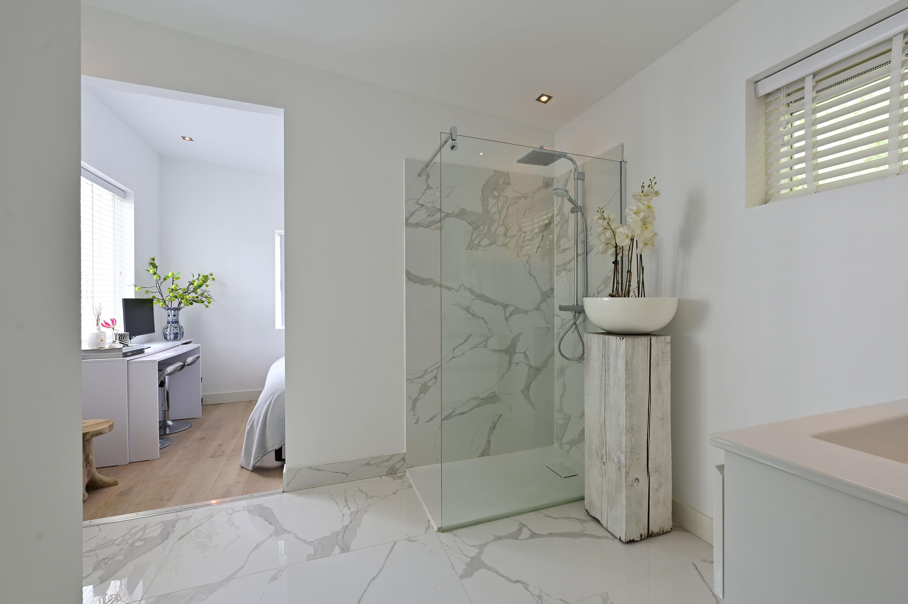 The villa features three spacious bedrooms, each with its own bathroom. Two bedrooms are located on the ground floor, making the home suitable for single-level living. The first floor is arranged as a generous master suite with bedroom, lounge area, walk-in closet and luxurious bathroom. This floor can easily be divided into two rooms.