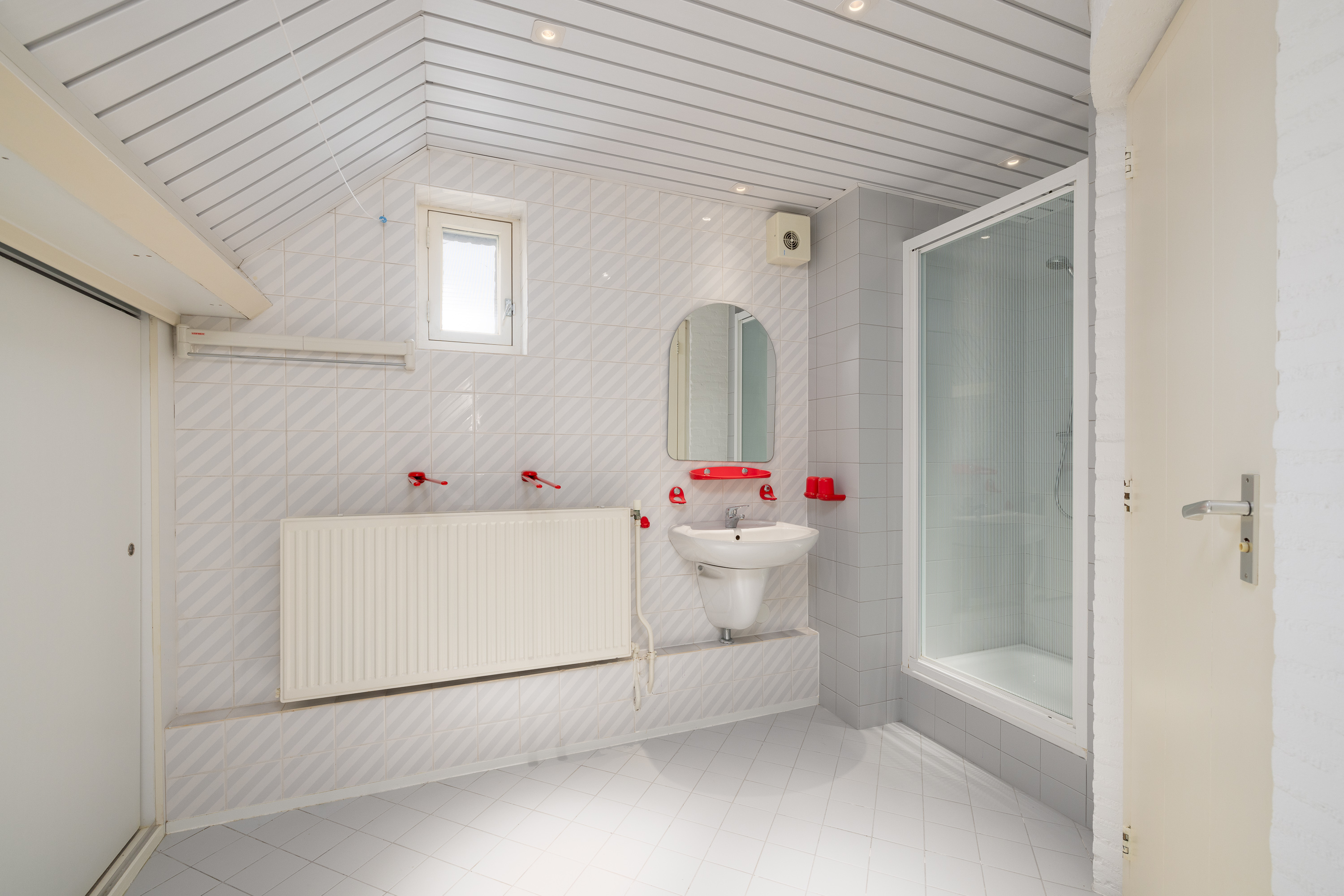 The bathroom at the rear has a small sauna. The second bathroom is equipped with a walk-in shower, connections for washing appliances, and a separate toilet.
