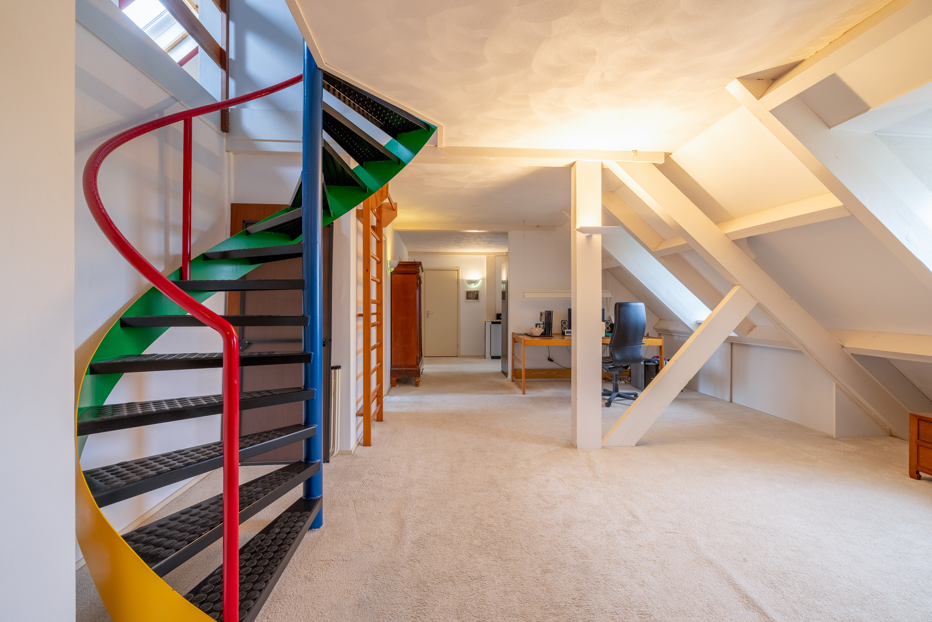 The spiral staircase leads to the second floor. Here are two additional bedrooms, ideal as guest rooms or a home office. There is also plenty of storage space.