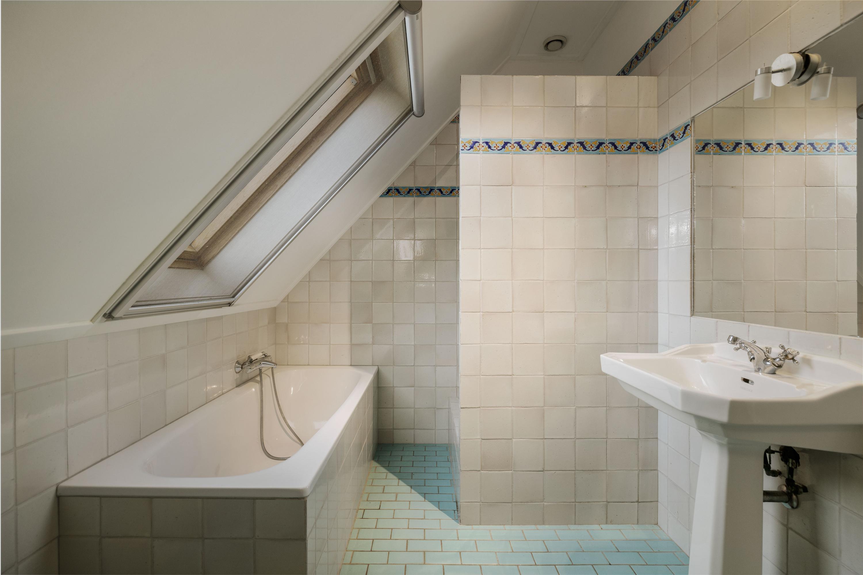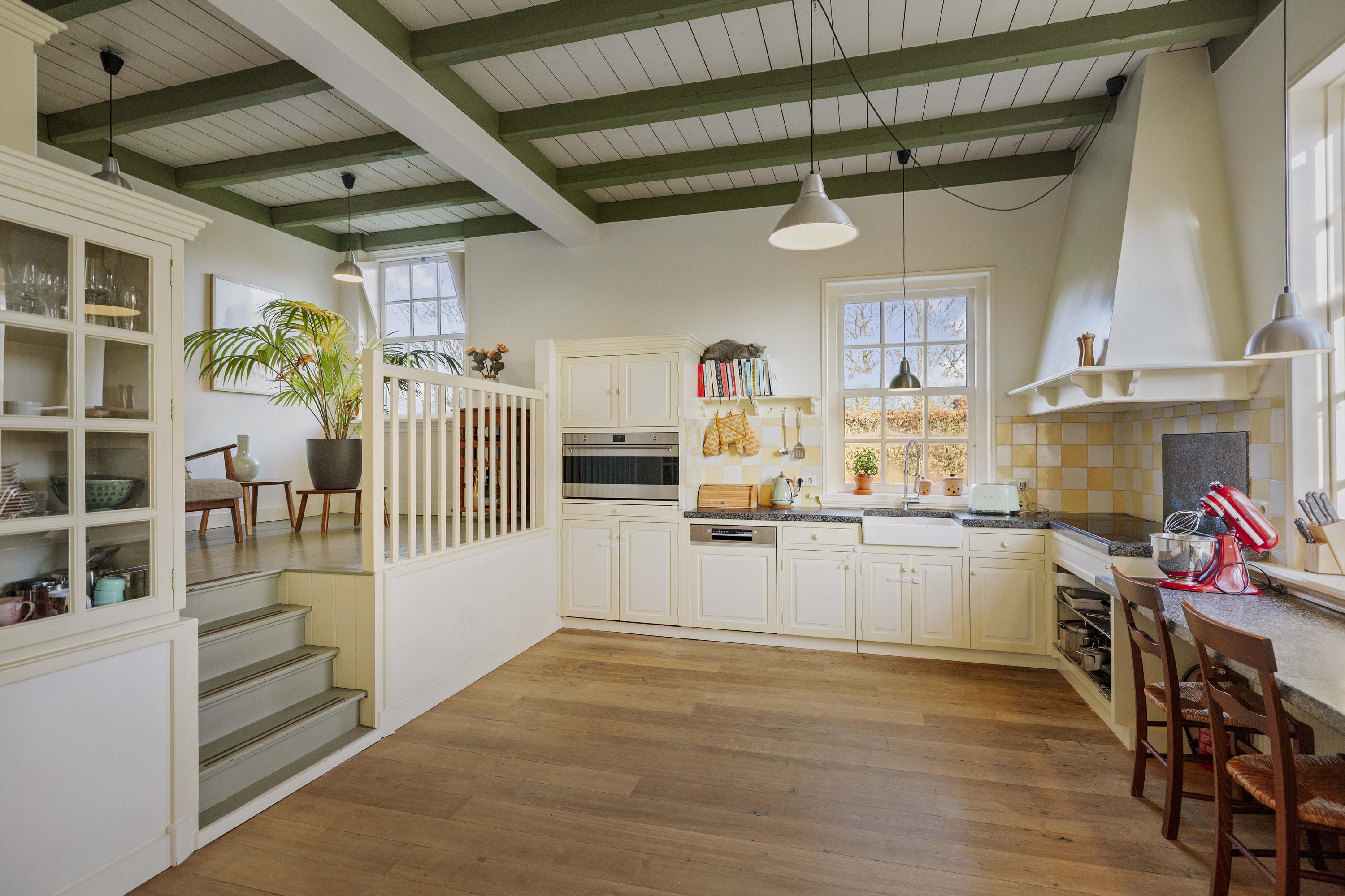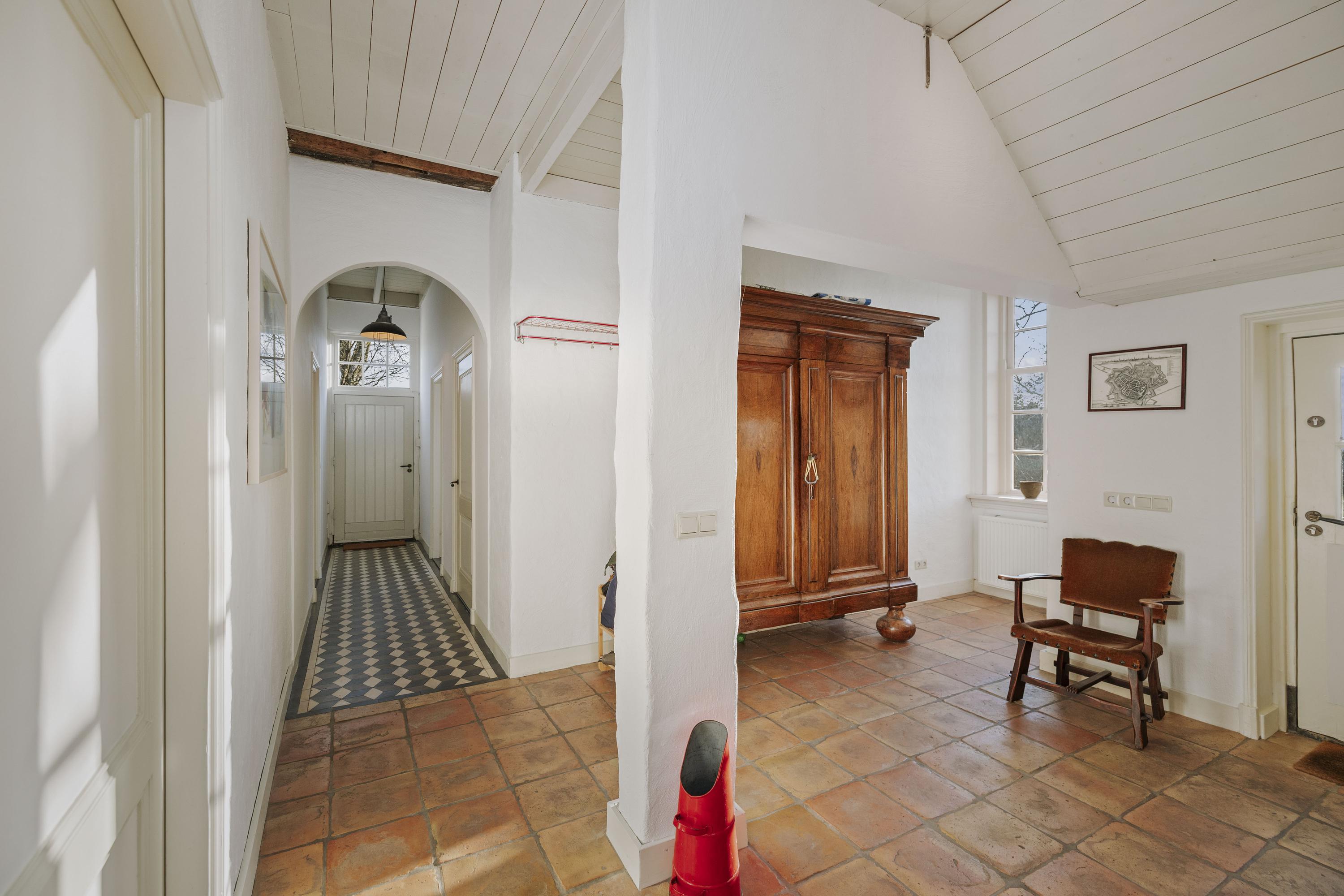 The gravel driveway leads us to the barn. In the Achterhoek region, it is customary to enter the house from the rear, and the entrance is located at the back of the house, offering impressive views of the surrounding farmland. The classic layout has been preserved in the program, as the traditional front door is also located at the front. The hall, with its high ceilings, is sunny and spacious, and the floor is covered with traditional terracotta tiles, which are so typical of this region. The formal hall is decorated with black and white decorative tiles, which contrast beautifully with the fresh white walls and cream-colored woodwork. The hall provides access to the toilet and bathroom on the ground floor, the dining room, the basement, and the upstairs room, which is currently used as an office with a pantry but would also be perfect as a guest room.