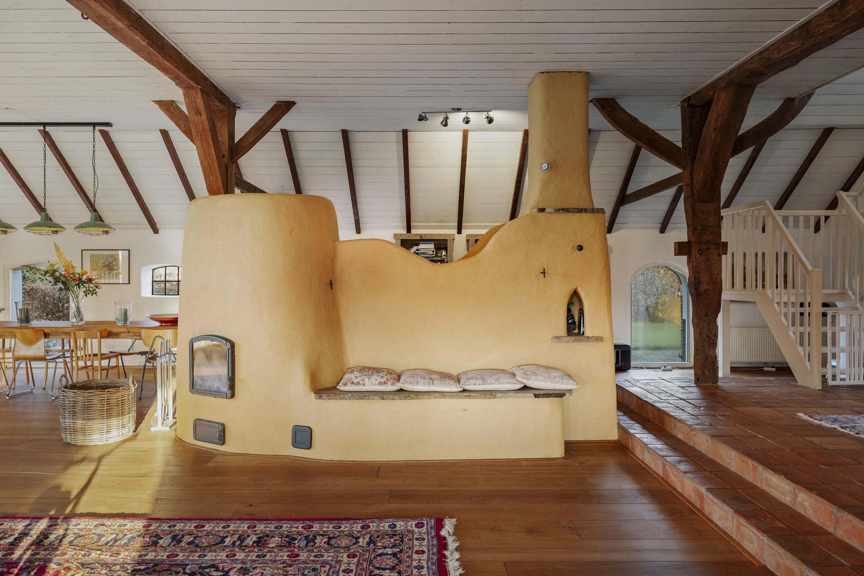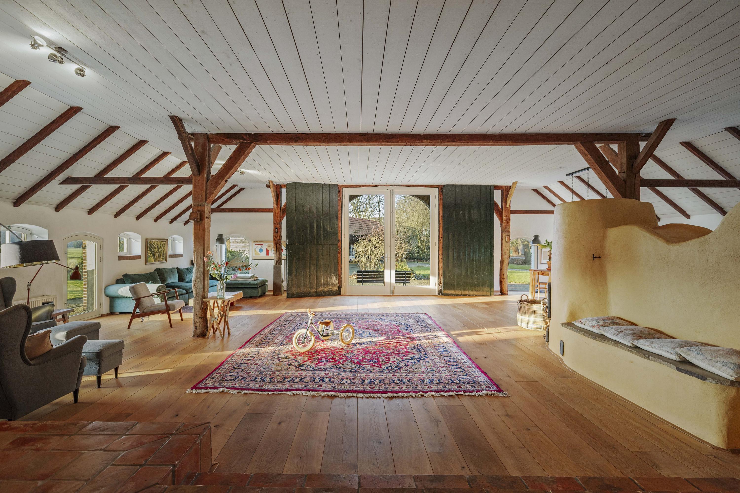 The barn is a fantastic space: over 150 m² of living space, brimming with atmosphere and rural charm. The floor is covered with oak planks and the old trusses still stand proudly in the room. In the heart of the space is a beautiful clay stove. These stoves are loved for their efficient heating, because in addition to keeping the living room warm, they also heat the water. The barn doors—the opening is now filled with glass—have been moved back on the inside and are a reminder of the barn's former function, as this is where the cows used to stand.