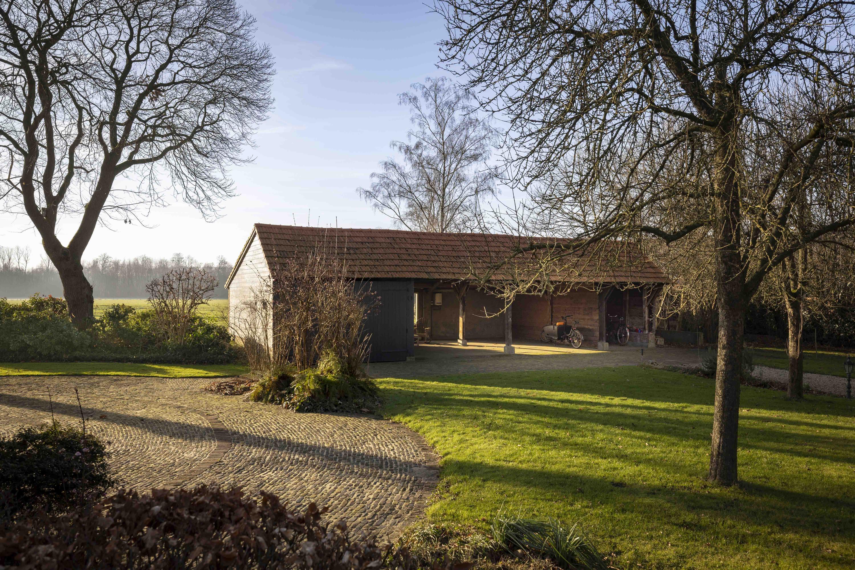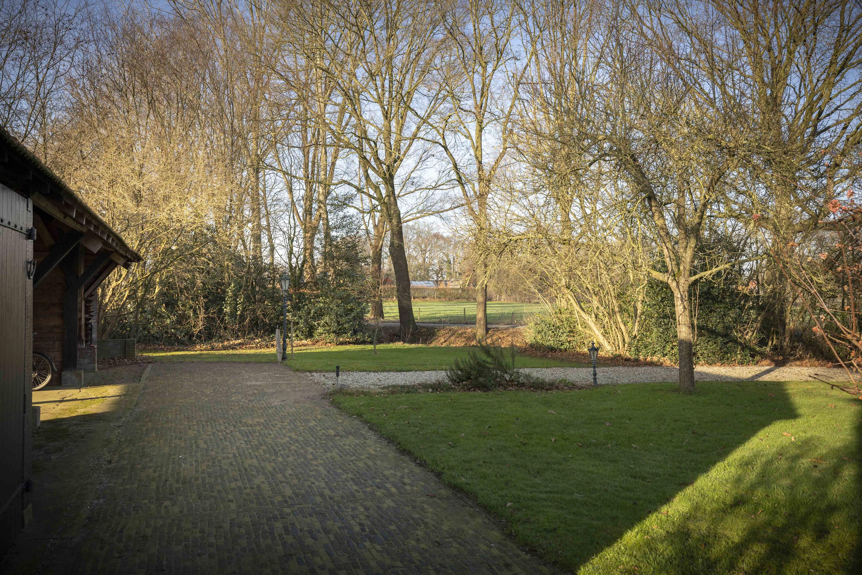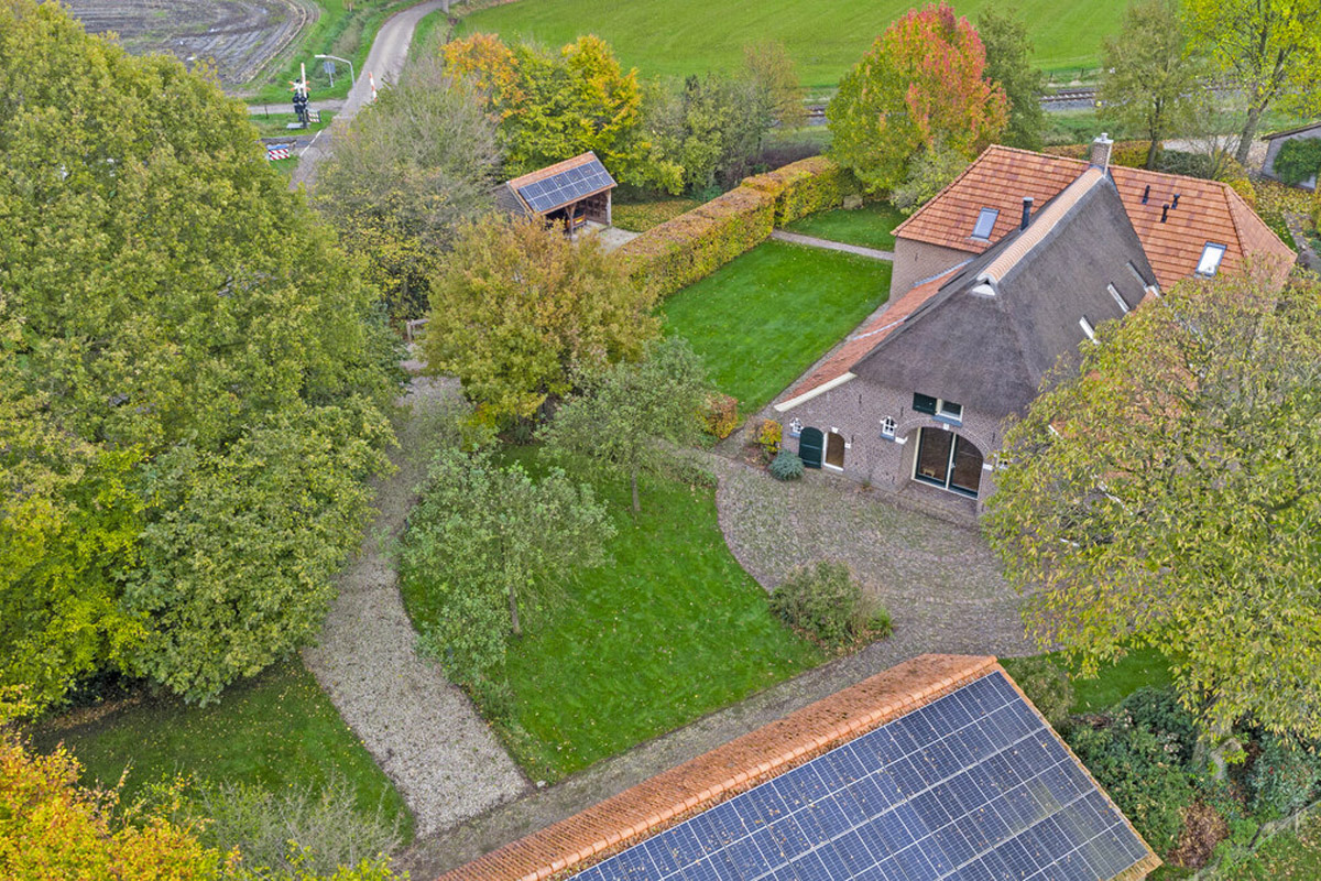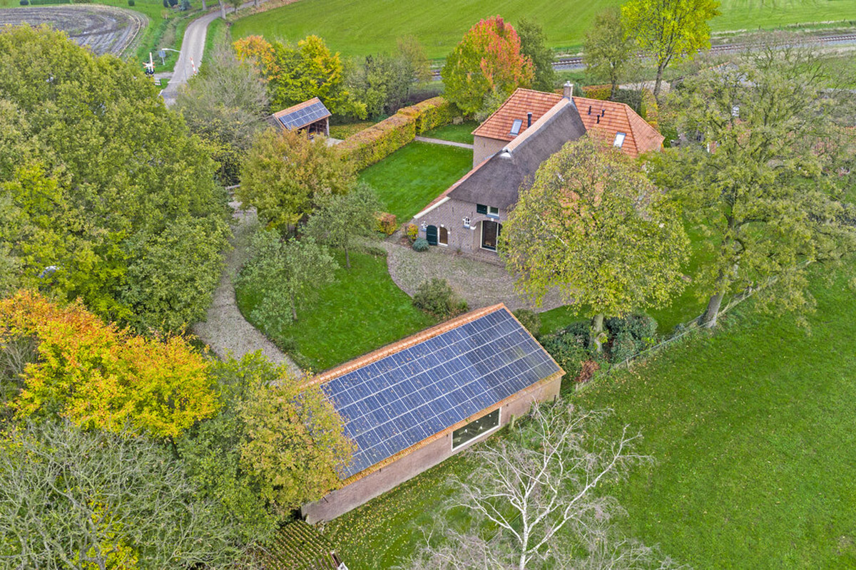 The house is surrounded by a beautiful garden. There is a shed with a carport and a lockable garden tool shed at the rear (with 39 solar panels on the roof - nicely out of sight), so the cars stay dry, as do the garden tools. There is also a second wooden outbuilding (with 6 solar panels on the roof), built in a rustic style with clapboard siding, old Dutch roof tiles, and sturdy trusses. The outbuilding offers space for parking two cars. Due to the orientation of the house, there is a lovely sun terrace behind the property. There are large lawns at both the front and rear, and privacy is guaranteed by the man-sized beech hedges.