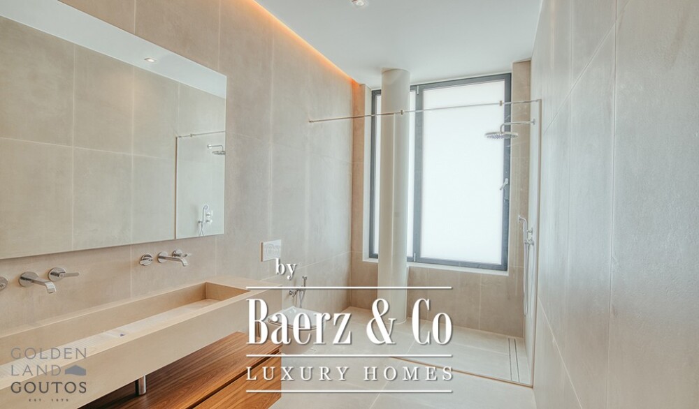 On the ground floor, 265 m² accommodate open-plan living and dining, a refined reception area, private office, contemporary kitchen with adjoining pantry, daily dining, and a wardrobe. Outdoor space is emphasized through a 60 m² terrace, a 112 m² pool, and a 280 m² landscaped garden, inviting serene moments in the Mediterranean sun.