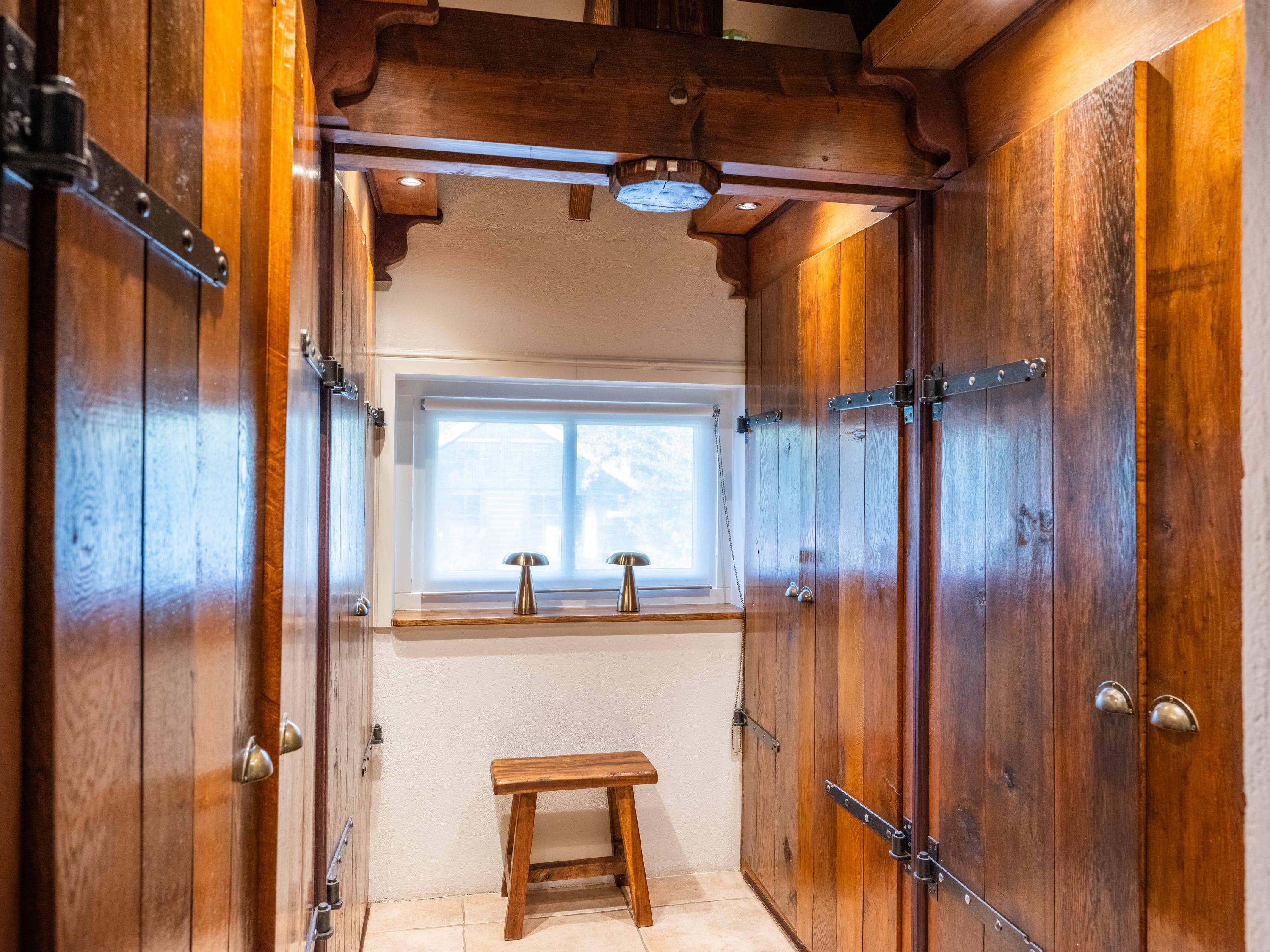 The staircase leads to a large open mezzanine overlooking the kitchen below. This area currently serves as a workspace and guest room, offering lovely views of the garden. Through the open passage, you enter the spacious bedroom, which boasts stunning views over the garden and the wide-open meadows beyond. Thanks to its favorable orientation, this room enjoys sunlight and tranquility throughout the day.