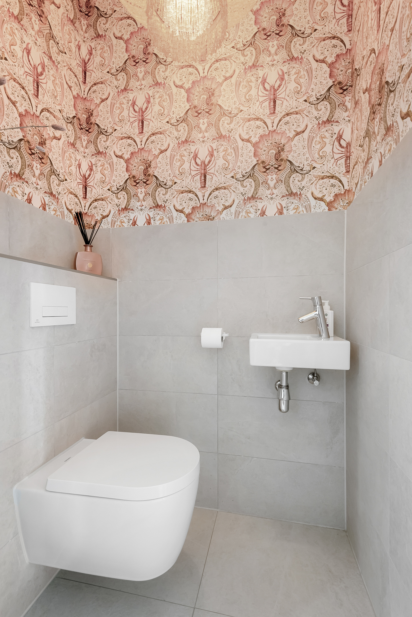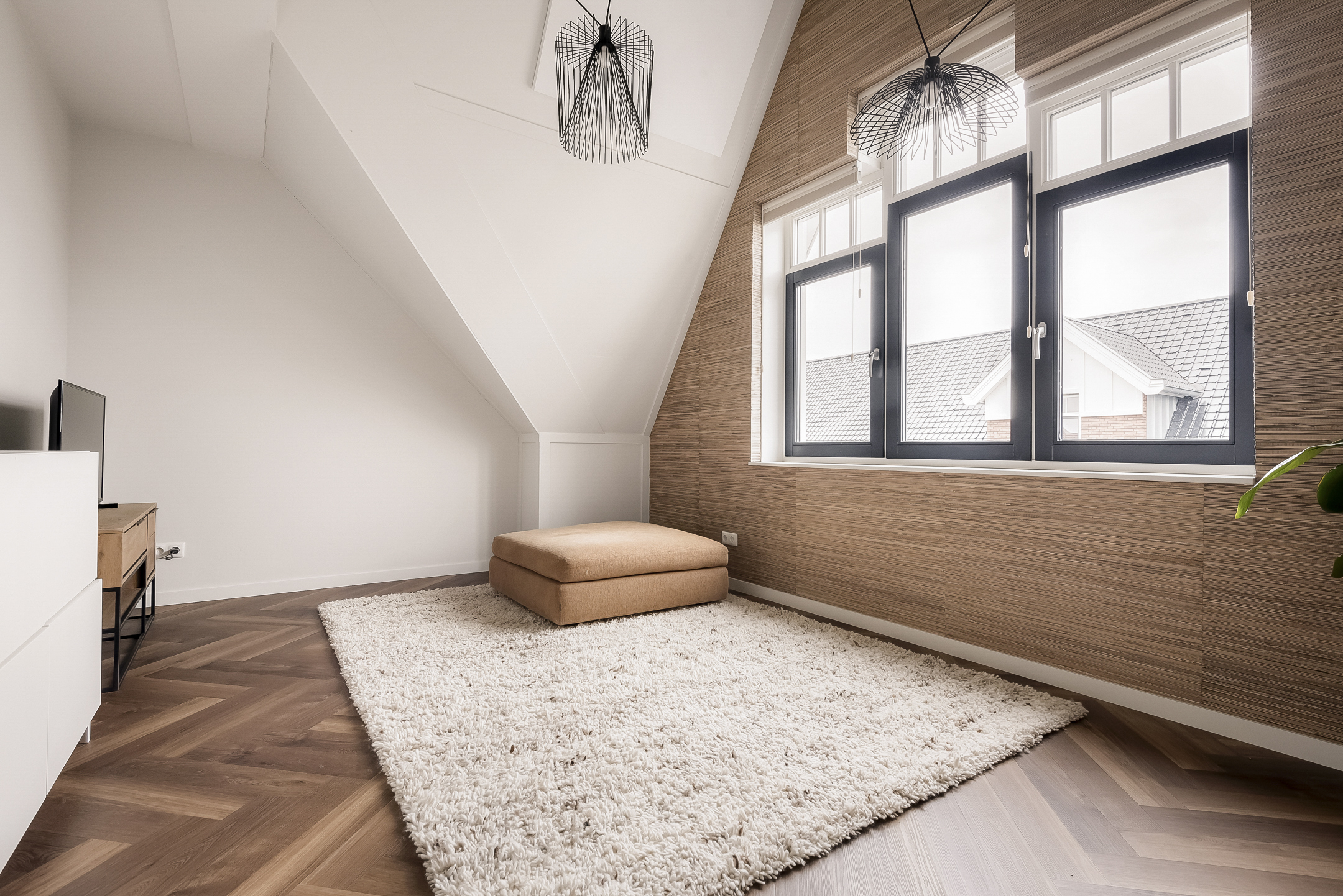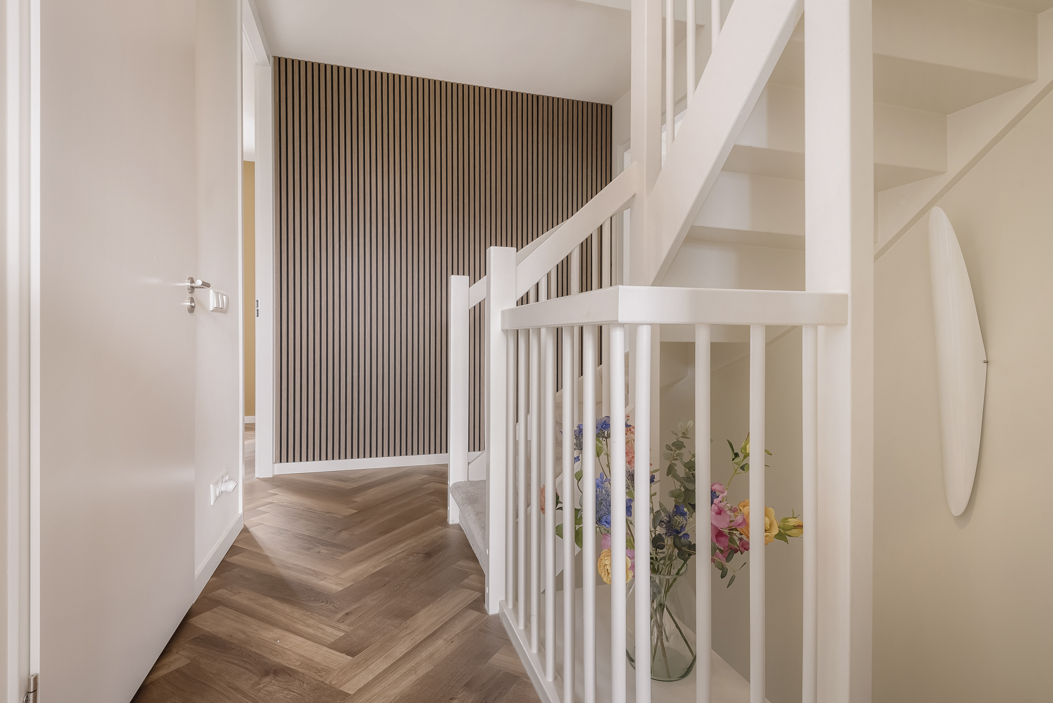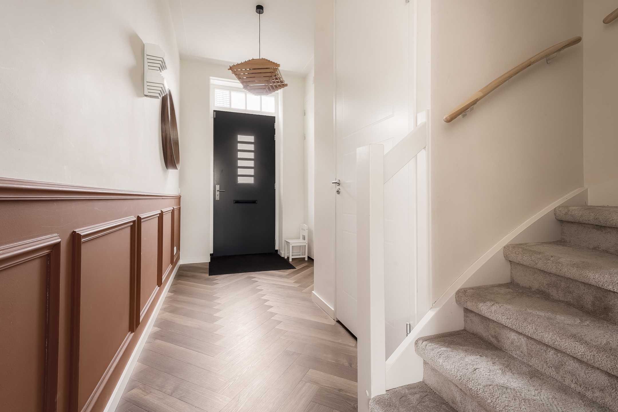 The entrance hall, with stylish wall paneling, a modern toilet and a meter cupboard, provides access to the bright living room and open-plan kitchen. The cozy living room is located at the front of the house.