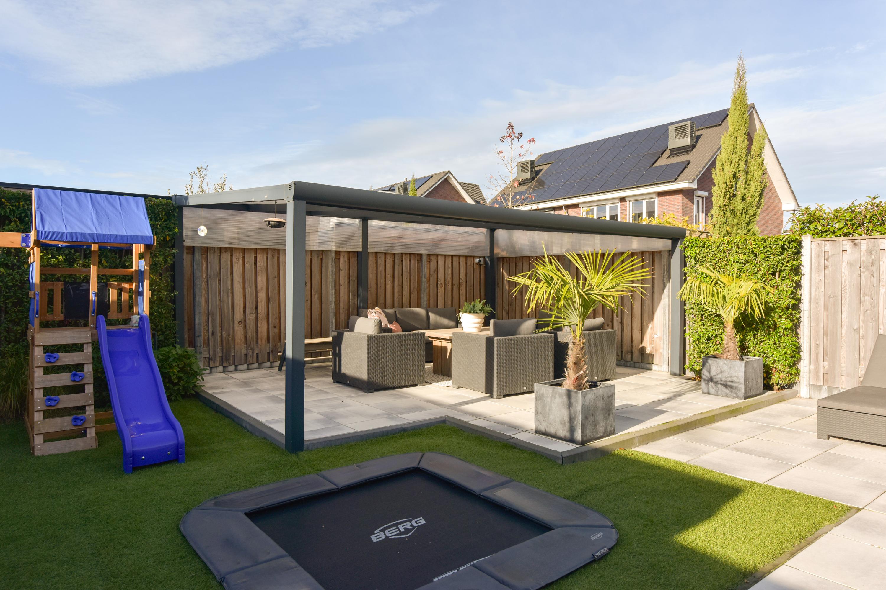 + West-facing garden with veranda, built-in trampoline, multiple terraces, and full irrigation system.