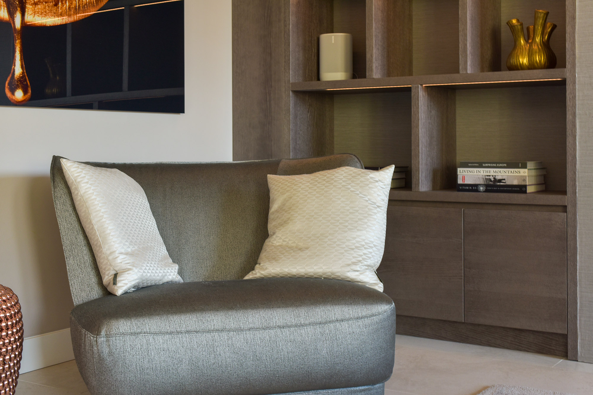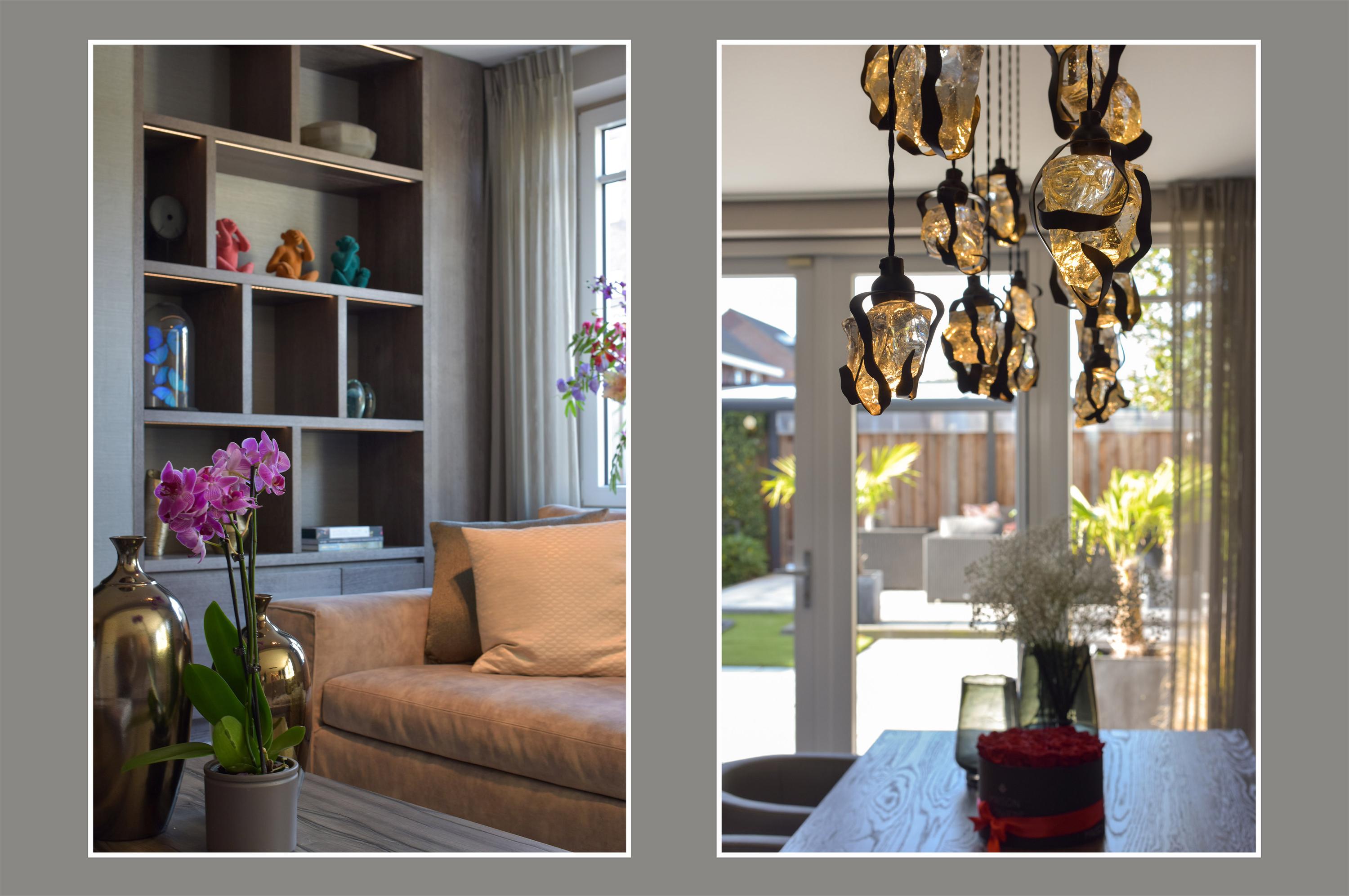 Opening this door reveals an impressively spacious and bright living room. Thanks to the extension at the rear—without a supporting column—the space feels completely open and uninterrupted. The custom-designed wall unit facing the garden perfectly combines design and functionality, with open shelves, concealed storage, a dedicated space for the TV, and a cozy bio-ethanol fireplace. All designed by Eric Kuster, whose style embodies cosmopolitan luxury, a balance of glamour and comfort, with rich materials, subtle color palettes, and layered textures, creating interiors as elegant as they are inviting, like a luxury hotel suite.