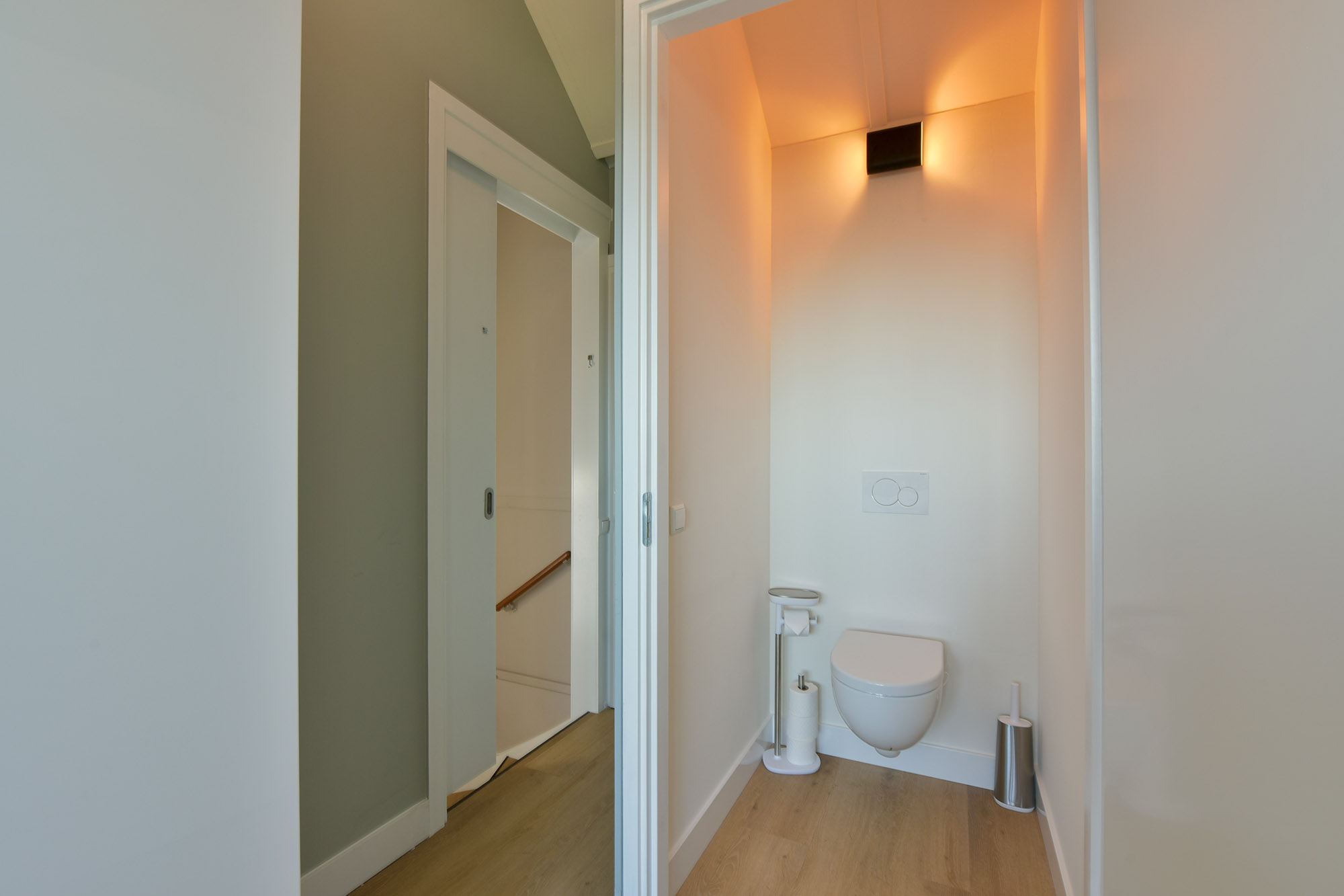 Inside, the representative hallway immediately showcases a thoughtful layout. The wardrobe is cleverly concealed in a large built-in closet, keeping coats, shoes, and bags out of sight, giving the hall a sleek and organized look. Here, you also find a modern guest toilet with a small basin, the meter cupboard with reinforced connections, and the staircase to the first floor. The steel pivot door is a striking feature, giving a first glimpse of the luxurious finishes that continue throughout the home.