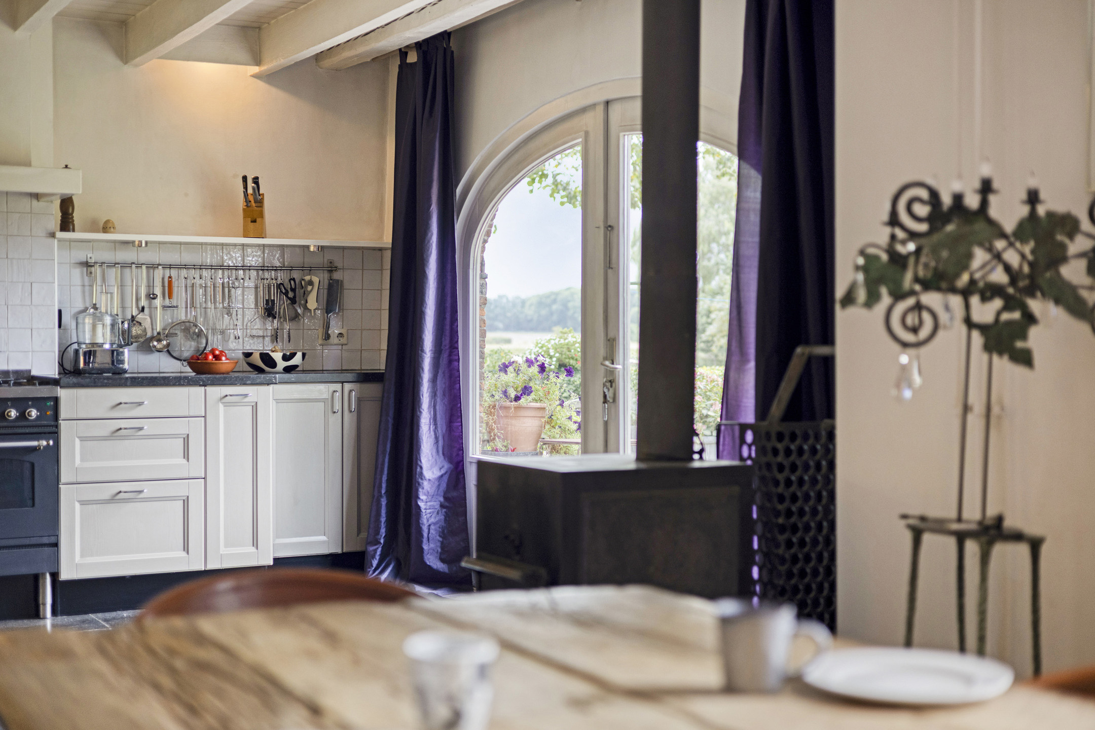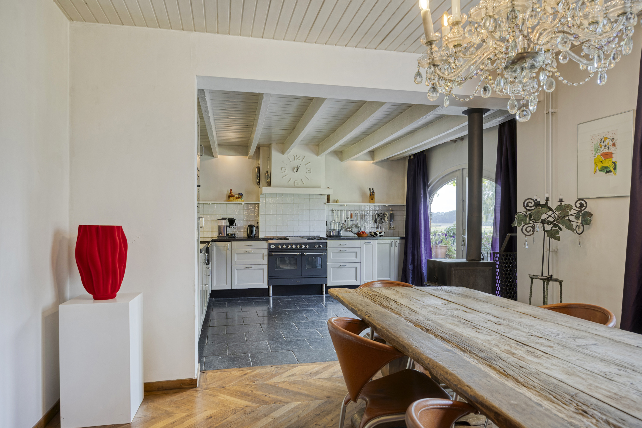 Spacious kitchen-diner featuring a corner-installed fitted kitchen with natural stone worktop and double sink, built-in gas hob, refrigerator, microwave, dishwasher and extractor hood; also equipped with a wood-burning stove; tiled and plastered walls, oak herringbone floor partly combined with natural stone flooring; ceiling finished with wooden panelling and exposed beams; French doors to the garden/terrace;
