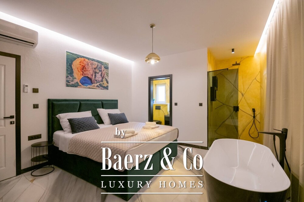 Upstairs, four bedrooms each feature private bathrooms and refined decor, articulating a sense of privacy and poise. Underfloor heating runs throughout via a heat pump, while electric blinds add a refined touch. Additional amenities include a two-car garage with electric vehicle charging, video surveillance, and a 43 m² summer kitchen with barbecue and indoor facilities.