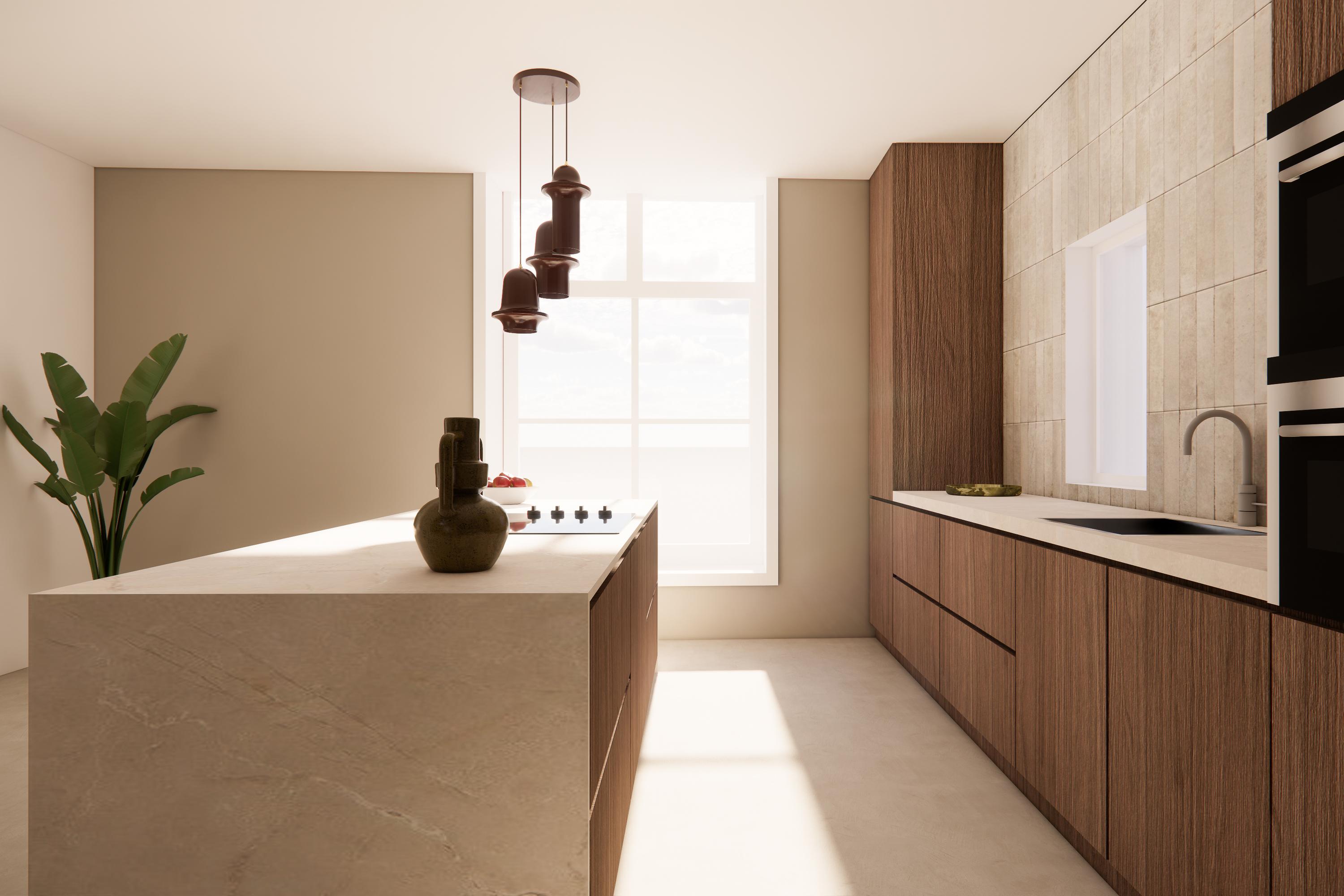 A spacious entrance leads into the kitchen and dining room. The impressive 17th-century beamed ceiling immediately sets the tone, while a high south-facing window floods the space with natural light. The kitchen (2020) features a large island and various built-in appliances and serves as the heart of this true live–work property. Adjoining the kitchen is a multifunctional studio of approx. 65 m², currently used as a photography and music studio.