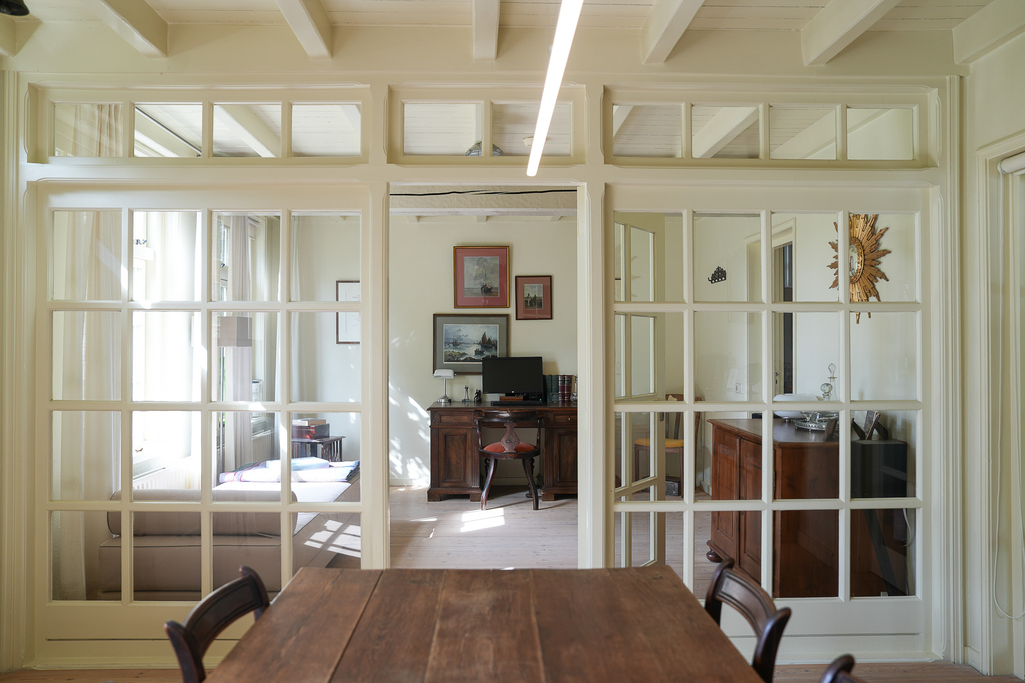 The entrance is located at the rear, by the elevated hardwood terrace. Through wide French doors with mullioned windows, you enter the impressive living space, where broad floorboards, a wood-fired stove, and large windows create a warm atmosphere.