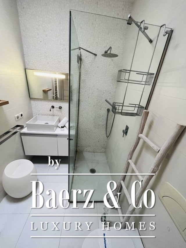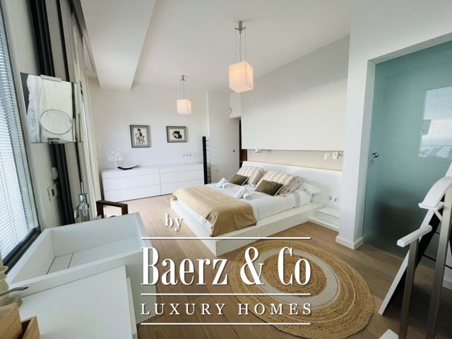 En la planta superior, una oficina en entreplanta se asoma sobre el espacio social; la planta más alta alberga una tranquila biblioteca o sala creativa, un dormitorio doble con baño en suite, y una terraza de 50 m² que se abre a vistas ininterrumpidas al mar. El sótano cuenta con gimnasio, sala de música, salón de estar con luz natural, amplio trastero y una suite de invitados con entrada independiente y terraza soleada.