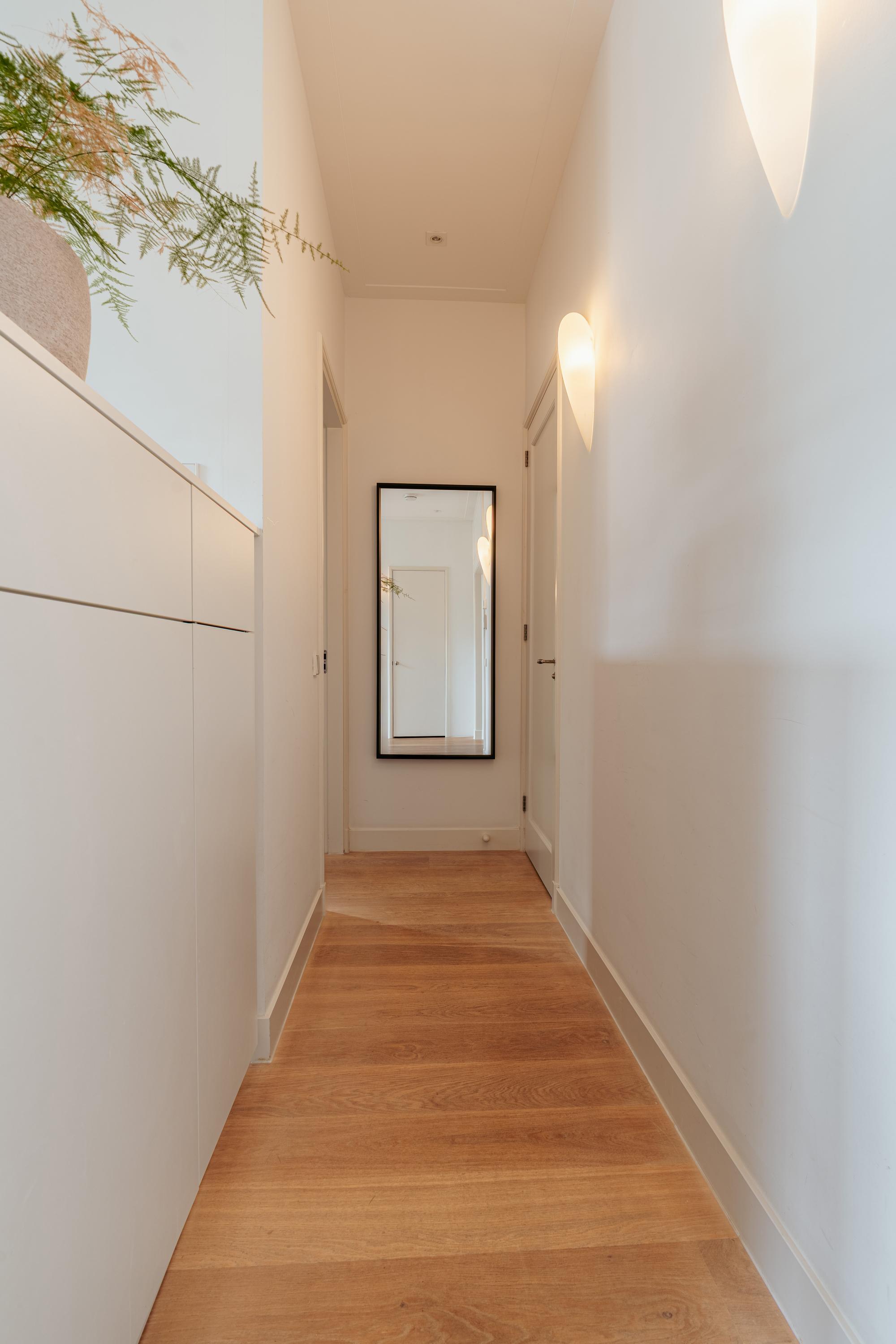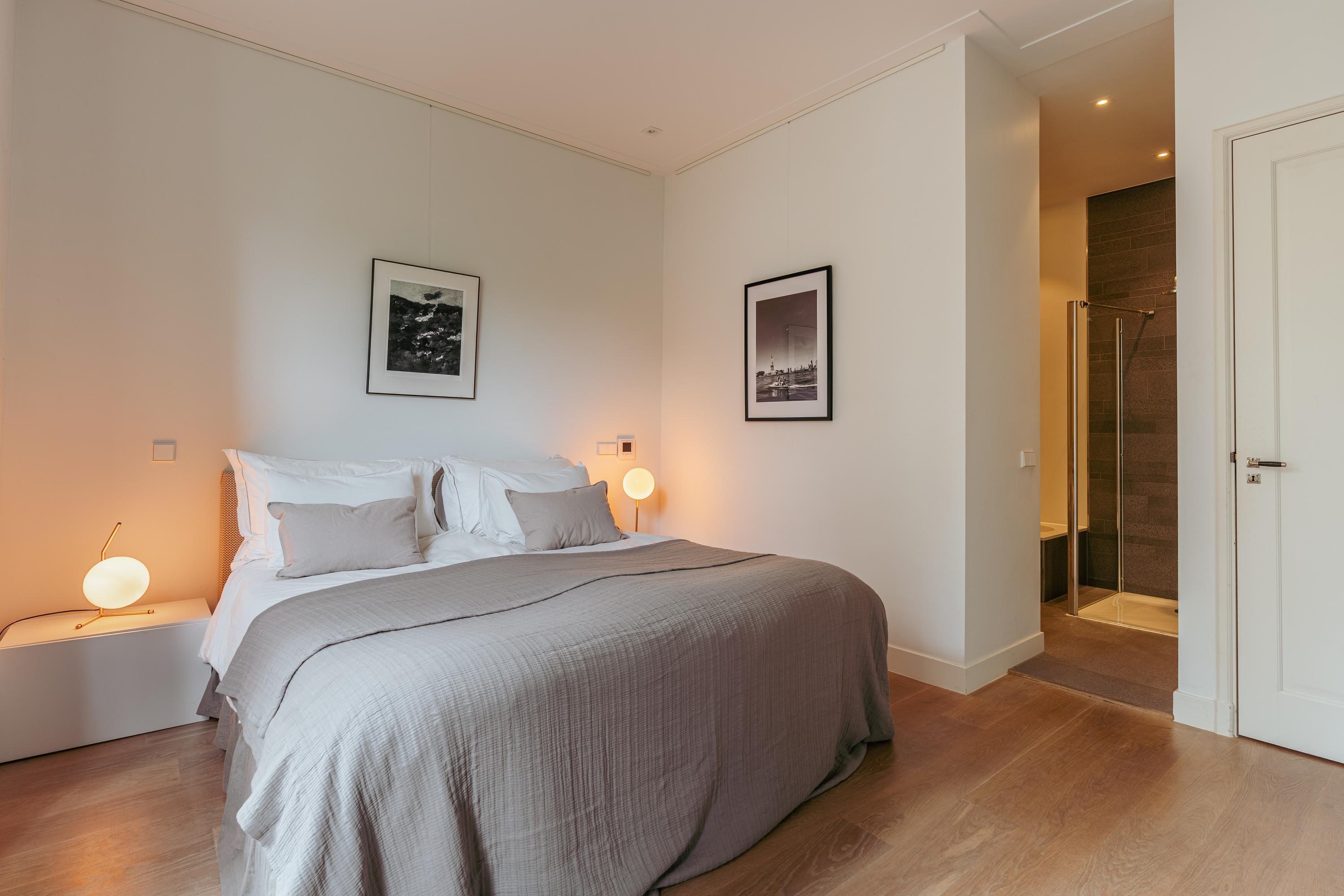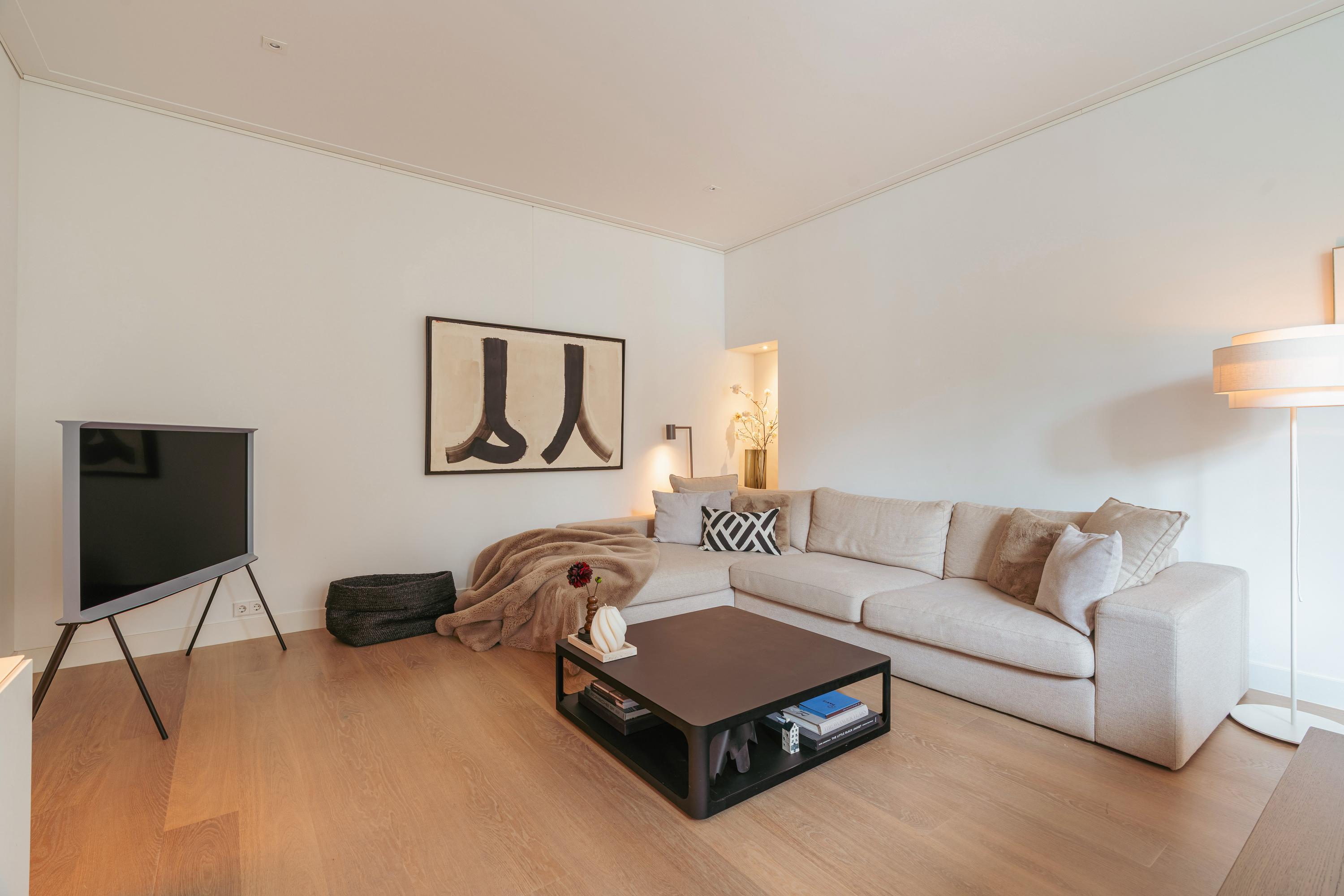 Dès l’arrivée, un décor raffiné se dévoile à travers le marbre, l’éclairage soigné et la noblesse du travail artisanal. L’espace est généreux et la cuisine ouverte entièrement moderne s’intègre parfaitement à l’ensemble, équipée d’appareils de qualité : plaque cinq feux, four combiné, réfrigérateur-congélateur, lave-vaisselle et robinet Quooker. Les rangements sur mesure et spots intégrés témoignent d’un souci du détail, tant pour le stockage que pour l’ambiance lumineuse. La chambre à coucher paisible bénéficie de placards toute hauteur et d’une baie vitrée qui encadre la quiétude animée de la rue ; la salle de bain attenante offre baignoire, douche italienne et branchements intégrés pour machine à laver, garantissant un luxe fonctionnel.
