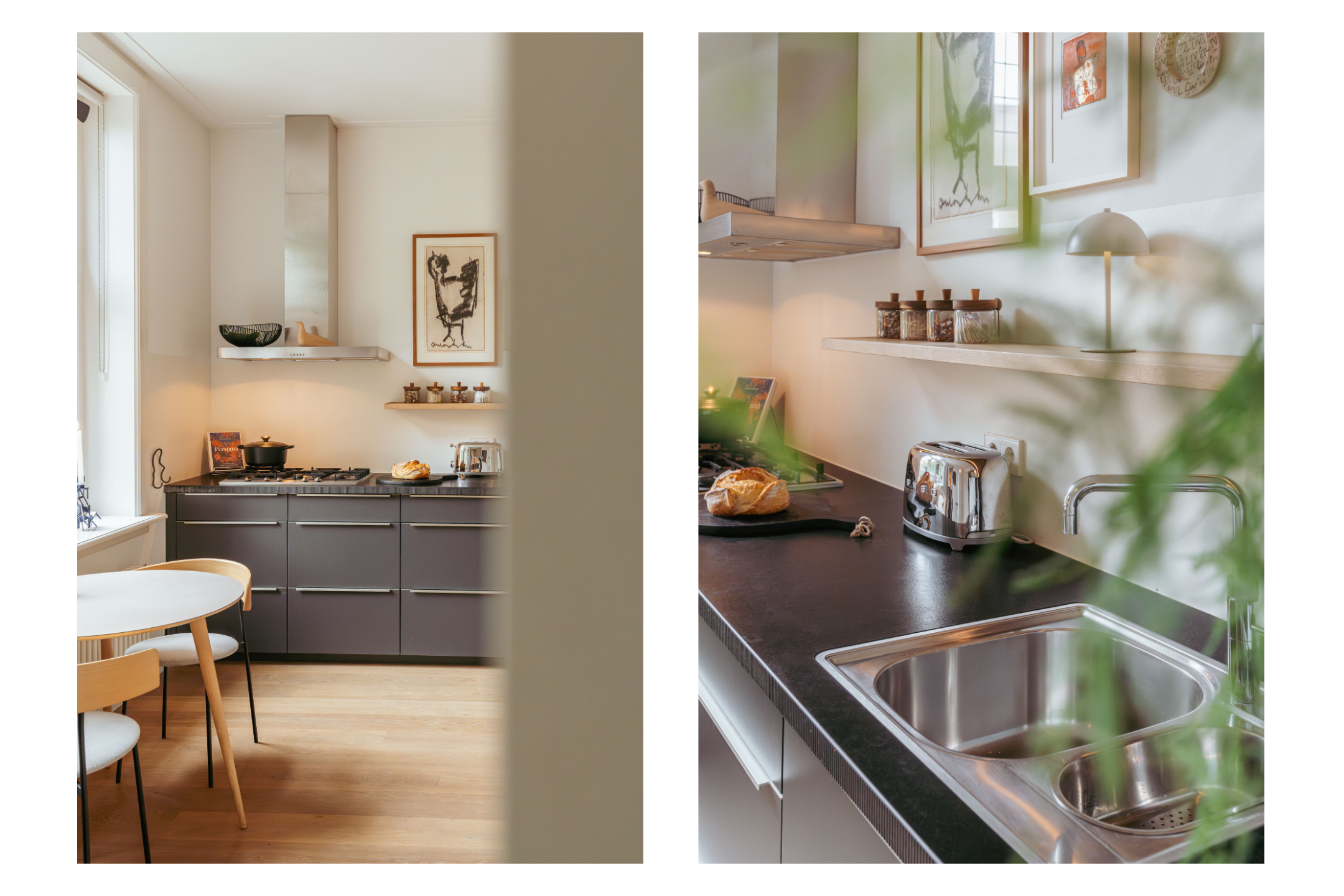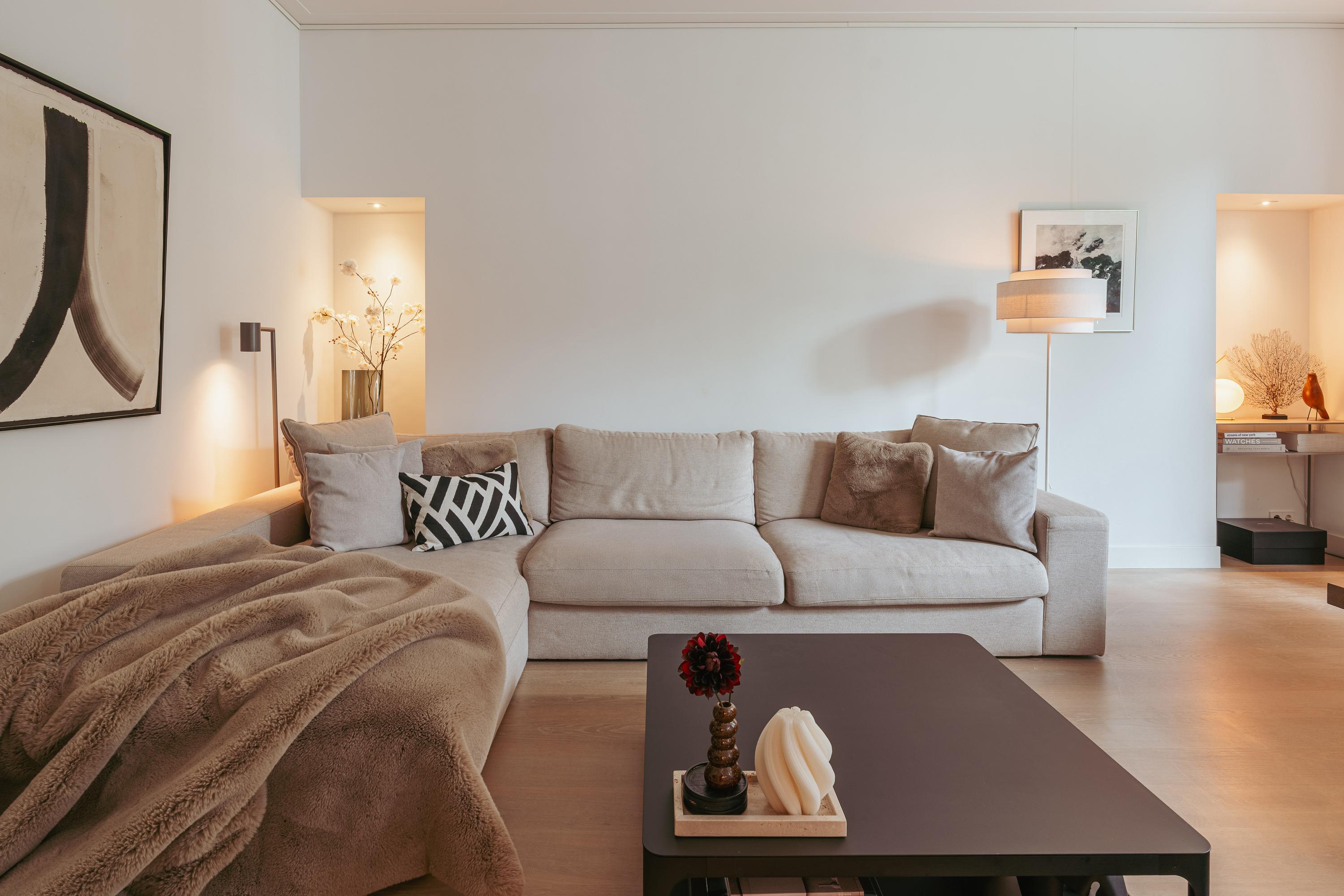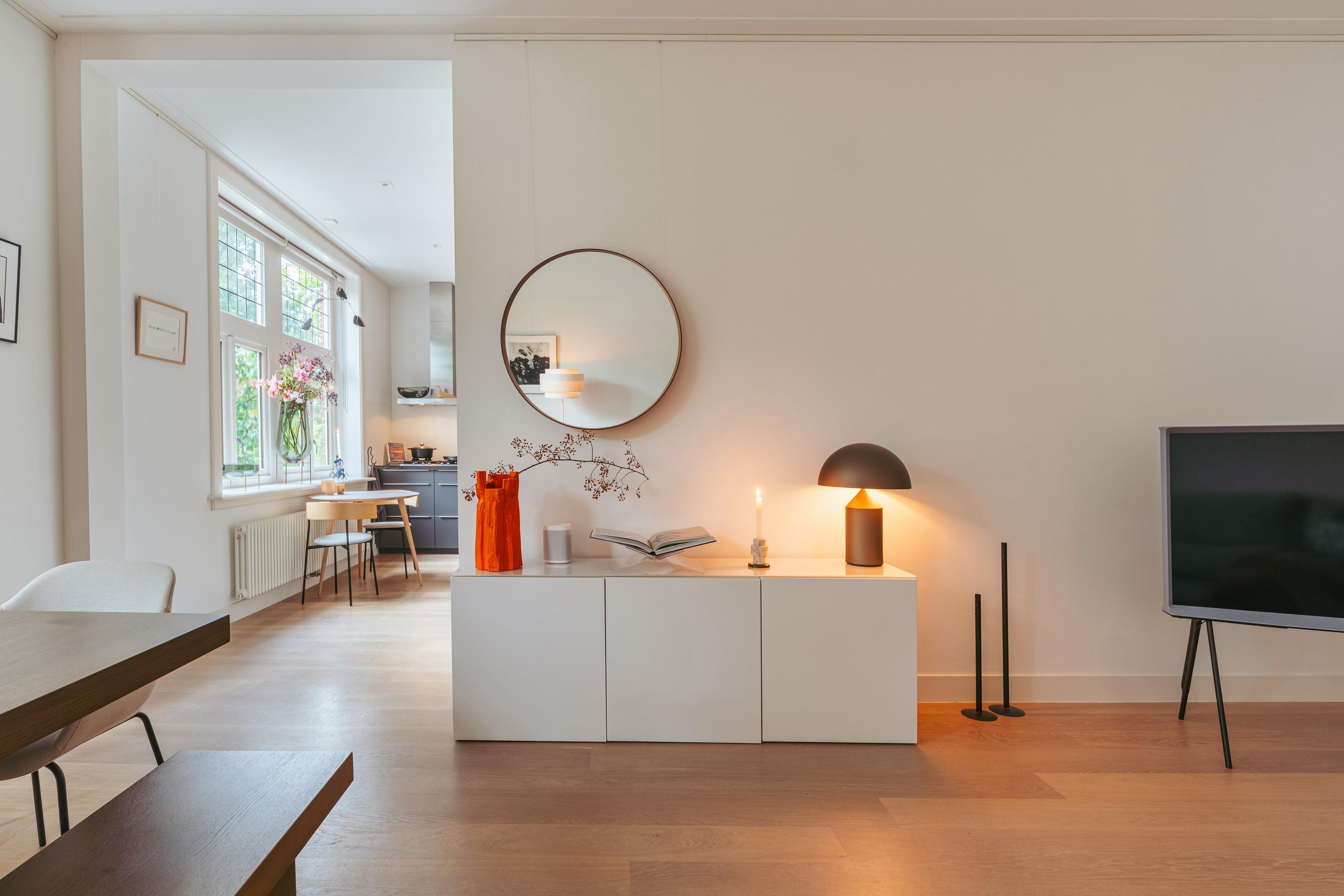 Dès l’arrivée, un décor raffiné se dévoile à travers le marbre, l’éclairage soigné et la noblesse du travail artisanal. L’espace est généreux et la cuisine ouverte entièrement moderne s’intègre parfaitement à l’ensemble, équipée d’appareils de qualité : plaque cinq feux, four combiné, réfrigérateur-congélateur, lave-vaisselle et robinet Quooker. Les rangements sur mesure et spots intégrés témoignent d’un souci du détail, tant pour le stockage que pour l’ambiance lumineuse. La chambre à coucher paisible bénéficie de placards toute hauteur et d’une baie vitrée qui encadre la quiétude animée de la rue ; la salle de bain attenante offre baignoire, douche italienne et branchements intégrés pour machine à laver, garantissant un luxe fonctionnel.