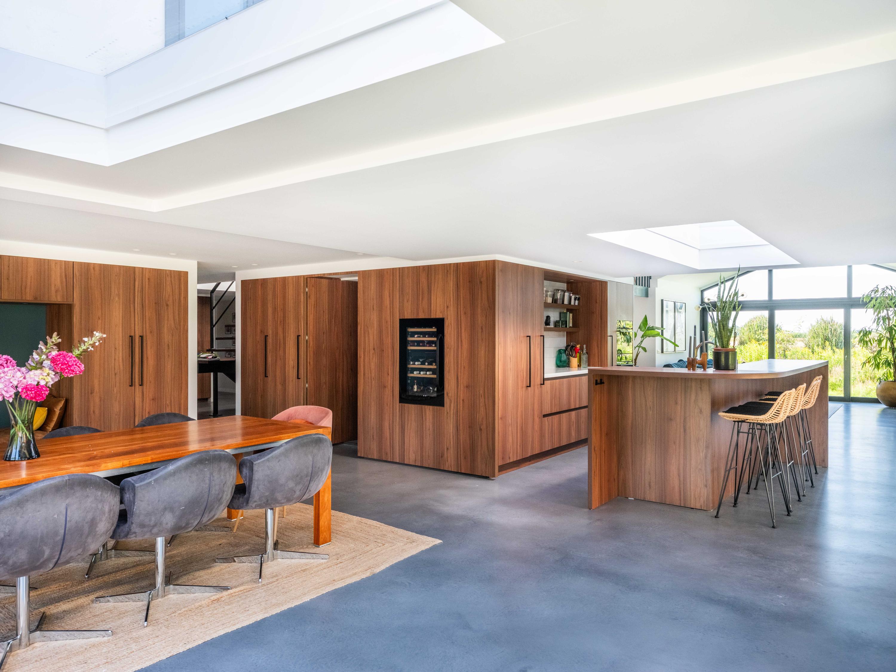 Le rez-de-chaussée baigné de lumière s’ouvre sur un hall d'entrée conçu sur mesure, un séjour chaleureux aux vues dégagées et une cuisine équipée d’appareils haut de gamme, d’une armoire à vin climatique et d’un mur architectural en noyer révélant un espace utilitaire dissimulé. La suite principale, également au rez-de-chaussée, dispose d’un dressing et d’une salle de bain type spa avec douche à l’italienne, baignoire, double vasque, chauffage au sol et accès direct à la quiétude du jardin.
