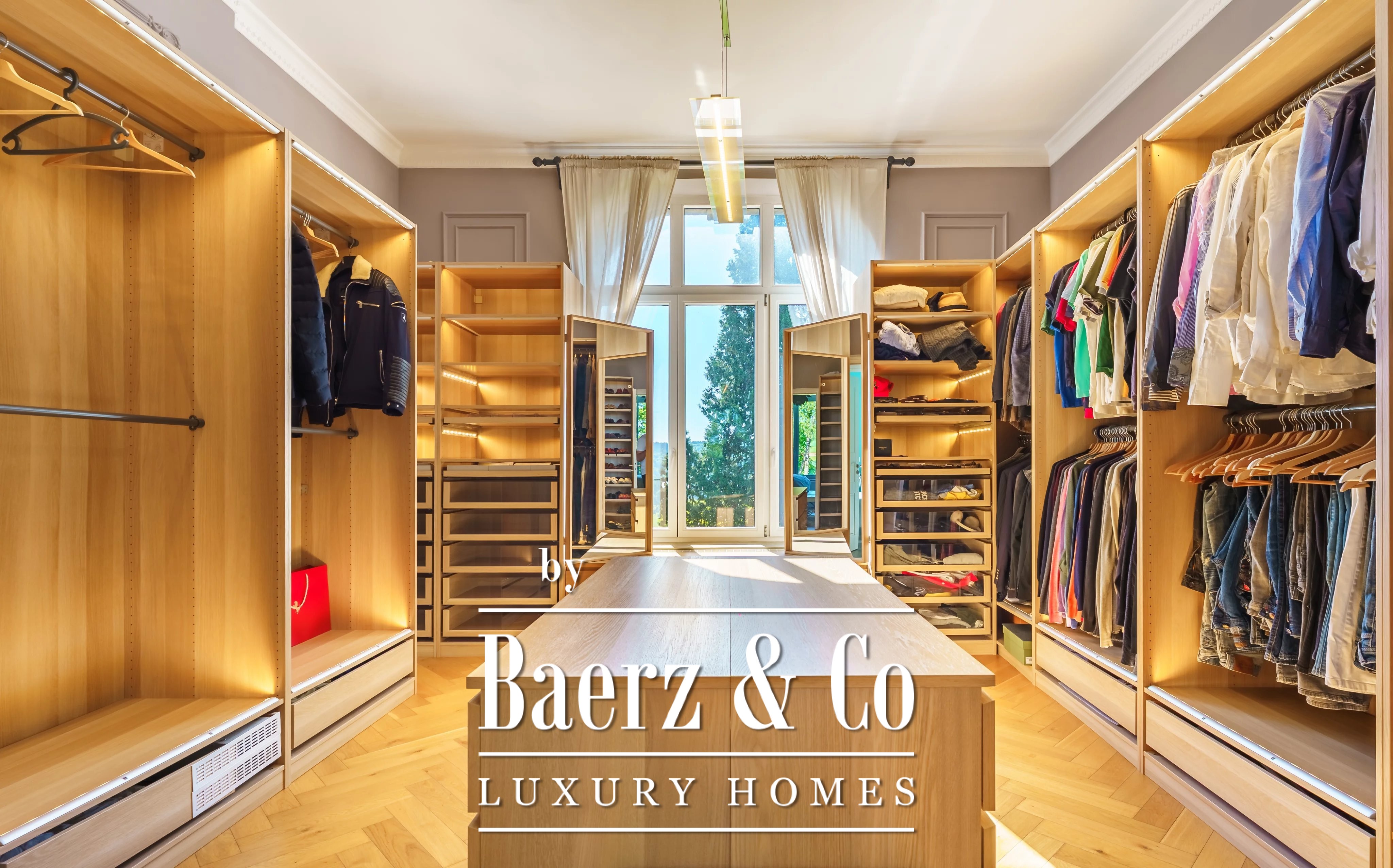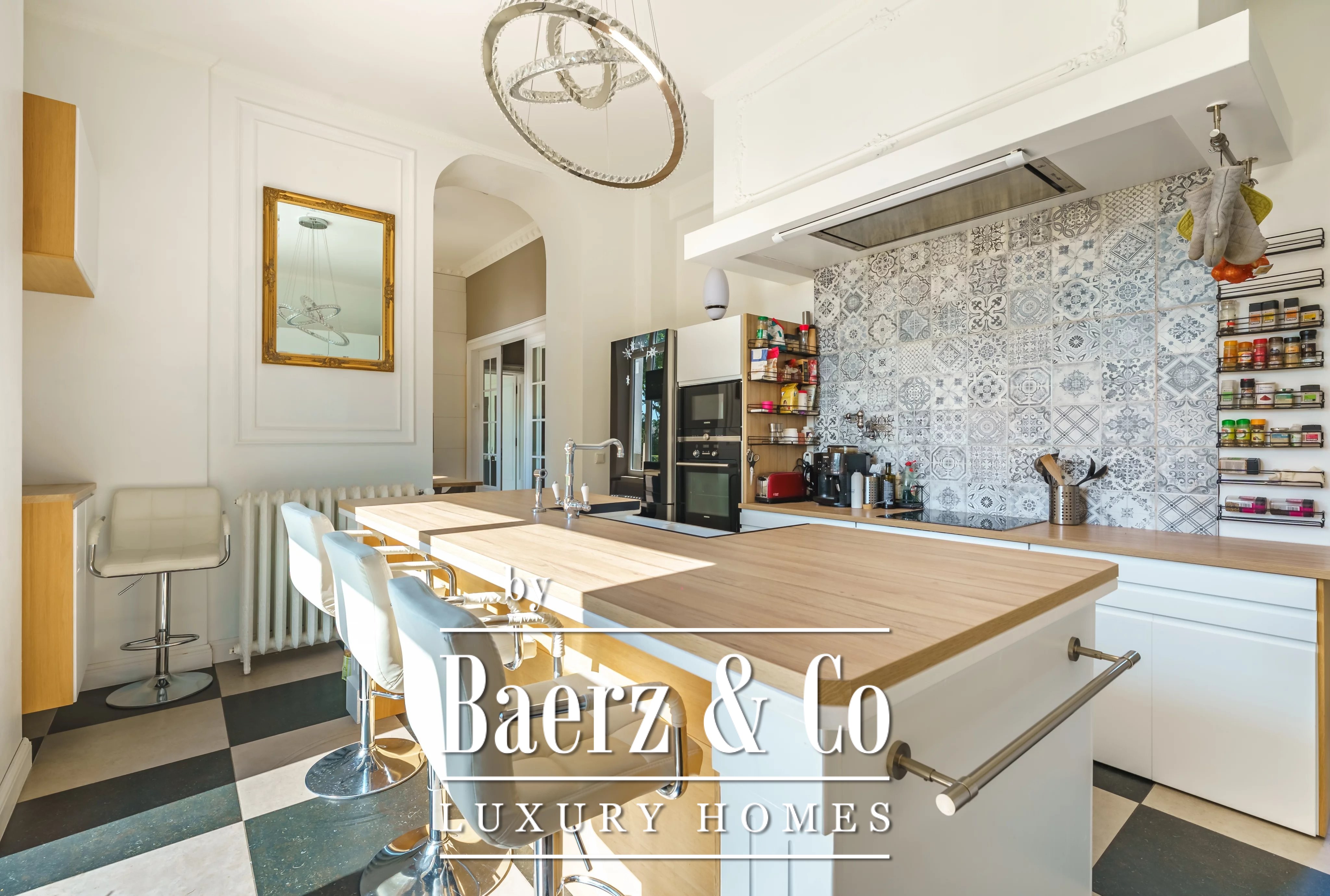 Les deux étages supérieurs abritent cinq chambres et trois salles de bains agencées avec soin, dont une somptueuse suite parentale avec dressing et salle de bains privés. En rez-de-jardin, le sous-sol propose des espaces fonctionnels : stockage pour bois, cave à vin, atelier, buanderie et garage individuel.
