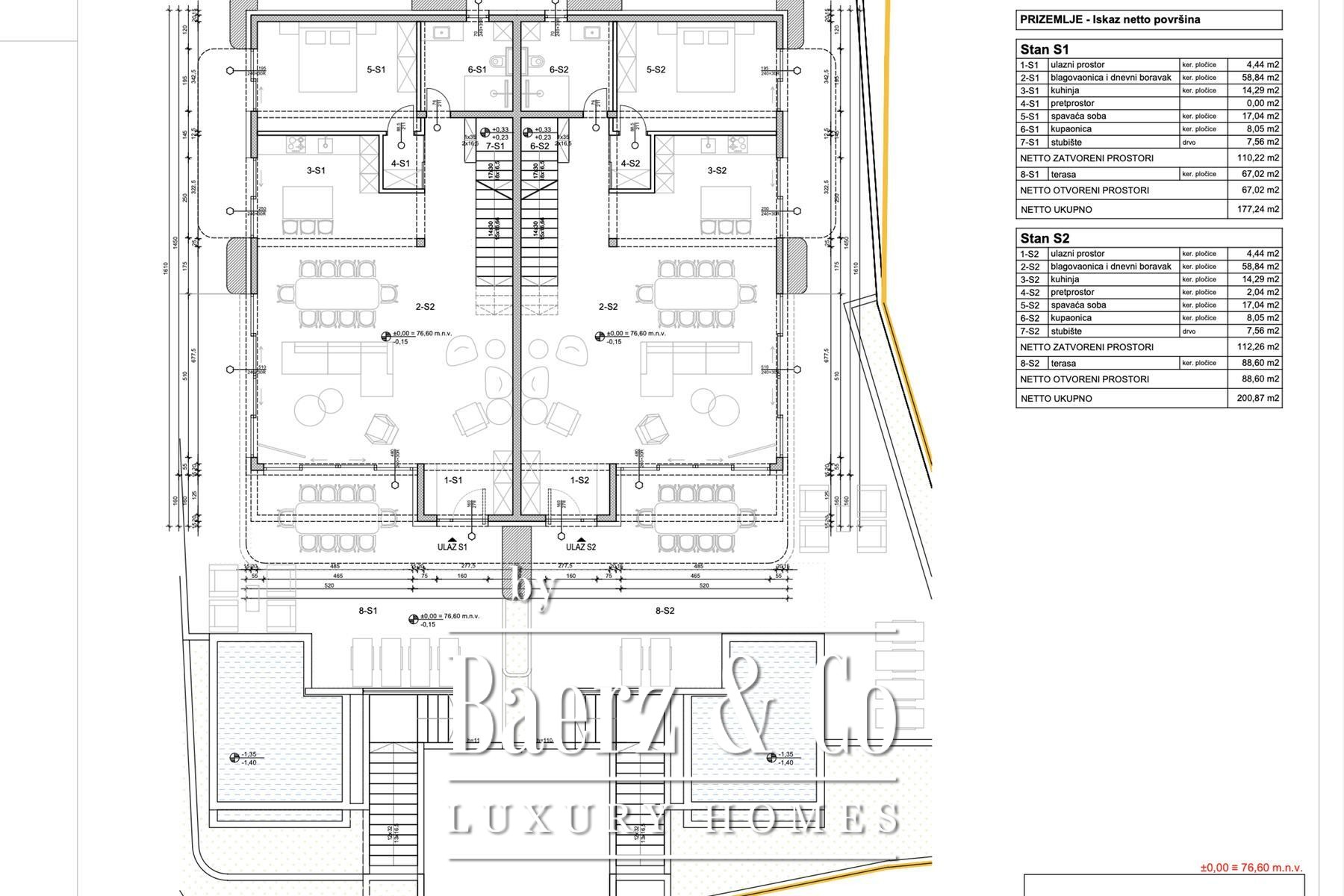 La villa jumelée de Primošten s’intègre au sein d’un complexe minutieusement pensé et offre 473,04 m² d’espace de vie répartis sur trois niveaux. Cette résidence conjugue fonctionnalité et pureté architecturale, disposant de quatre chambres et quatre salles de bains conçues pour faciliter le quotidien et offrir une véritable intimité. Le niveau inférieur comprend un vaste garage pouvant accueillir trois véhicules, accompagné d’un espace de rangement, d’une buanderie et d’installations dédiées à la piscine, illustrant une attention discrète portée à la praticité.