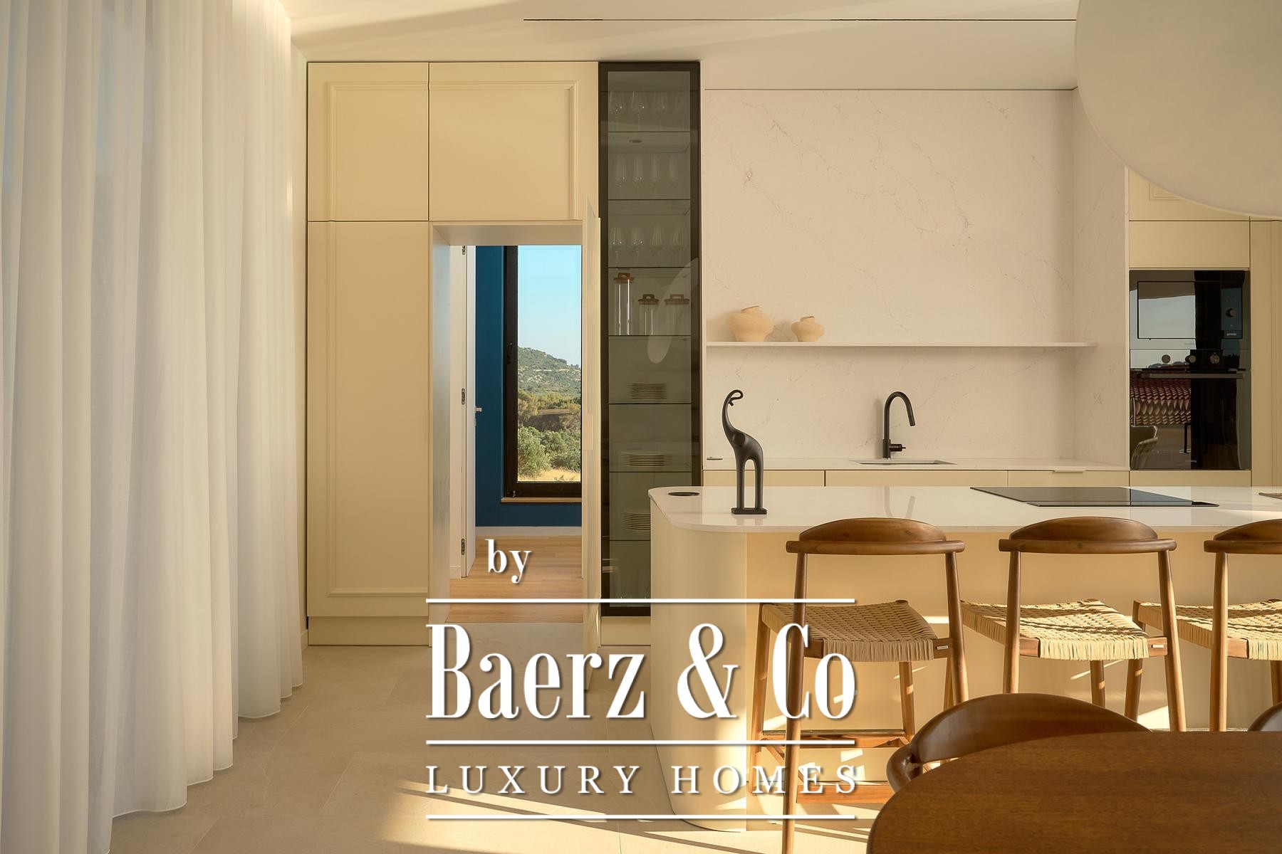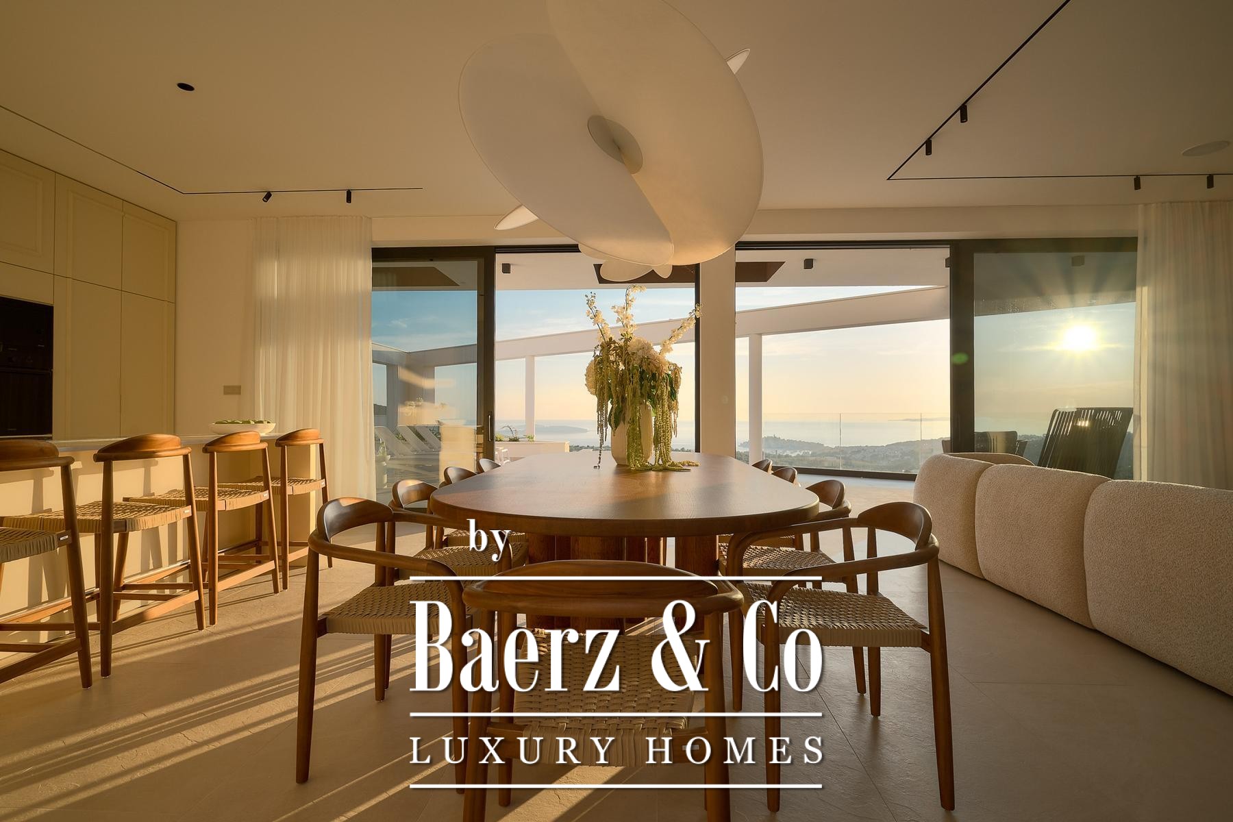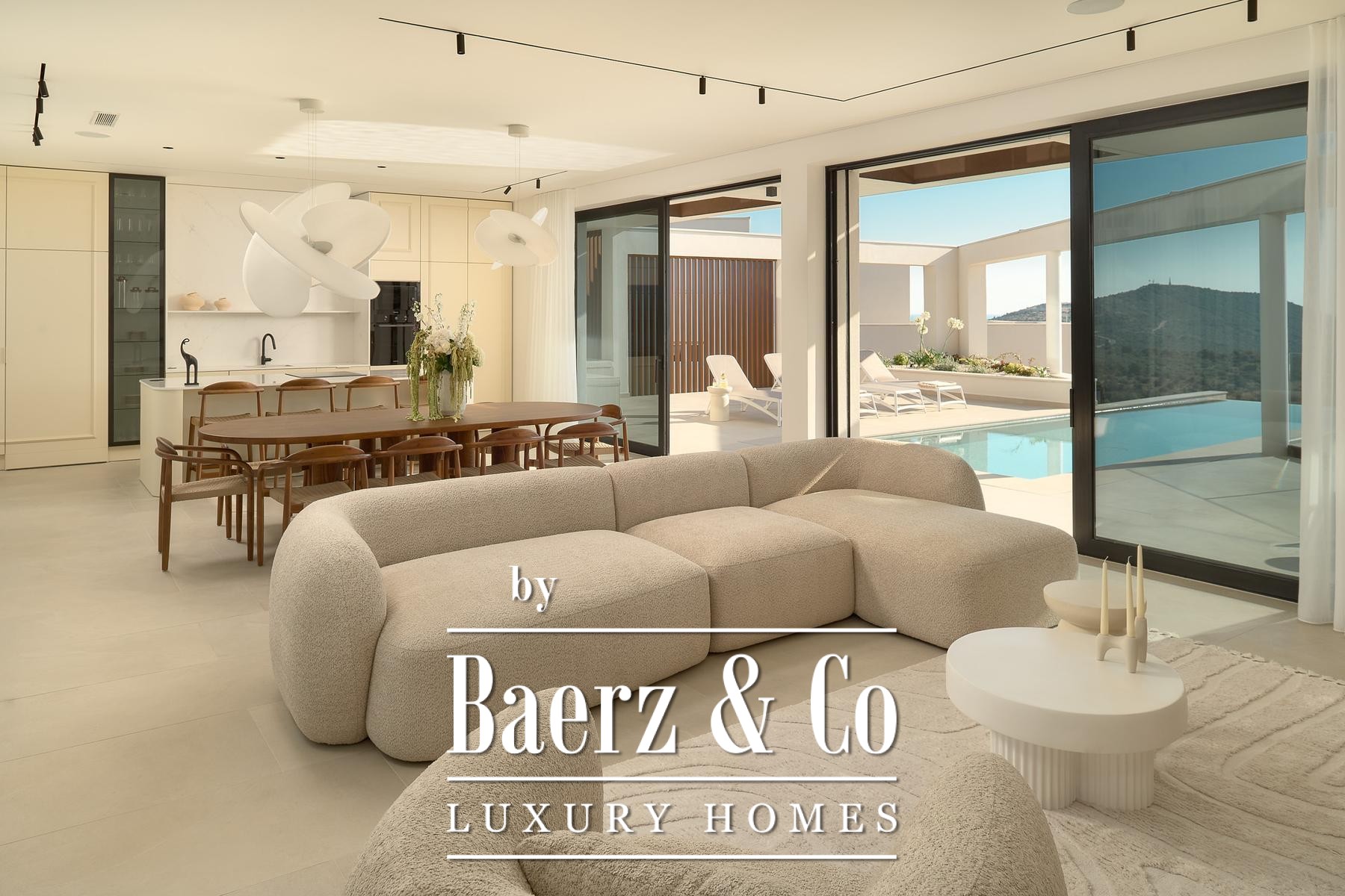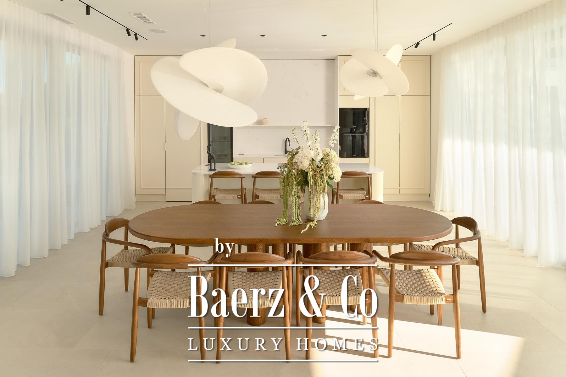 Le rez-de-chaussée accueille un espace séjour et salle à manger lumineux en plan ouvert, parfaitement raccordé à une cuisine moderne, le tout baigné de lumière naturelle grâce à des baies vitrées du sol au plafond, favorisant une continuité fluide entre intérieur et extérieur. Les terrasses spacieuses sont propices à la détente et aux réceptions, comprenant une cuisine d’été et un espace barbecue attenants à la piscine à débordement et sa plateforme-solarium.