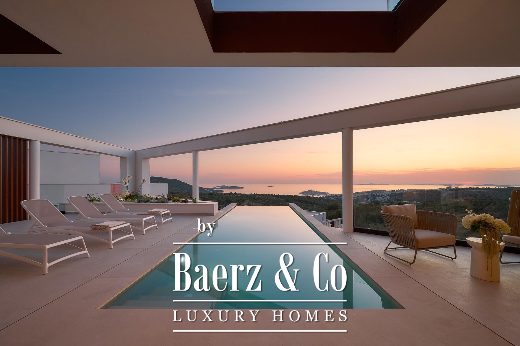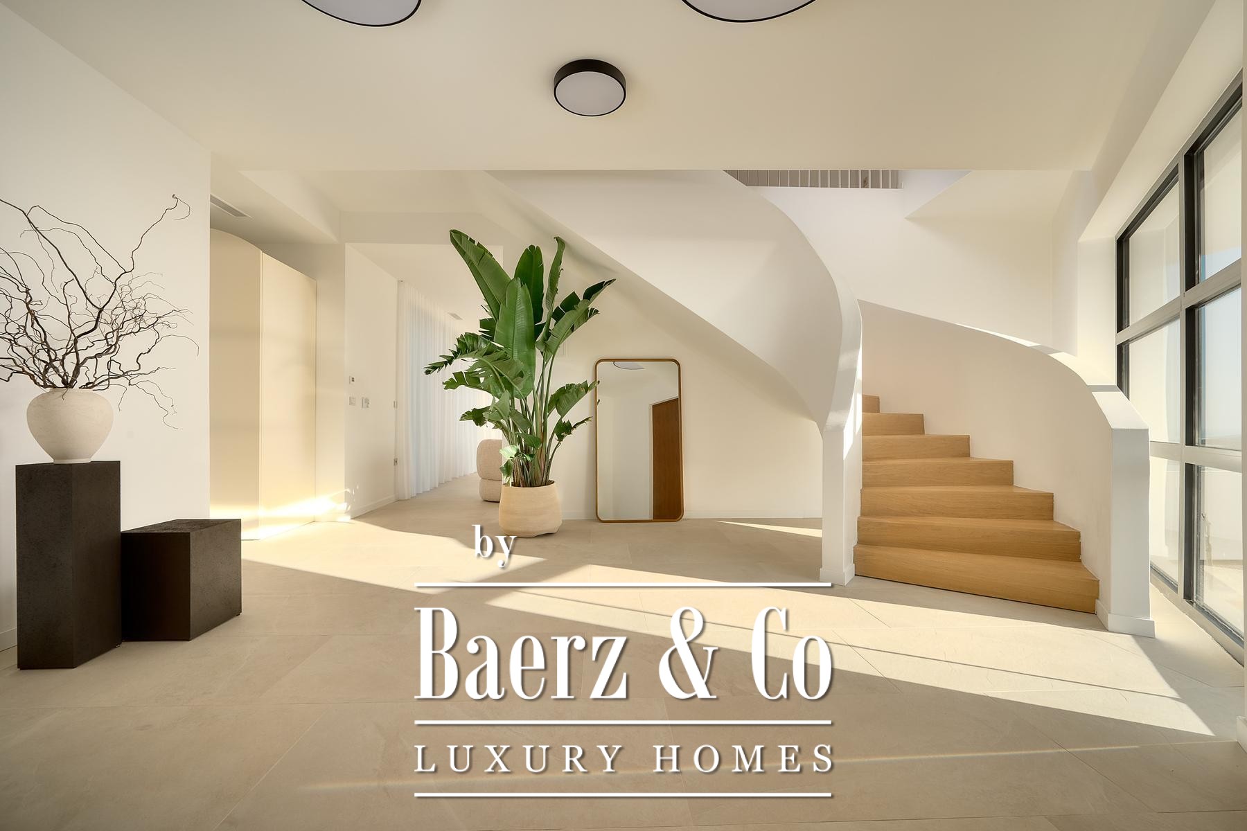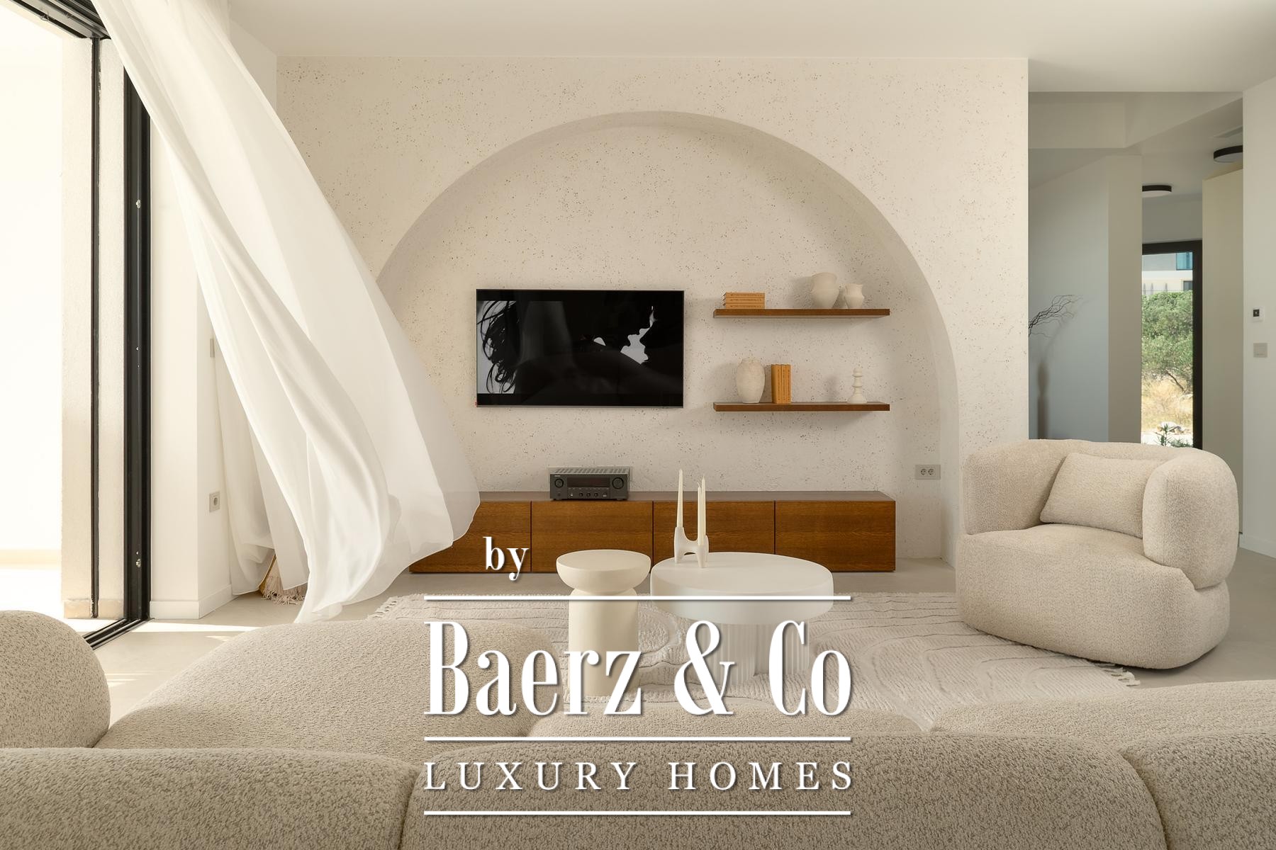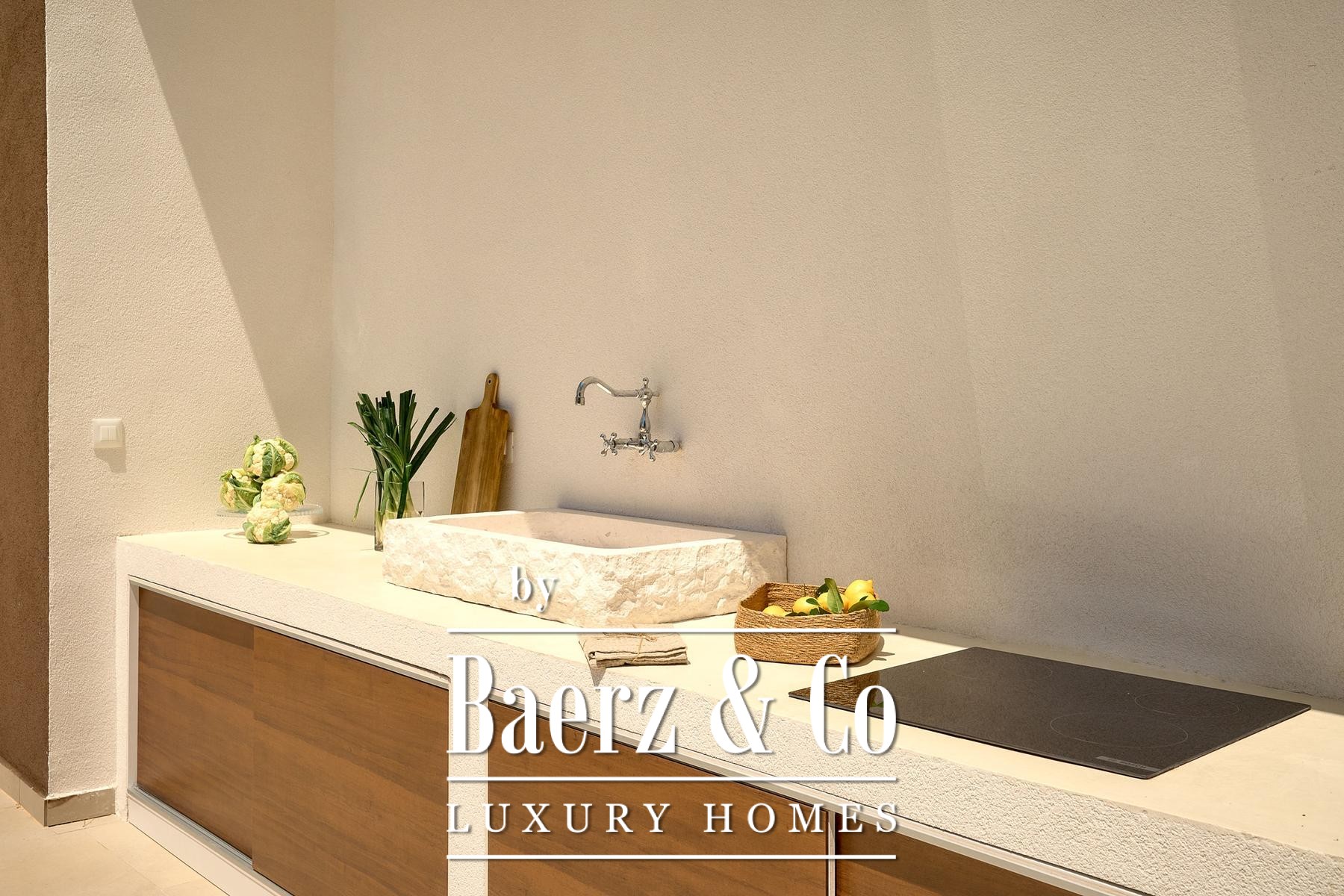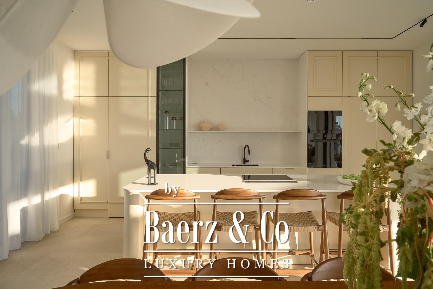 Le rez-de-chaussée accueille un espace séjour et salle à manger lumineux en plan ouvert, parfaitement raccordé à une cuisine moderne, le tout baigné de lumière naturelle grâce à des baies vitrées du sol au plafond, favorisant une continuité fluide entre intérieur et extérieur. Les terrasses spacieuses sont propices à la détente et aux réceptions, comprenant une cuisine d’été et un espace barbecue attenants à la piscine à débordement et sa plateforme-solarium.