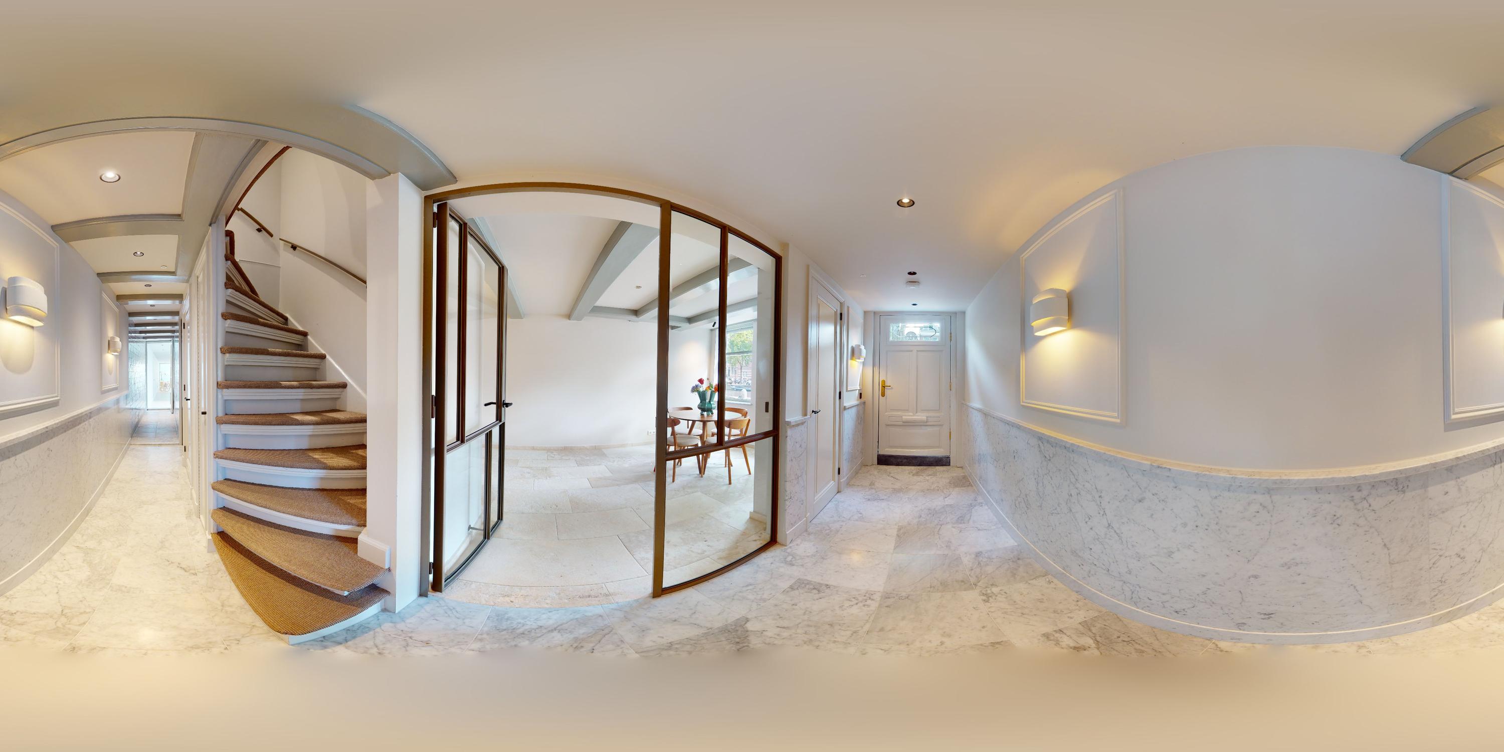 Vanuit de prachtige entree aan de gracht, bereikt u de woning. De hal en gang met marmeren vloer en lambrisering geeft toegang tot alle vertrekken op deze verdieping. De prachtige wandverlichting en muurdecoratie geven de entree bijzonder veel sfeer.