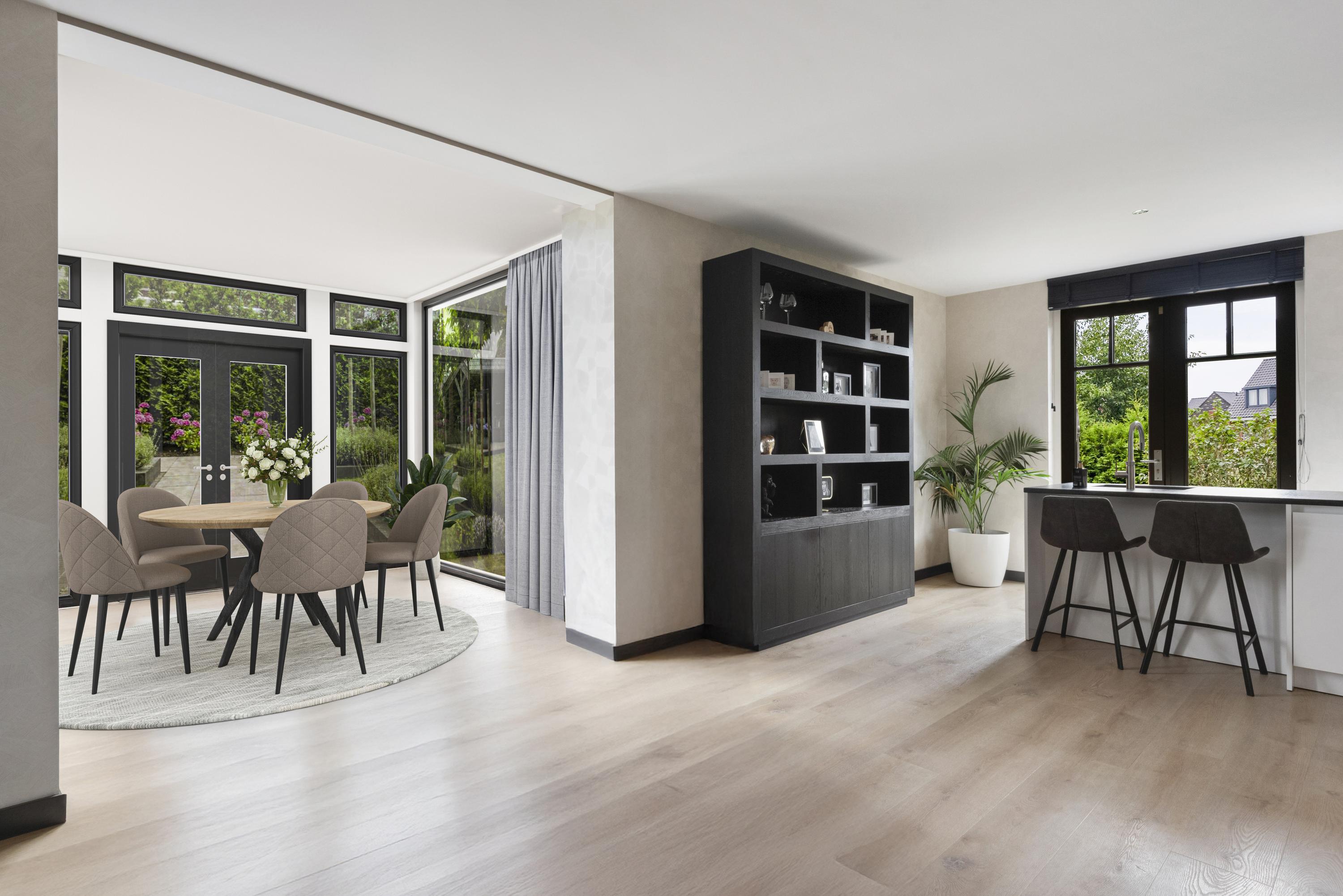 De ruime woon- en eetkamer biedt plek voor het hele gezin, met een op maat gemaakte cinewall en sfeervolle HR-gashaard voor extra warmte en gezelligheid.