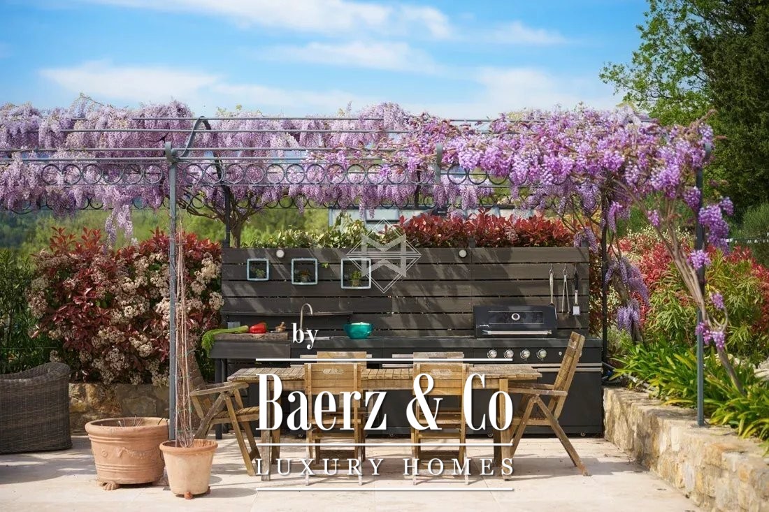 Deze bastide in Tourrettes is prachtig gelegen nabij het oude dorp en biedt in een serene omgeving uitzicht op zowel de bergen als het dorp. De bastide van 350 m² verwelkomt u met een royale entreehal die toegang geeft tot de woon- en eetkamer, waar natuursteen, lichtinval en verhoudingen zorgen voor een gevoel van tijdloze kwaliteit. Vijf slaapkamers beschikken elk over een eigen en-suite douchekamer, terwijl een tv-lounge en een kantoor of bibliotheek ruimte bieden voor rust en contemplatie.