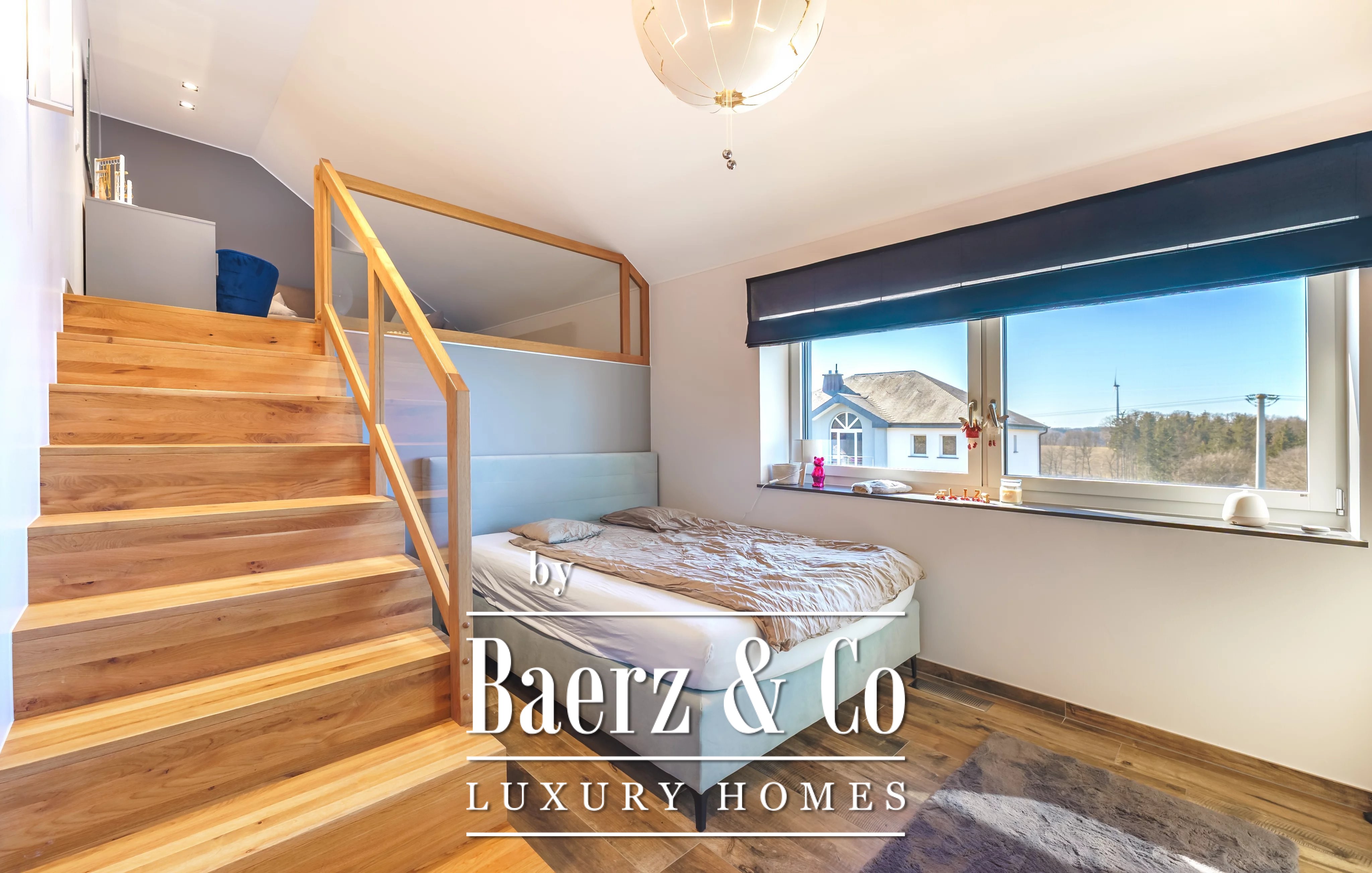 На верхнем этаже находится ещё одна гостиная, которая создаёт приватную атмосферу для семейных встреч. В доме пять спален и четыре ванные комнаты; в том числе мастер-сьют с гардеробной и собственной душевой, а также гостевая спальня с индивидуальным санузлом. Прачечная размещена отдельно, что обеспечивает дополнительный комфорт на каждый день.